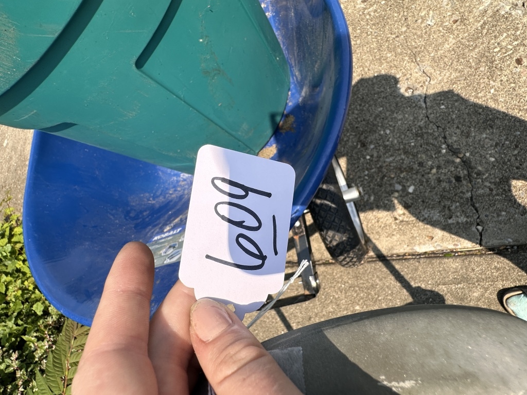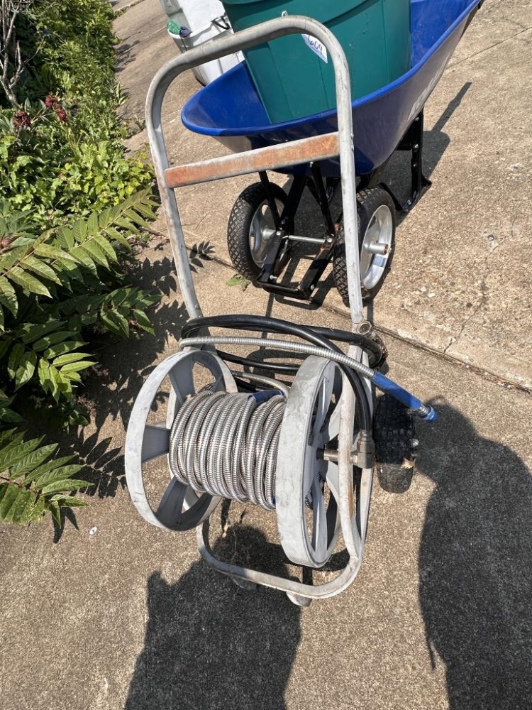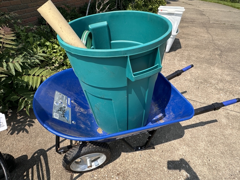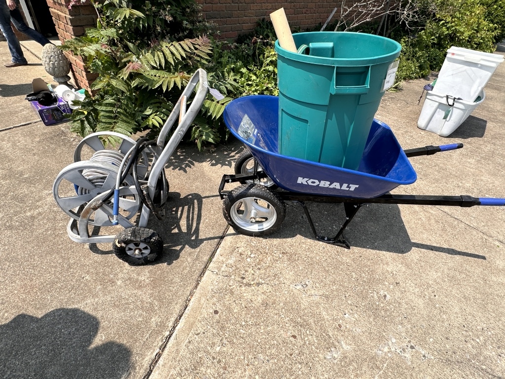 WHEEL BARROW, TRASH CAN, GARDEN HOSE