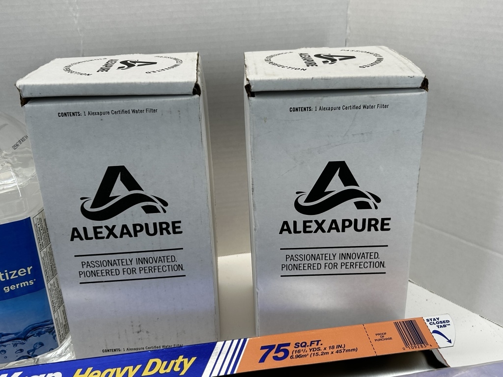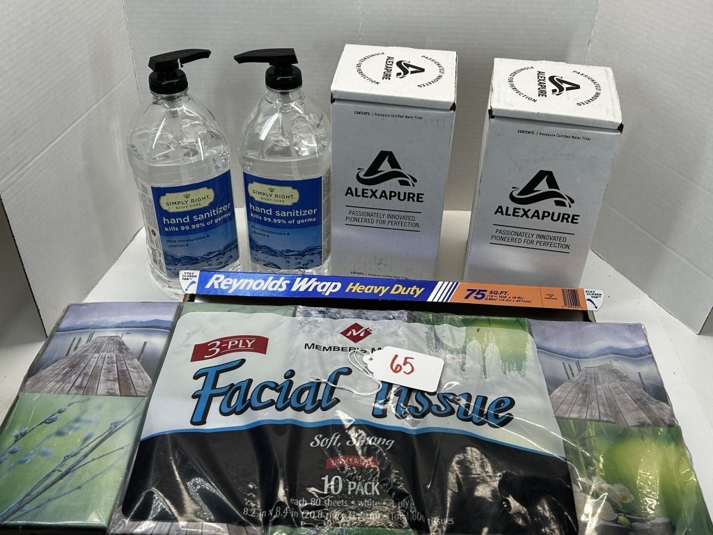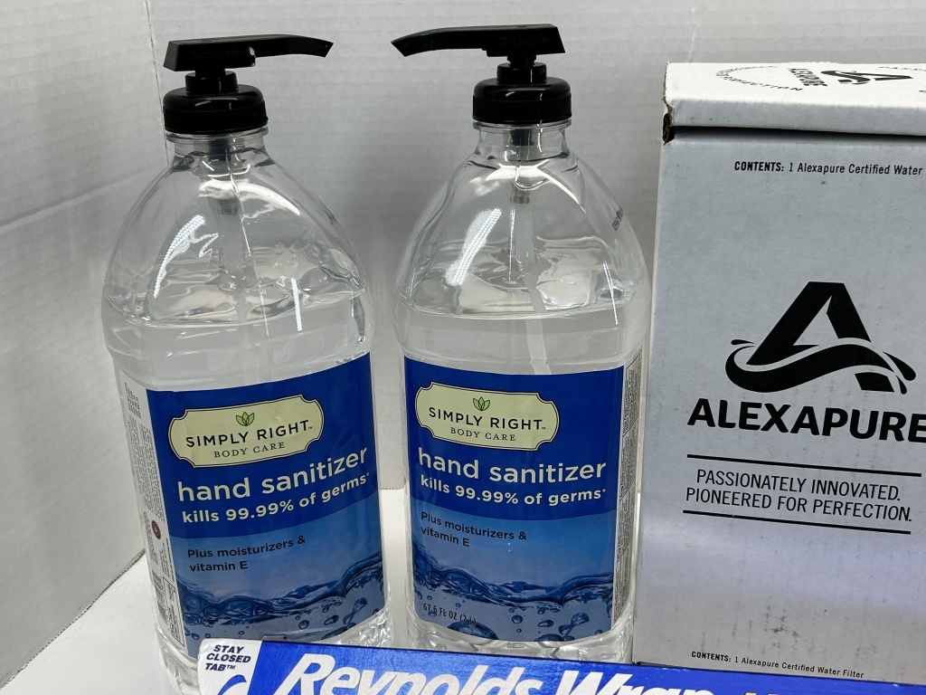 2 HAND SANITIZER BOTTLES WITH PUMP, REYNOLDS WRAP, BIG PACK OF TISSUES, 2 CERTIFIED WATER FILTERS