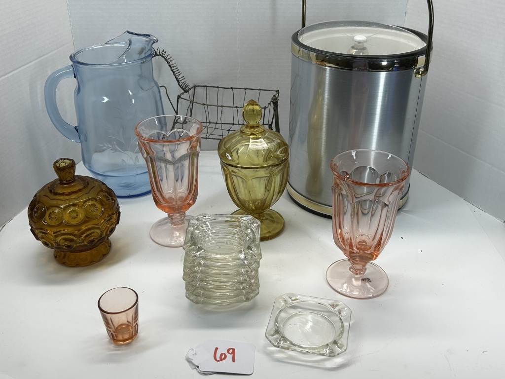 SMALL GLASSES, PLATES, ICE BOX WITH HANDLE