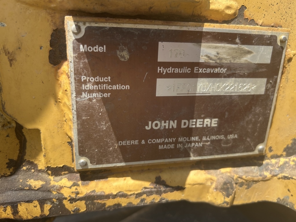 JOHN DEERE 17D MINI EXCAVATOR INCLUDES BUCKET FRONT BLADE HYDROLLIC HOOKUP AT BUCKET 2413 HOURS VIN NO 1FF017DXHCK221626