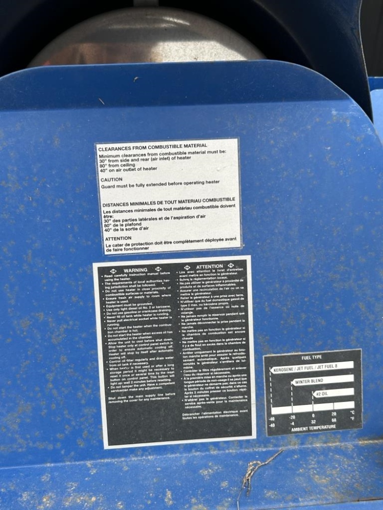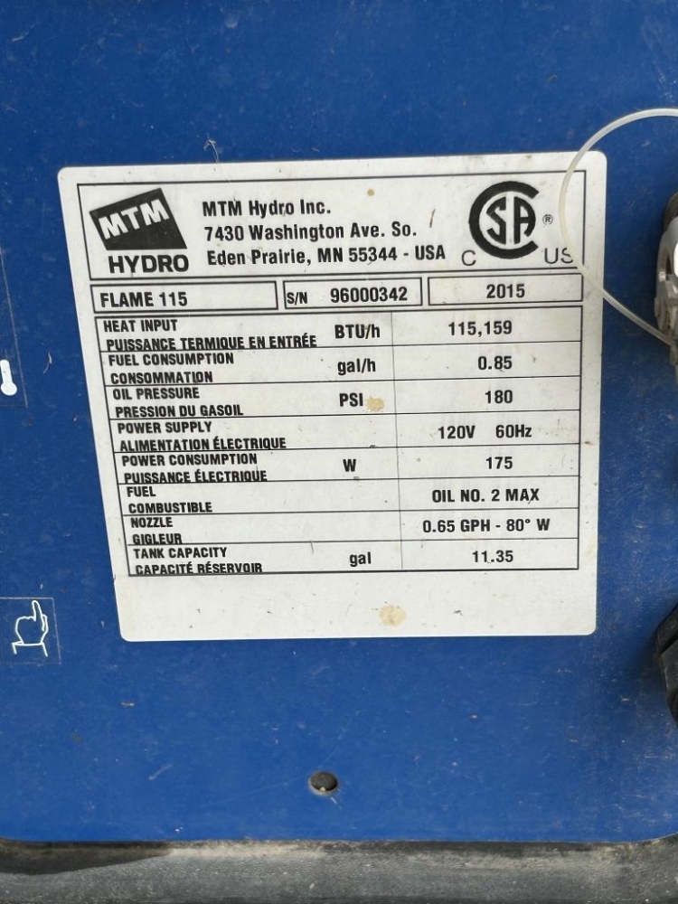 FUEL TYPE KEROSENE, JET FUEL, JET FUEL 8, SN 96000342, HEAT INPUT 115, 159. FUEL CONSUMPTION 0.85, OIL PRESSURE 180, POWER SUPPLY 120V 60 HZ, POWER CONSUMPTION 175, FUEL OIL NO 2 MAX, NOZZLE 0.65 GPH-80 DEGREES