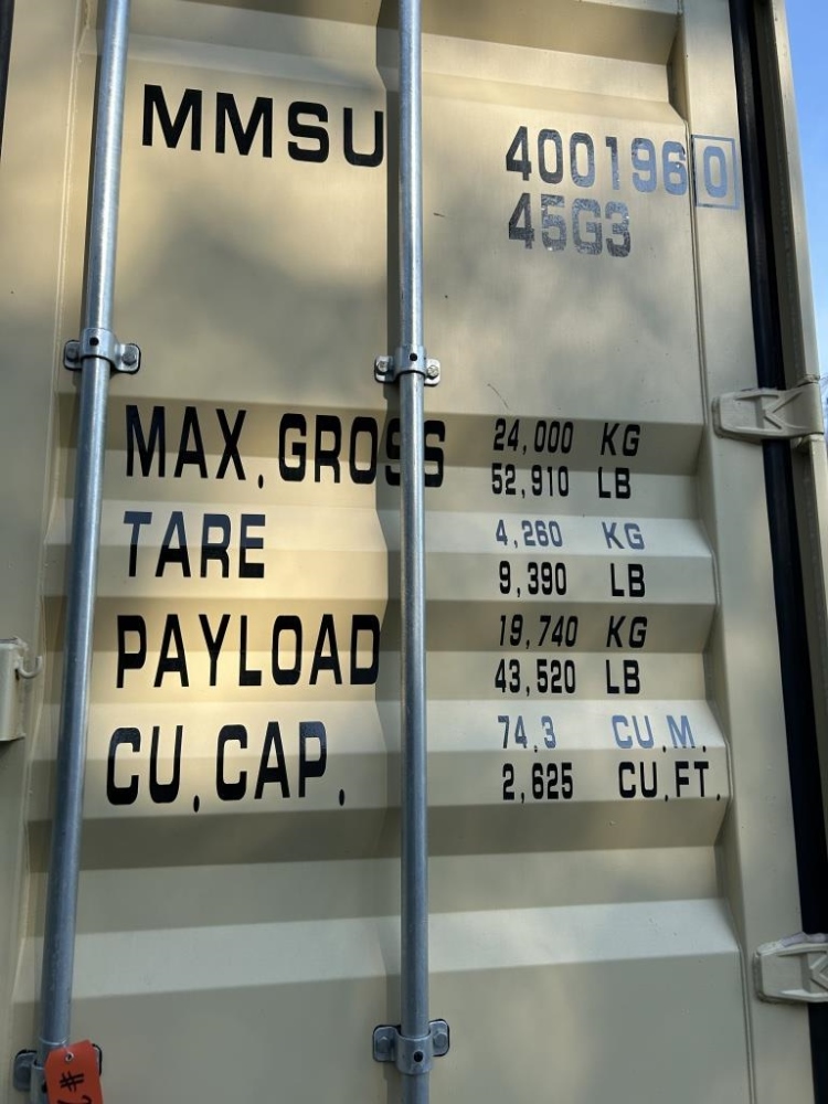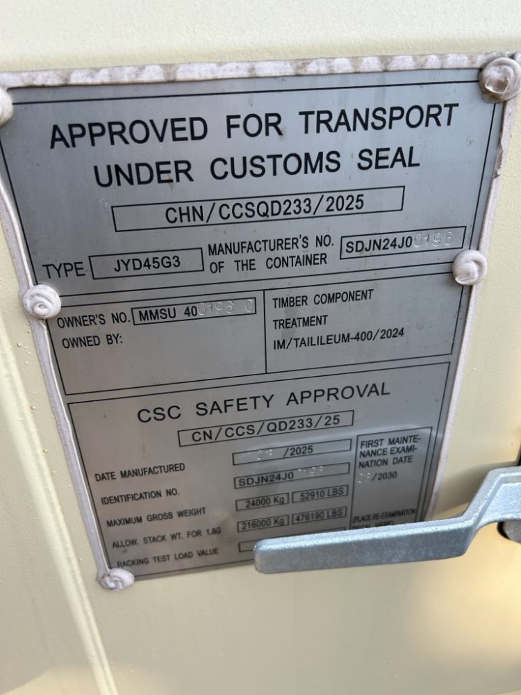 NEW MMSU 4001960 45G3 MAX GROSS 24000 KG 52910 LB TARE 4260 KG 9390 LB PAYLOAD 19740 KG 43520 LB TYPE JYD45G3 MANUFACTURERS NO OF CONTAINER SDJN24J0 0196