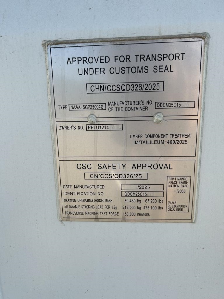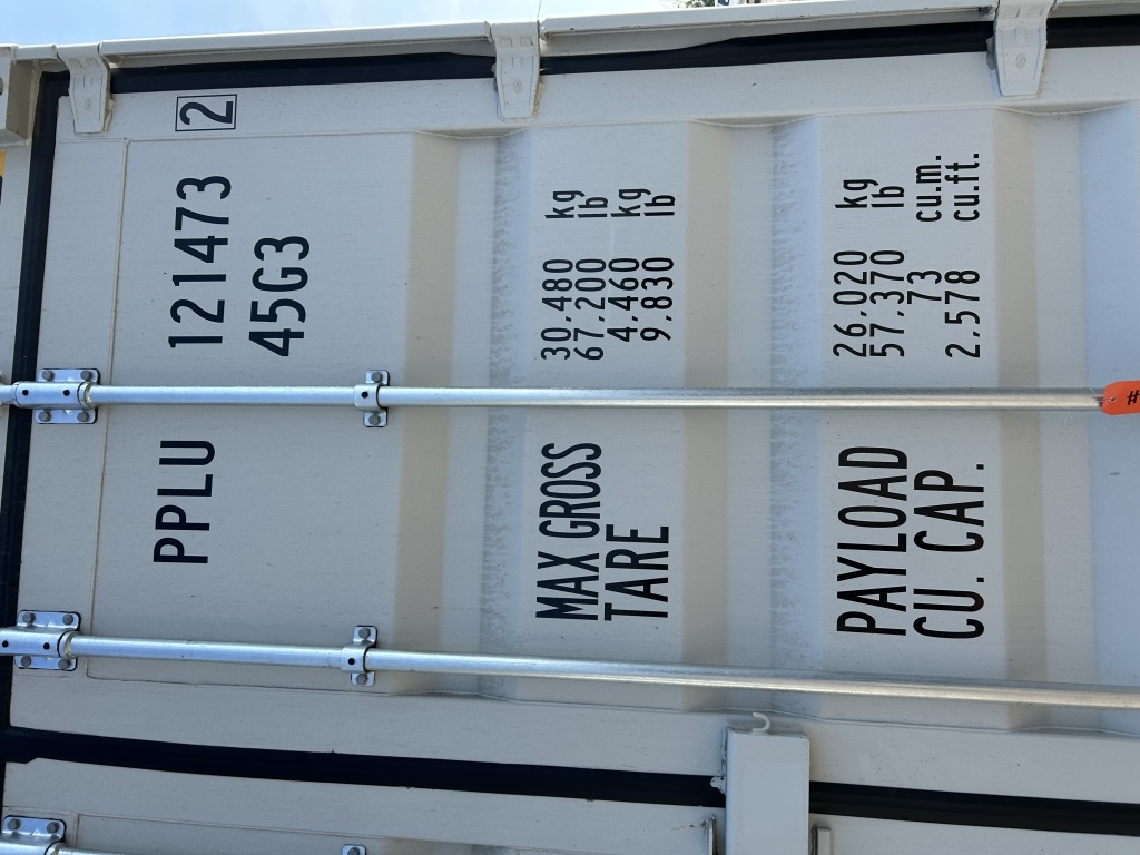 NEW PPLU 121473 2 45G3 MAX GROSS 30480 KG 67200 LB TARE 4460 KG 9830 LB PAYLOAD 26020 KG 57370 LB TYPE 1AAA SCP25004G MANUFACTURERS NO OF CONTAINER QDCM25C15 675