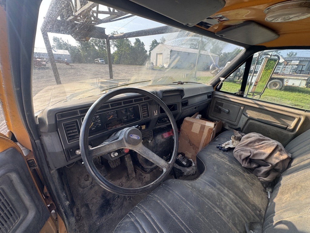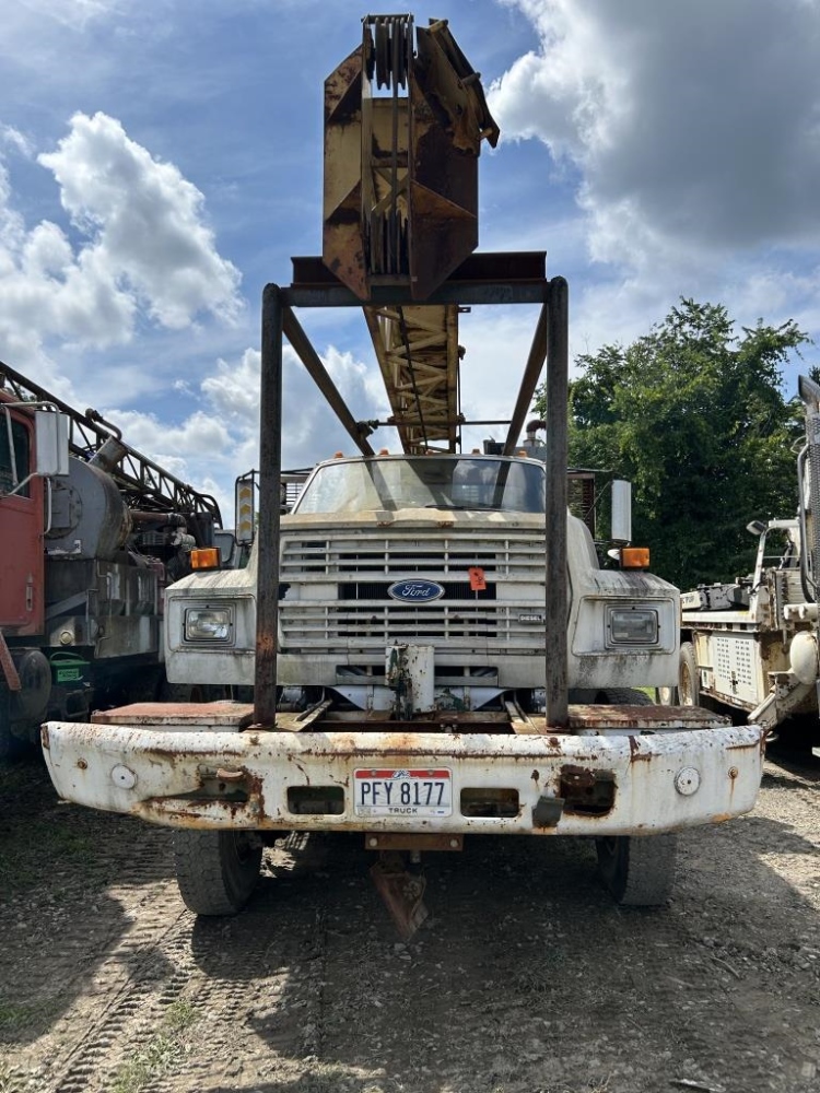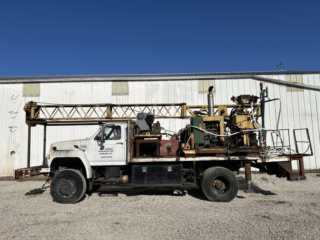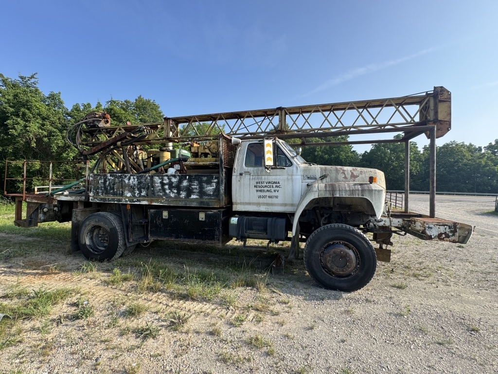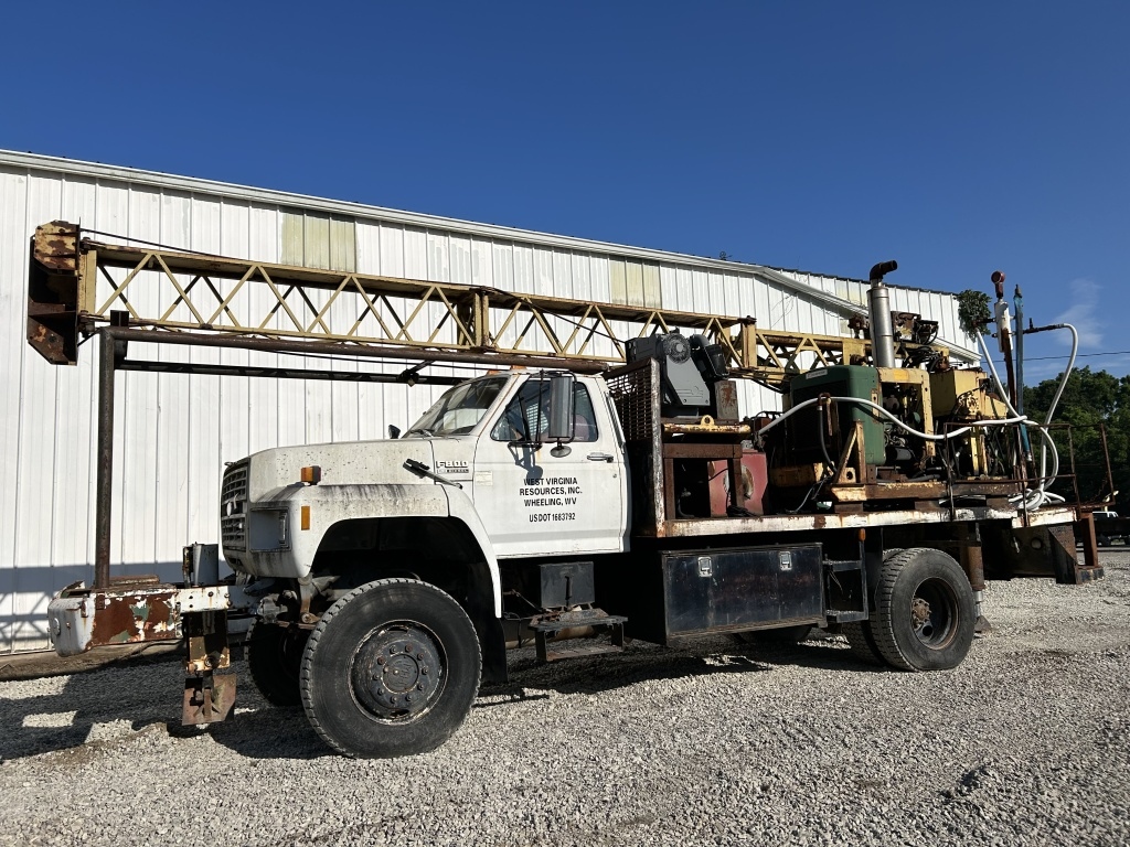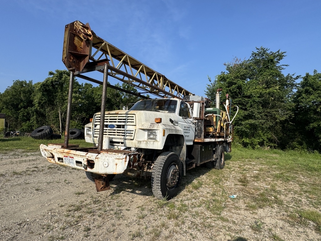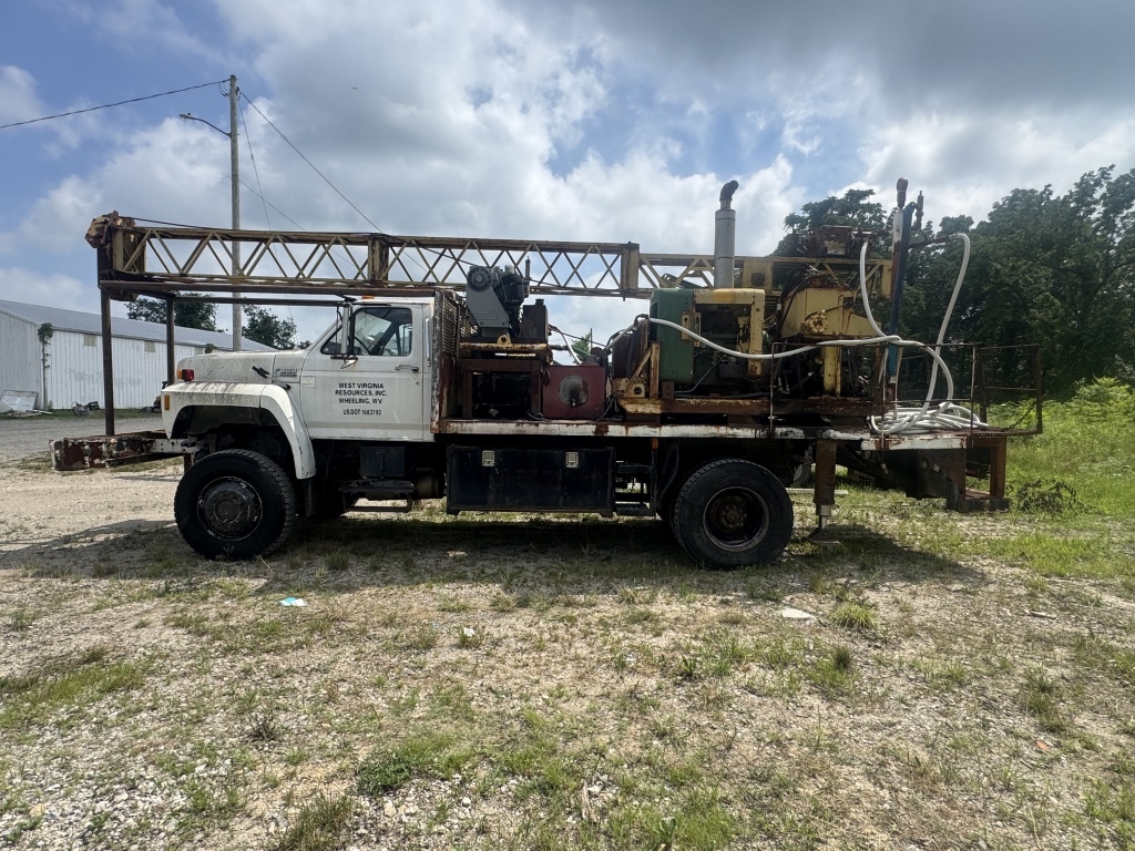 1990 FORD F800 DIESEL DRILLING RIG, WHITE CAB MODEL:F800 VIN#1FDXK84A7MVA11530, 499114 MILES ON TRUCK, DETROIT ENGINE ON BED SET UP FOR CORE DRILLING NEW BATTERIES AND GOOD TIRES