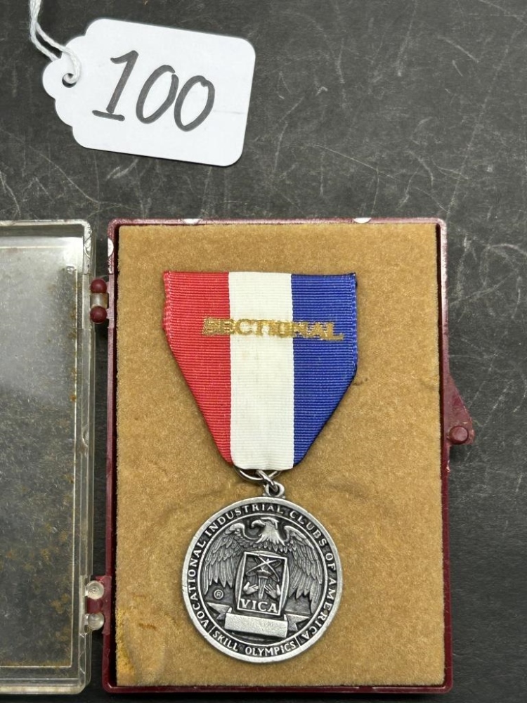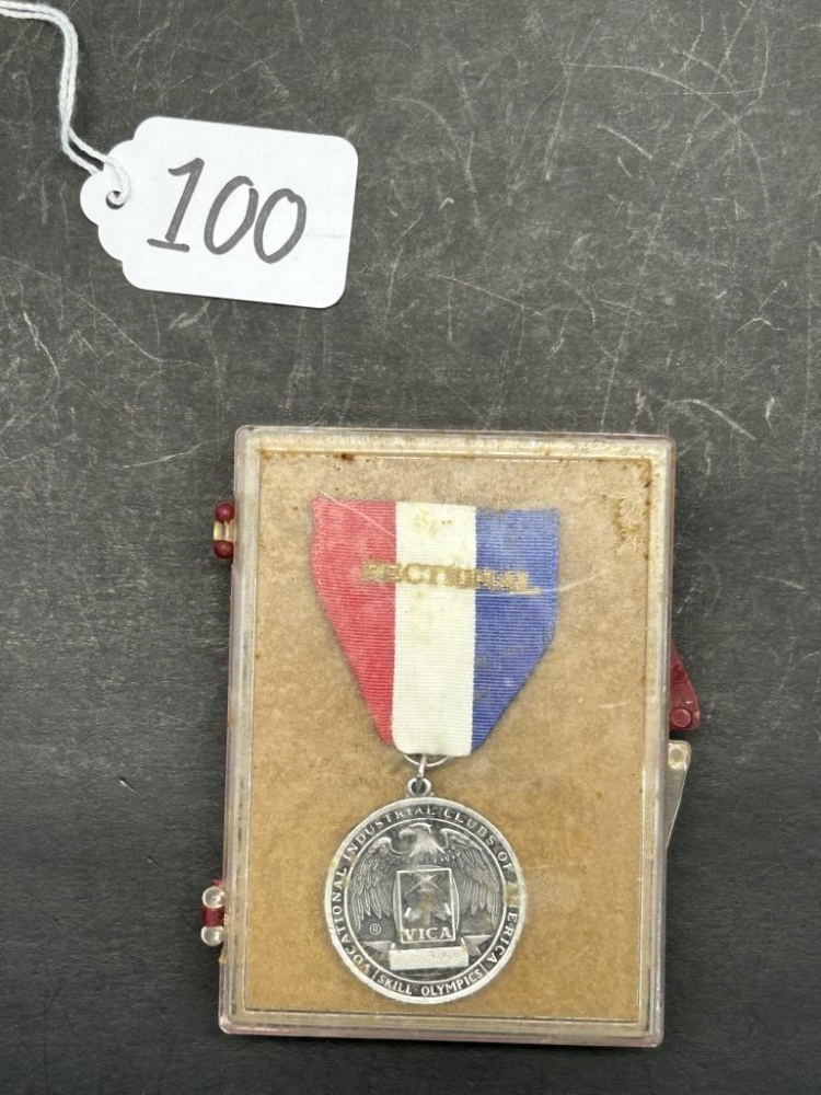 MEDAL BADGE FROM VOCATIONAL INDUSTRIAL CLUBS OF AMERICA, FEATURING A RED, WHITE, AND BLUE RIBBON, SKILL OLIMPICS