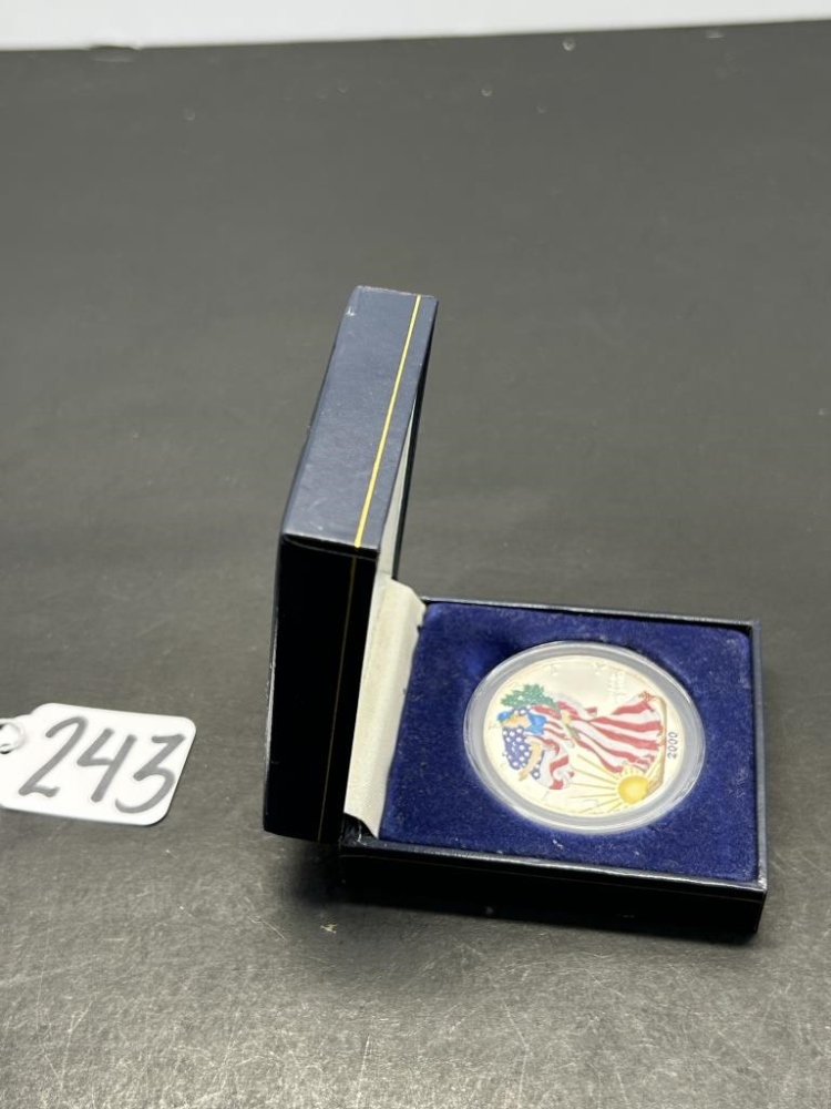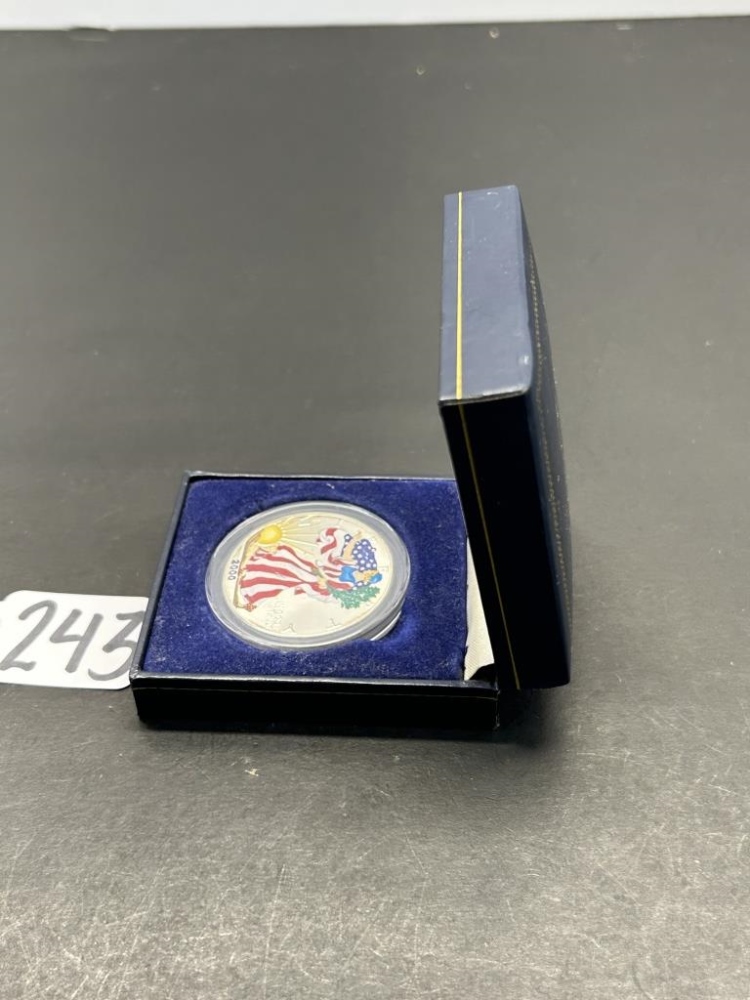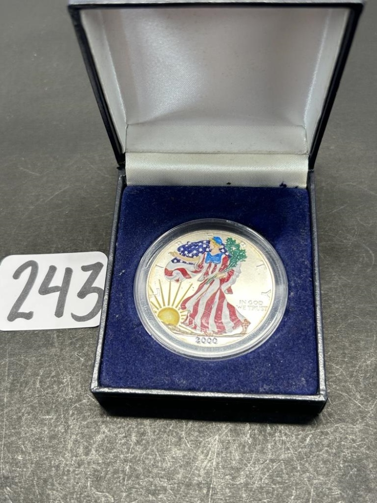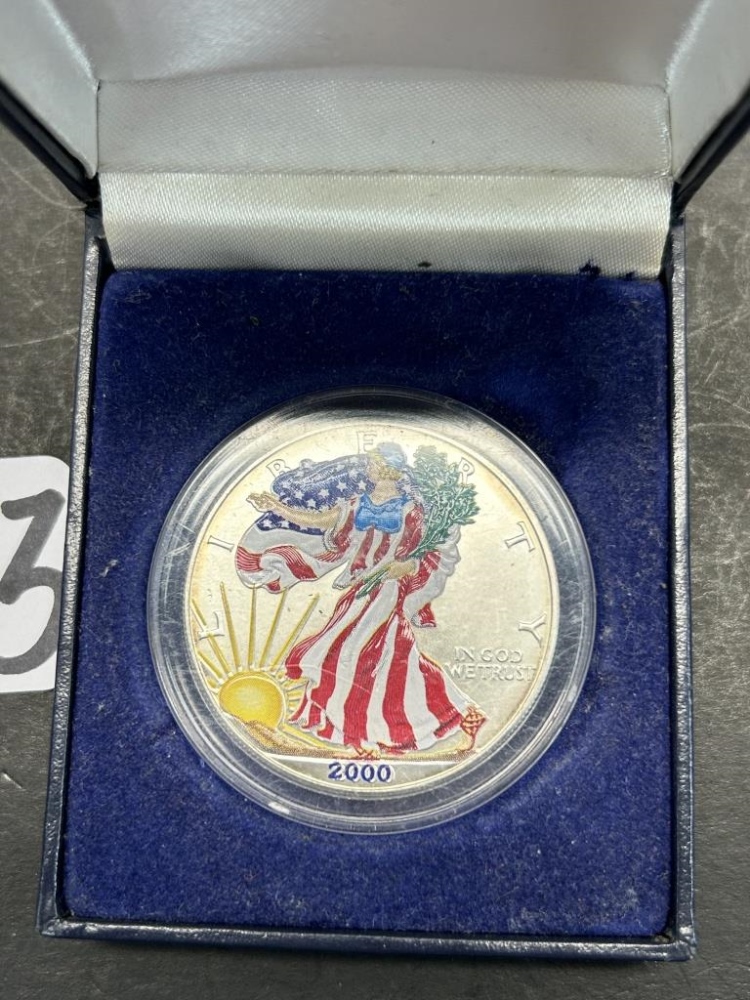 1 OZ. FINE SILVER-ONE DOLLAR 2000 MISS LIBERTY IN RED, WHITE, AND BLUE FULL COLOR