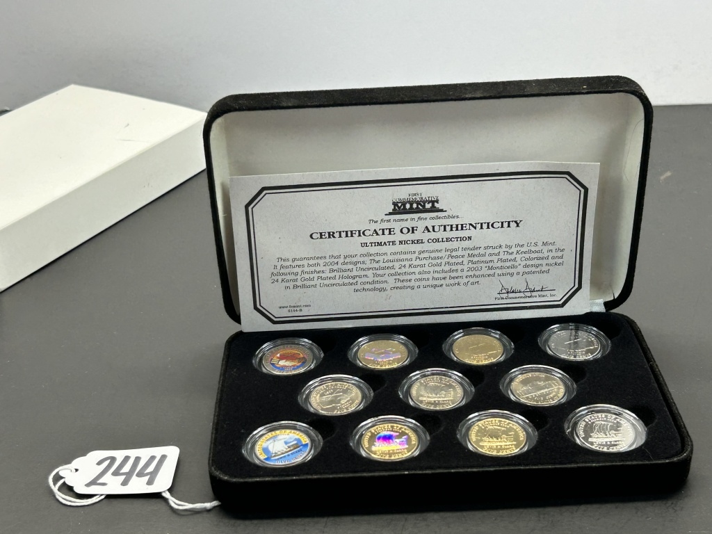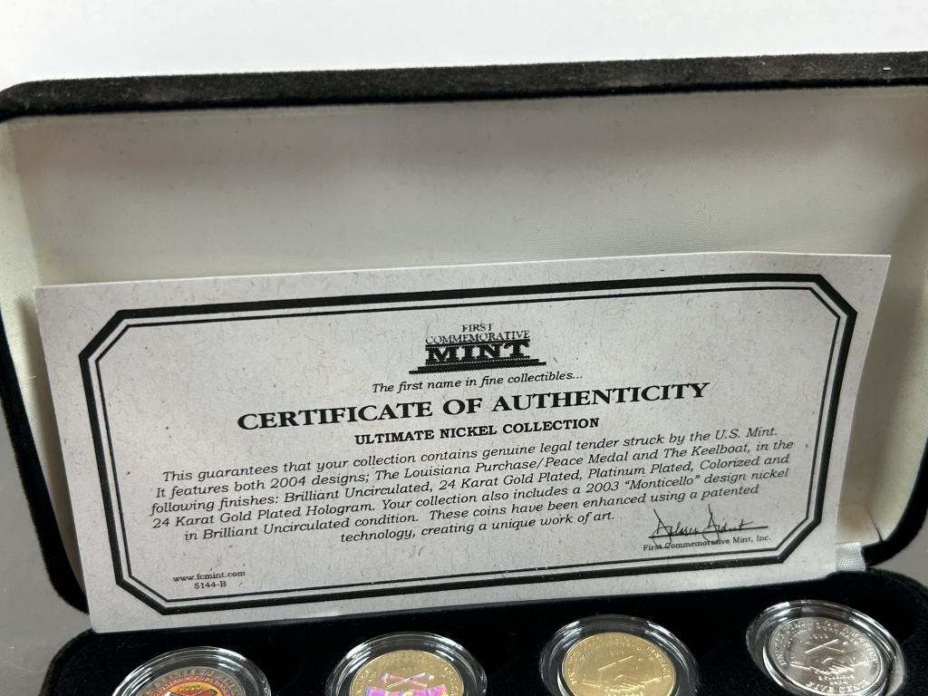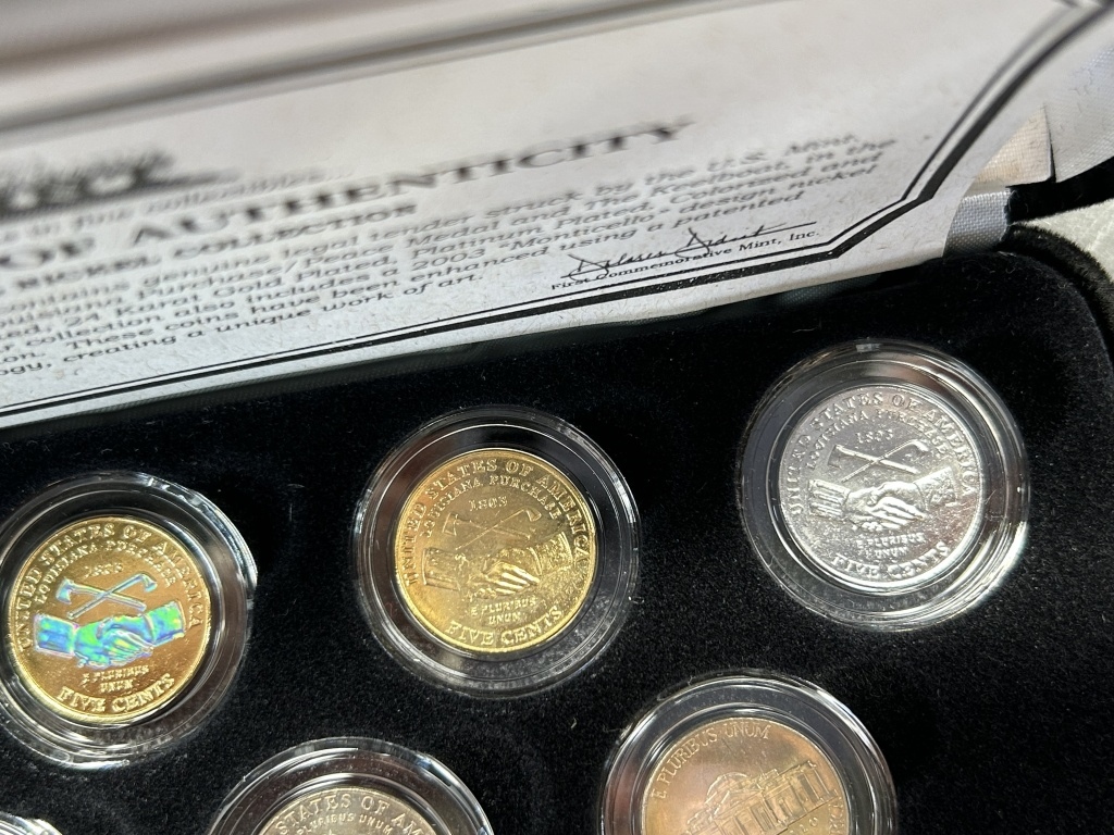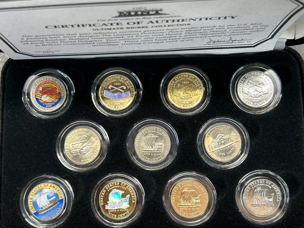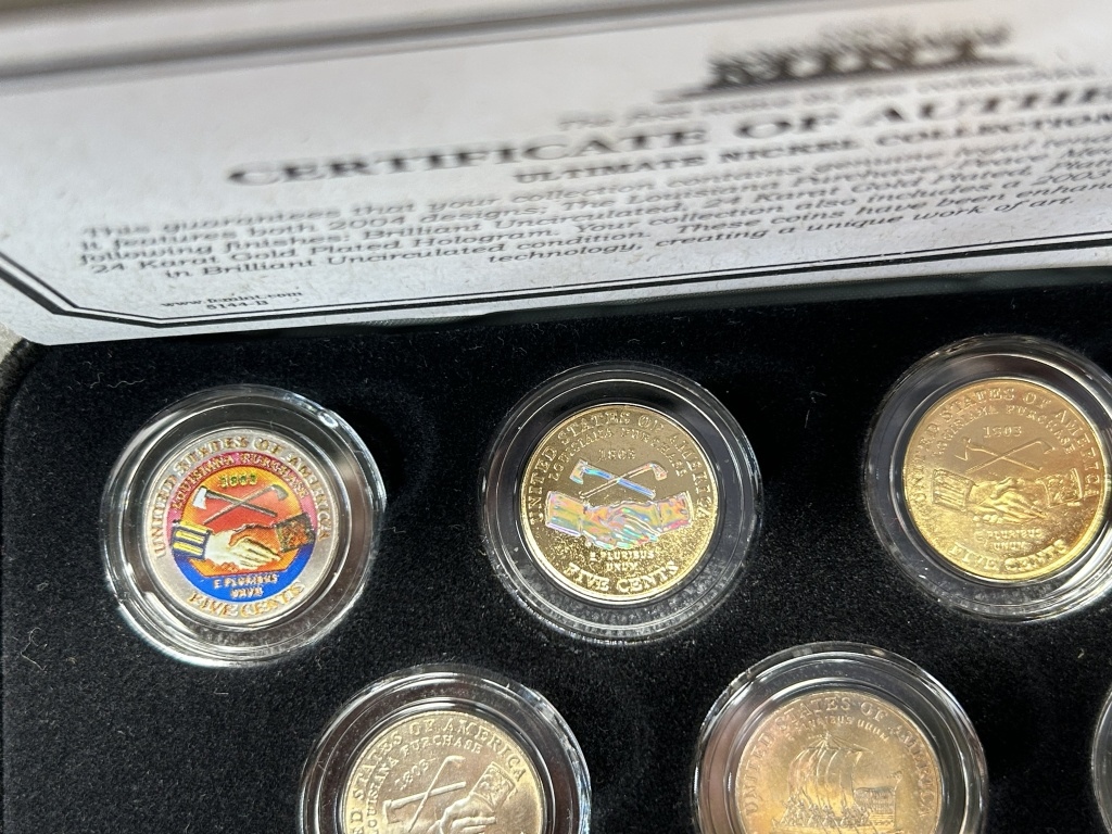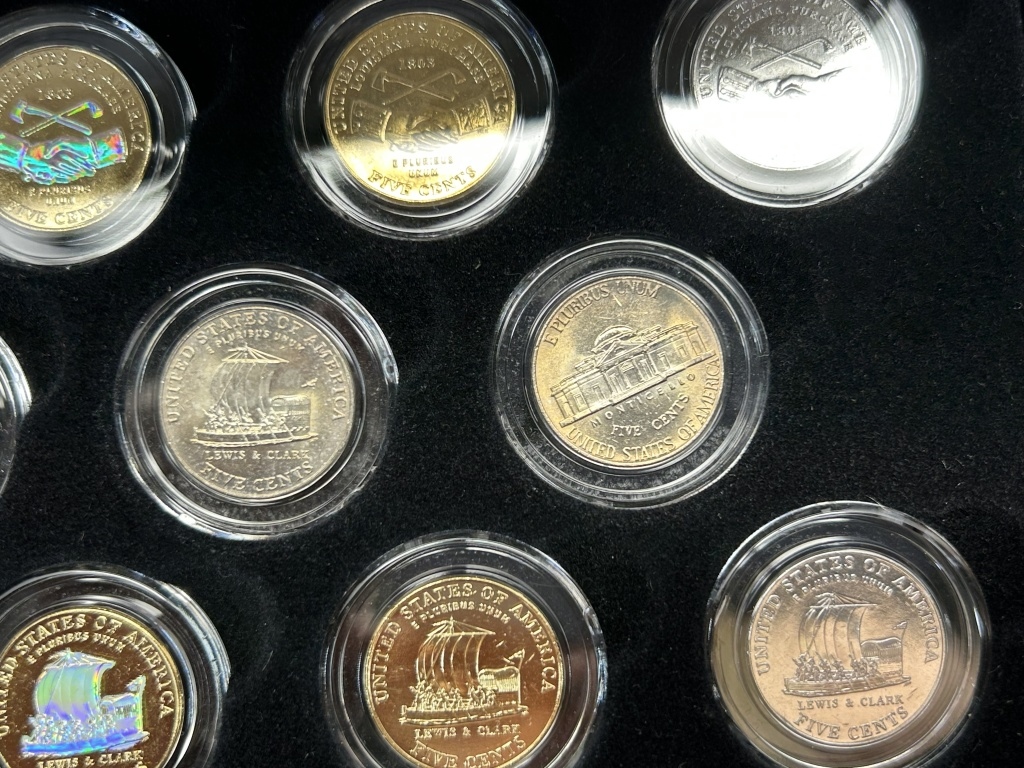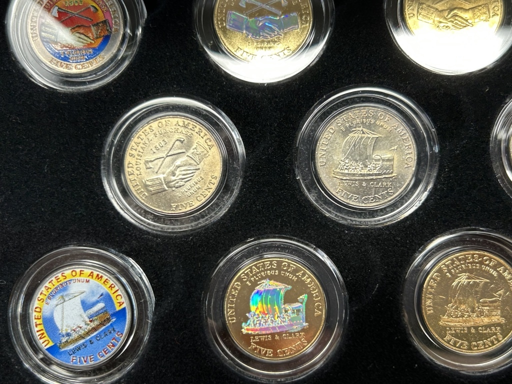 FEATURES BOTH 2004 DESIGNS; THE LOUISIANA PURCHASE/PEACE MEDAL AND THE KEELBOAT, IN THE FOLLOWING FINISHES: BRILLIANT UNCIRCULATED, 24 KARAT GOLD PLATED, PLATINUM PLATED, COLORIZED AND 24 KARAT GOLD PLATED HOLOGRAM,