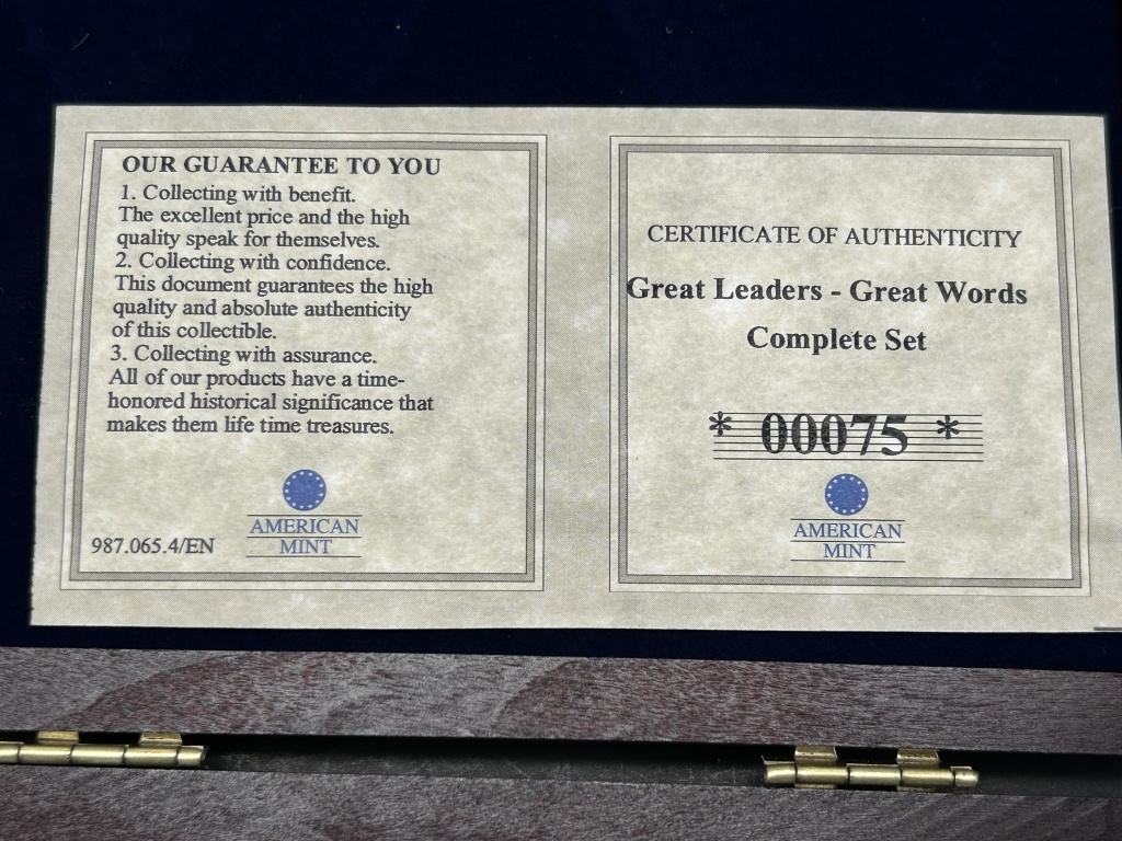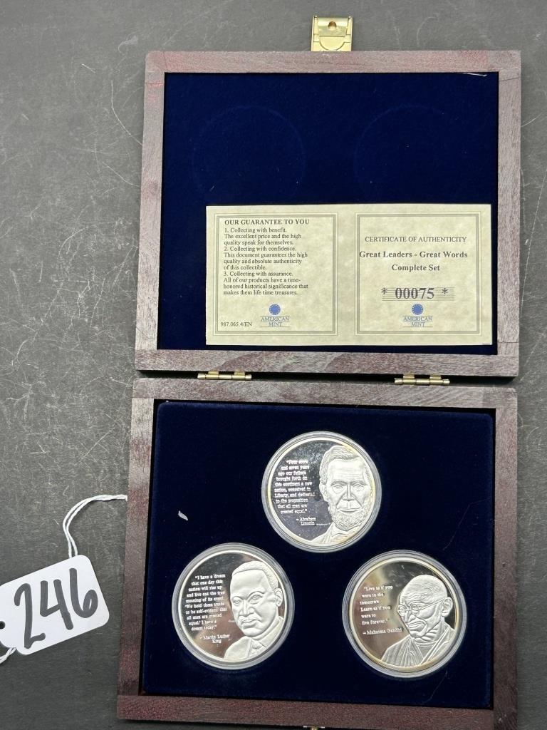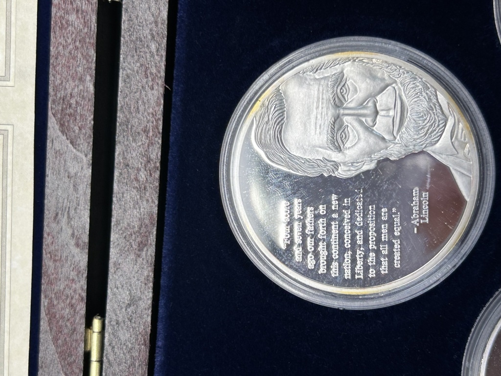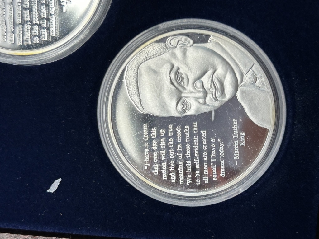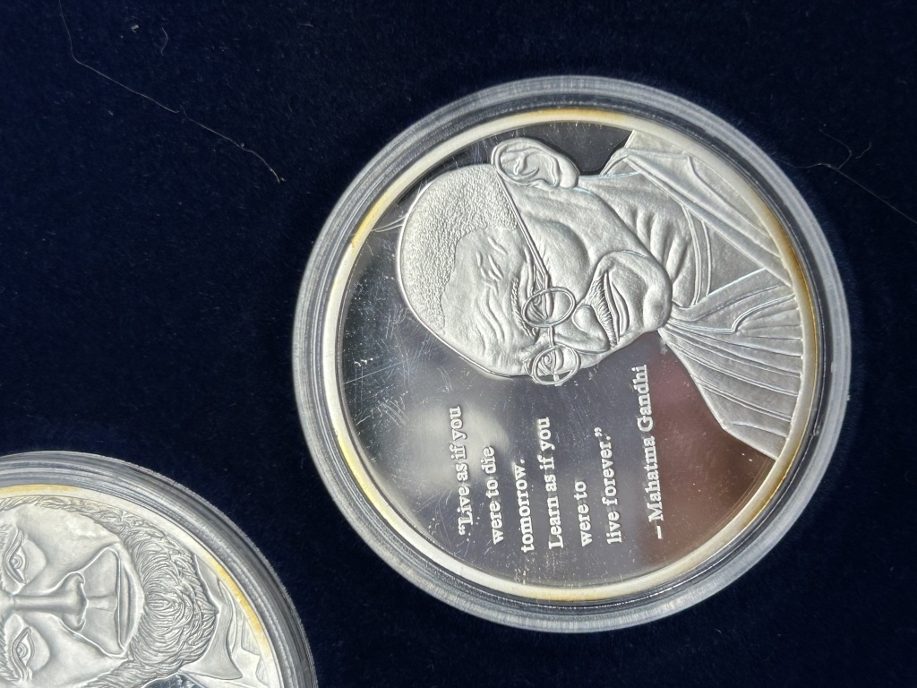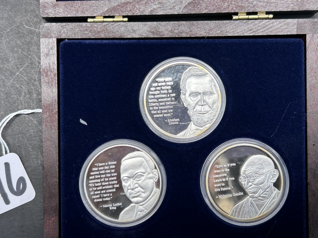 FEATURING ABRAHAM LINCOLN, MAHATMA GANDHI, MARTIN LUTHER KING, SILVER PLATED, COMPLETE SET WITH CERTIFICATE OF AUTHENTICITY