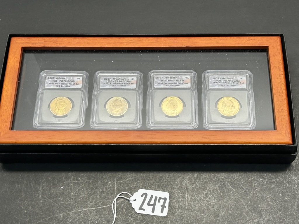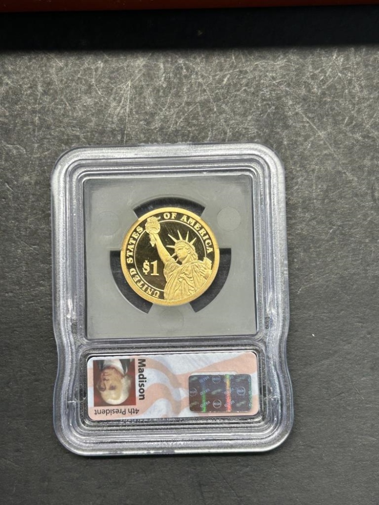 WASHINGTON, ADAMS, JEFFERSON, MADDISON ONE DOLLAR COINS IN A WOODEN CASE