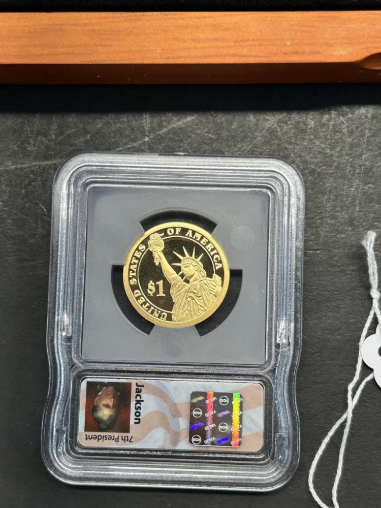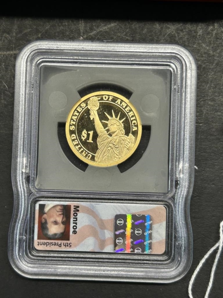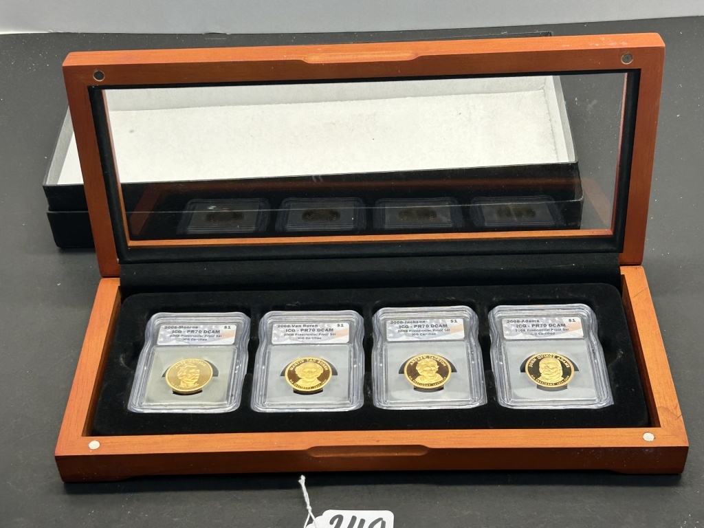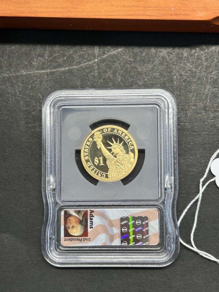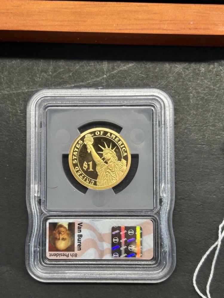 MONROE, VAN BUREN, JACKSON, ADAMSONE DOLLAR COINS IN A WOODEN CASE