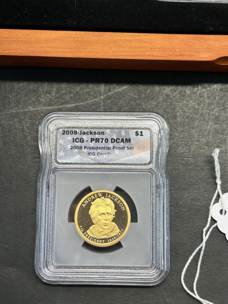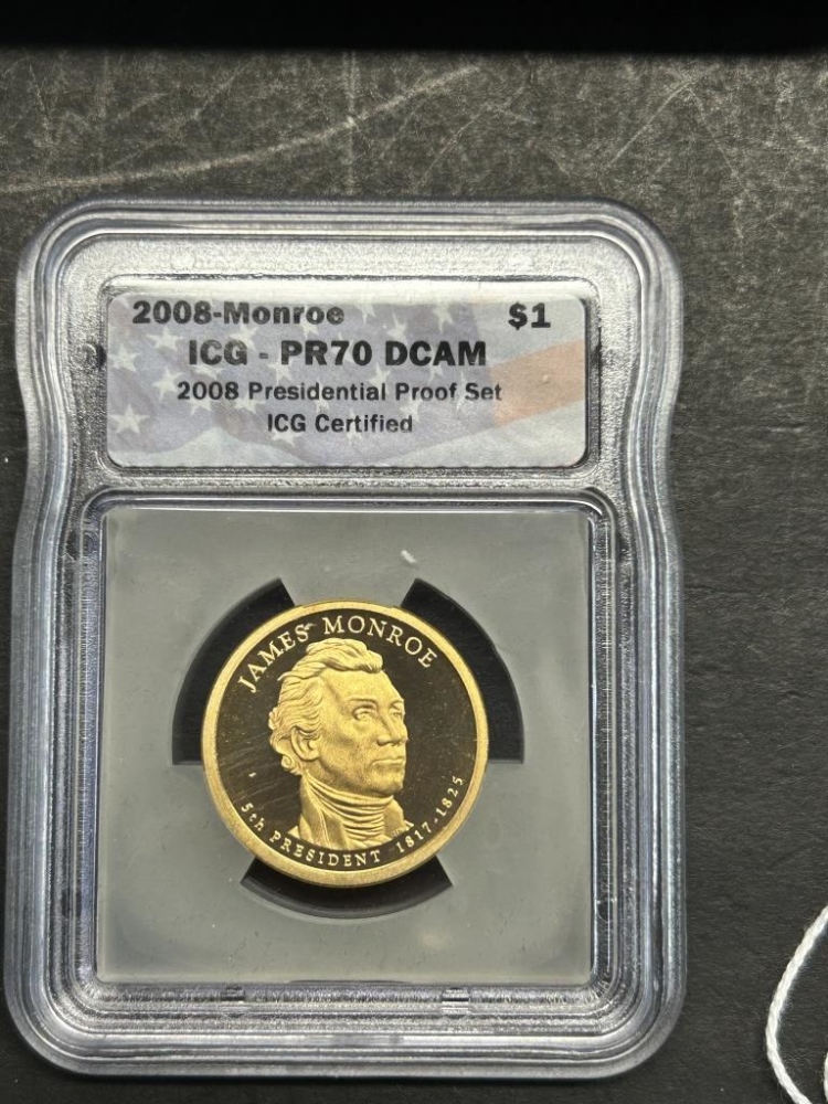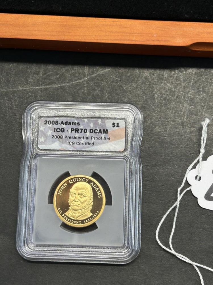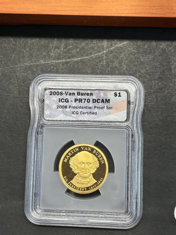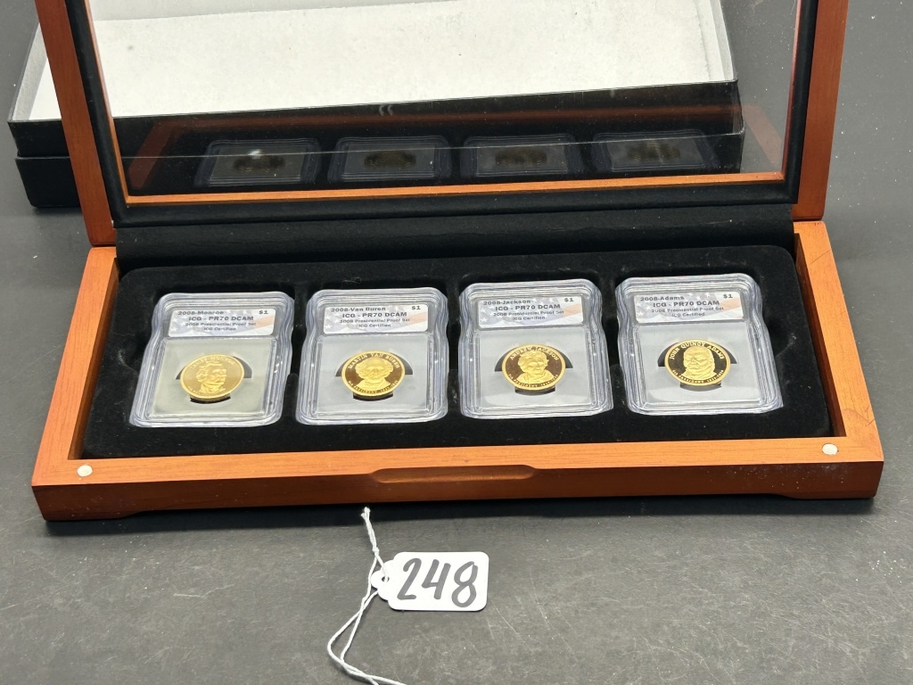 MONROE, VAN BUREN, JACKSON, ADAMSONE DOLLAR COINS IN A WOODEN CASE