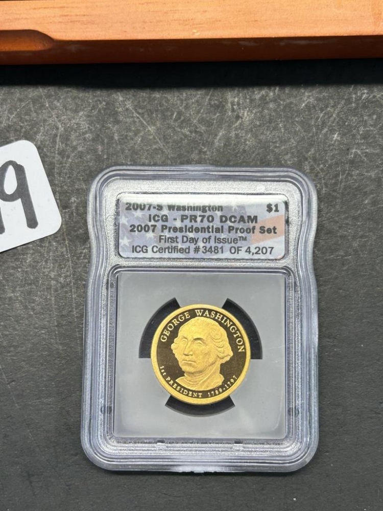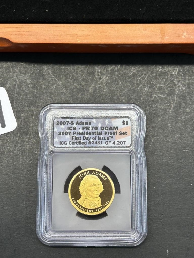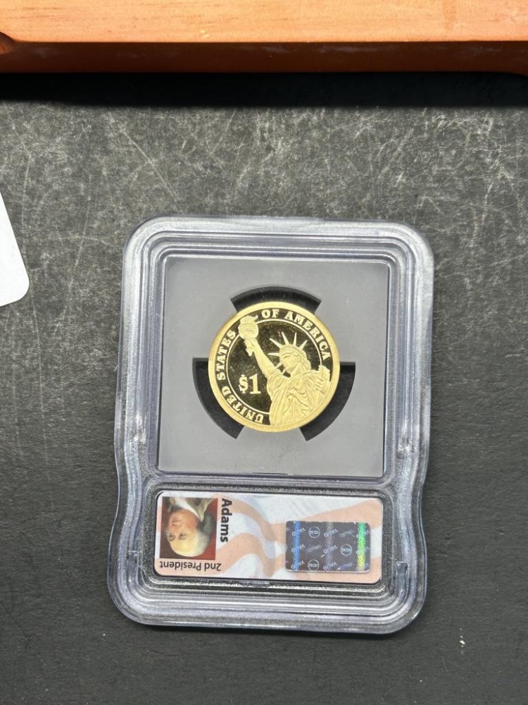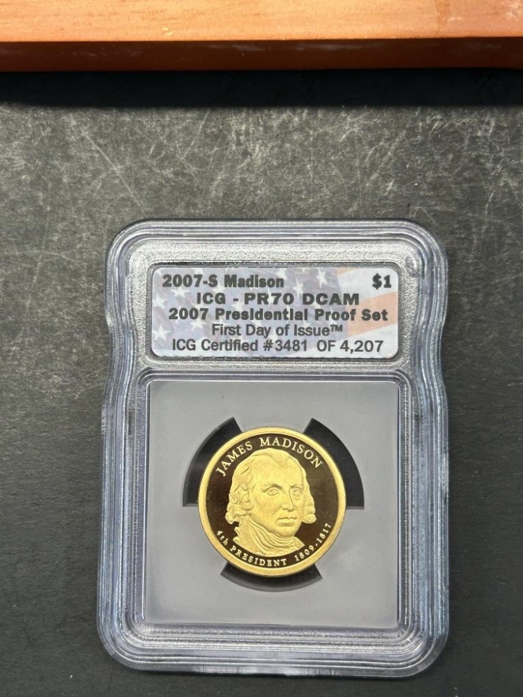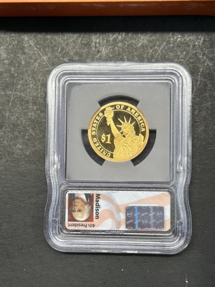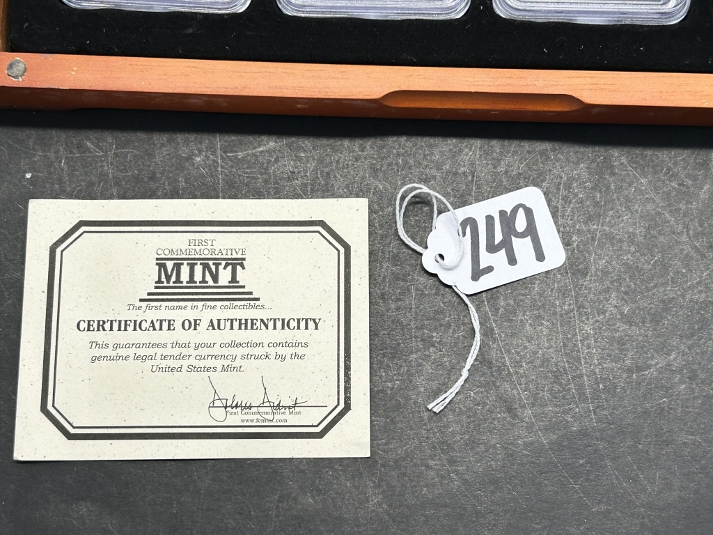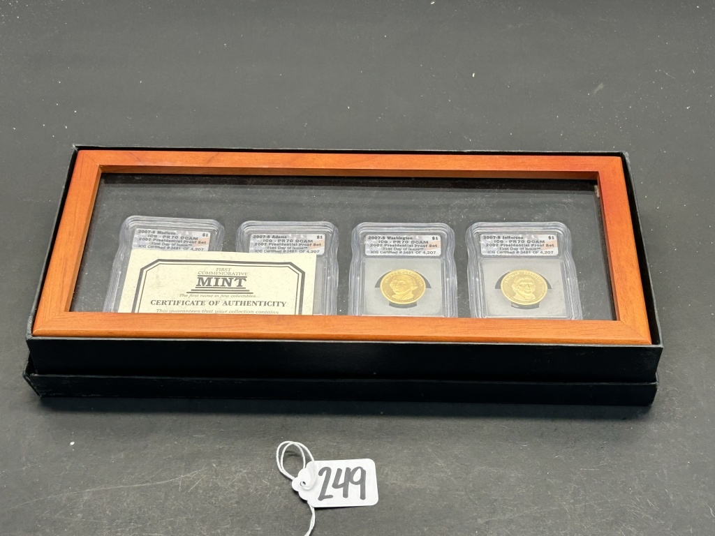 MADISON, ADAMS, WASHINGTON, JEFFERSON, ONE DOLLAR COINS IN A WOODEN CASE WITH A CERTIFICATE OF AUTHENTICITY