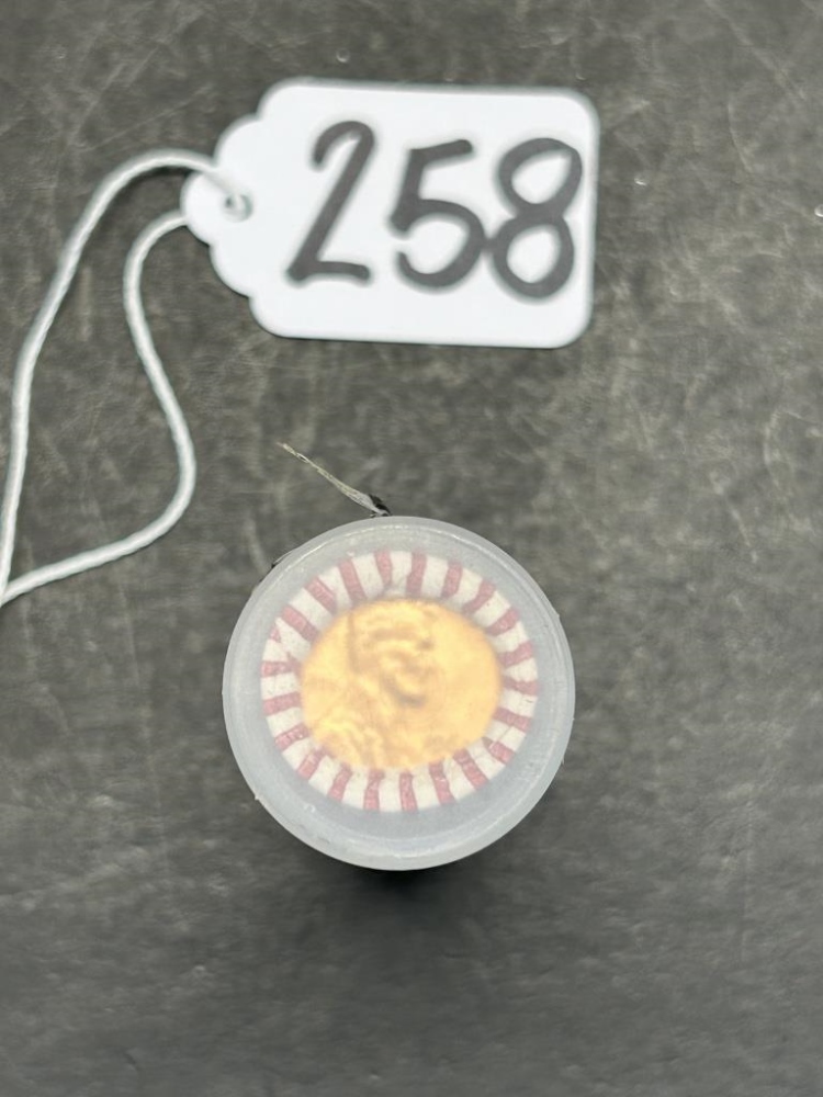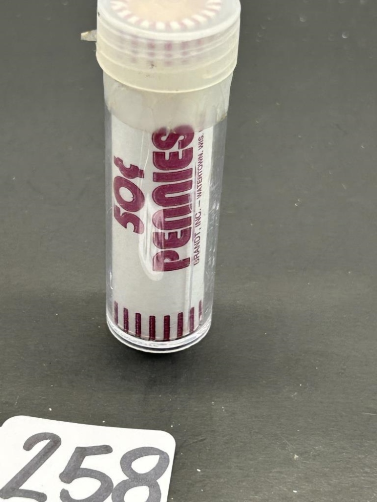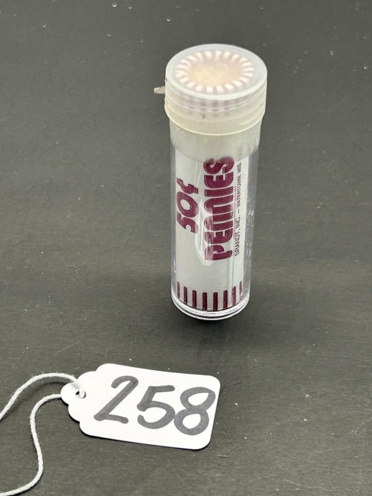 1960, 50 PENNIES IN A TUBE STILL IN ORIGINAL PAPER WRAPPING “BRANDT, INC. – WATERTOWN, WIS, USA”