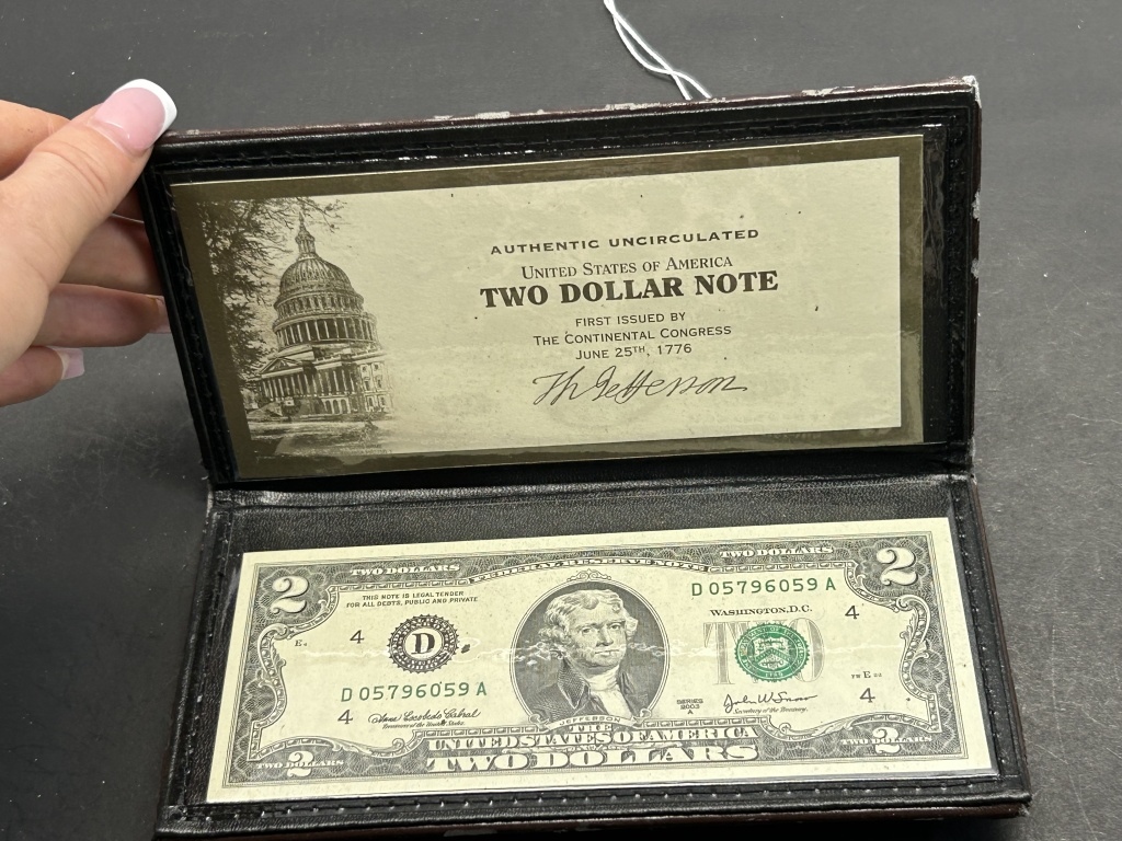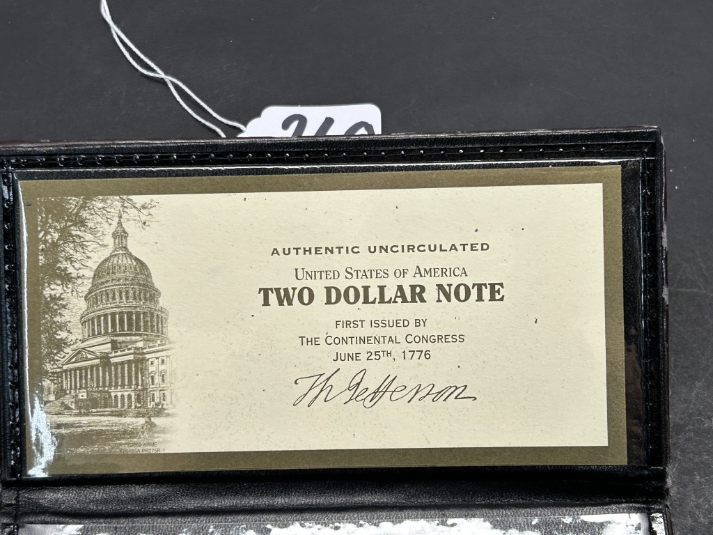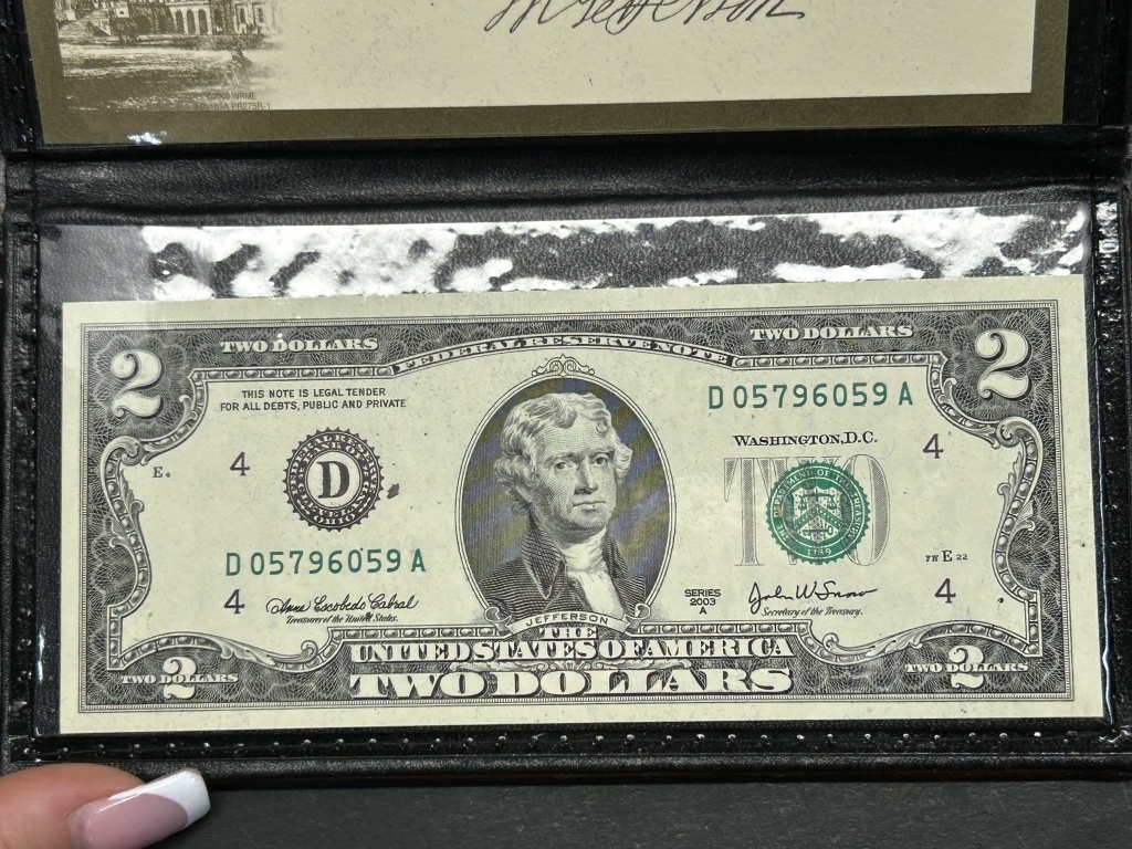 WORLD RESERVE MONETARY EXCHANGE CASE, WITH FEDERAL RESERVE NOTE, 1776 THOMAS JEFFERSON, INCLUDING TWO DOLLAR BILL .