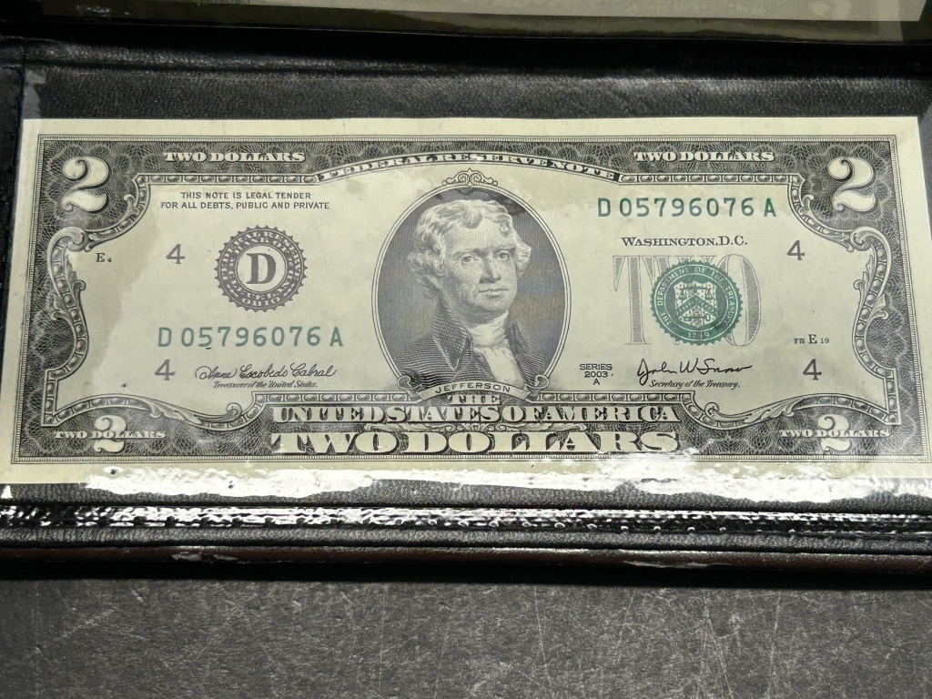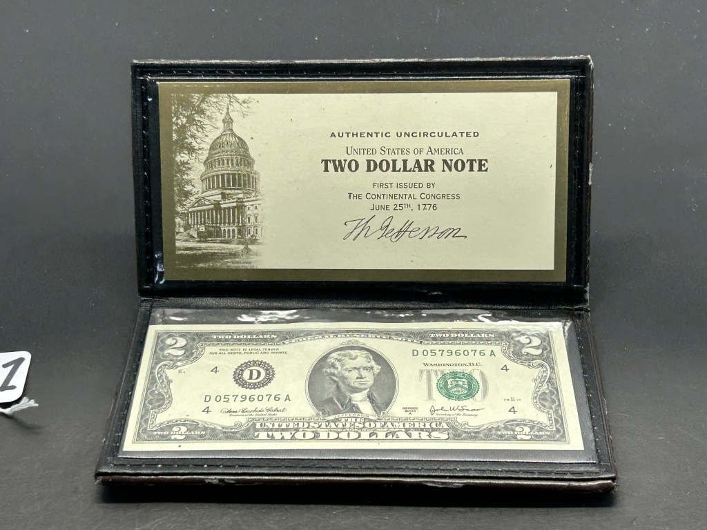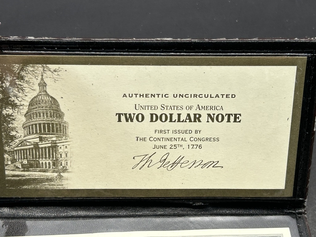 WORLD RESERVE MONETARY EXCHANGE CASE, WITH FEDERAL RESERVE NOTE, 1776 THOMAS JEFFERSON, INCLUDING TWO DOLLAR BILL .