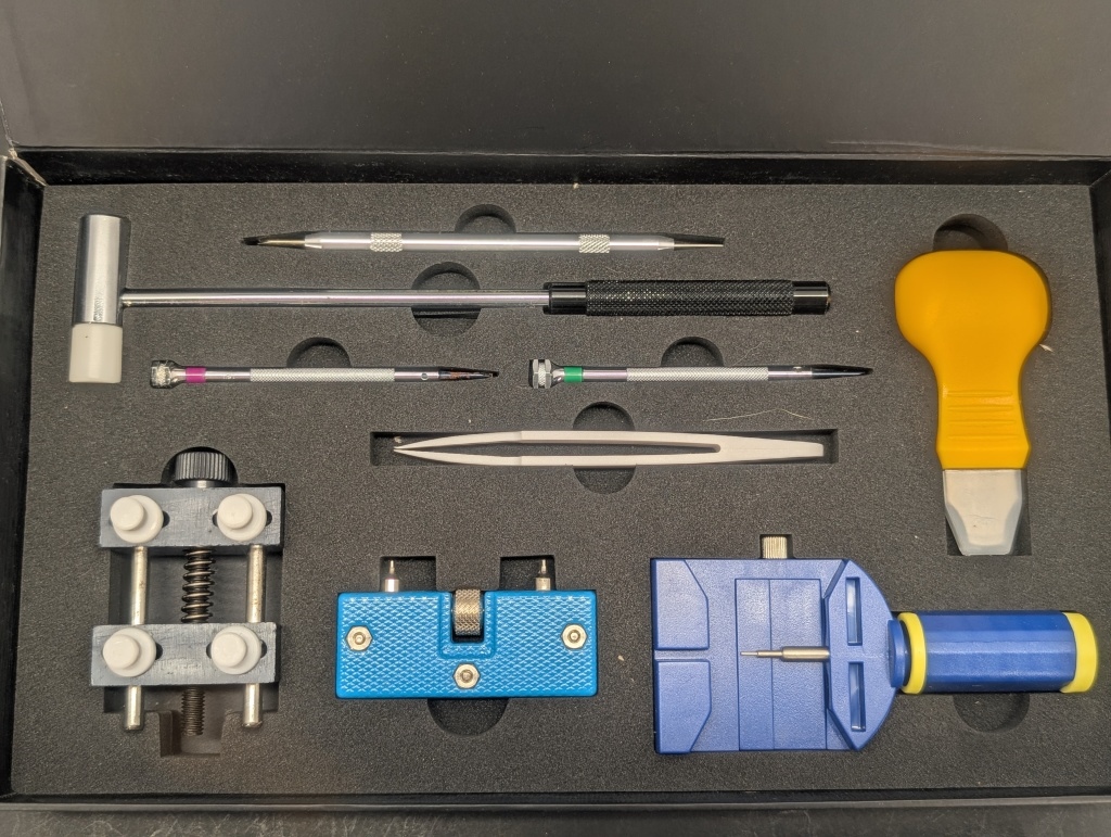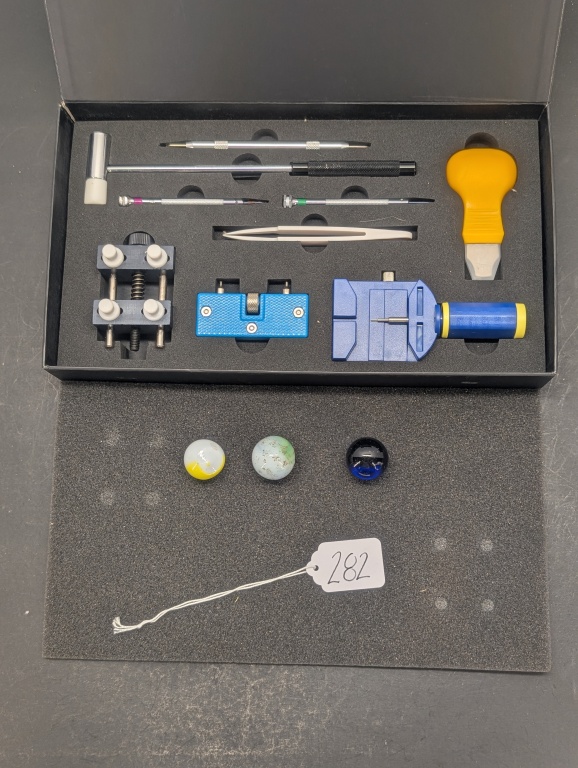THREE DIFFERENT COLOR MARBLE SOME WITH CHIPS IN THEM AND WATCH REPAIR KIT