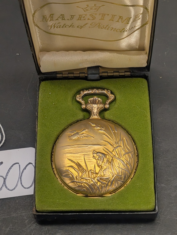 MAJESTIME WATCH OF DISTICTION, ENGRAVED HUNTING SCEEN OF DOG AND DUCK/GEESE