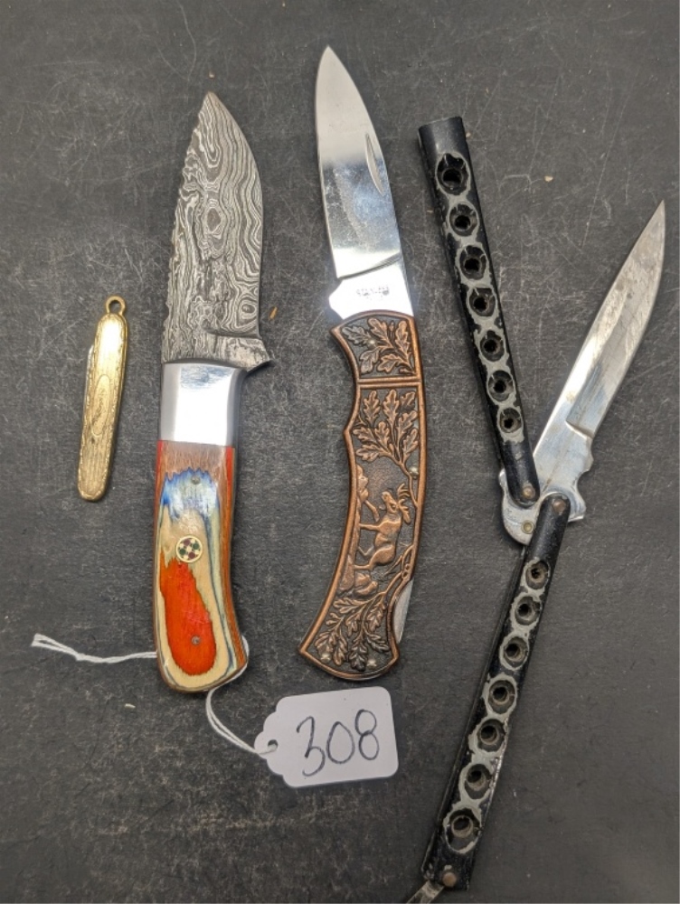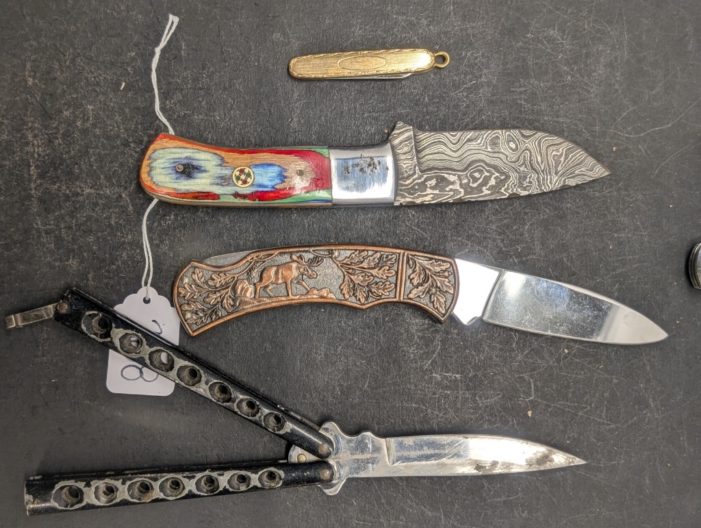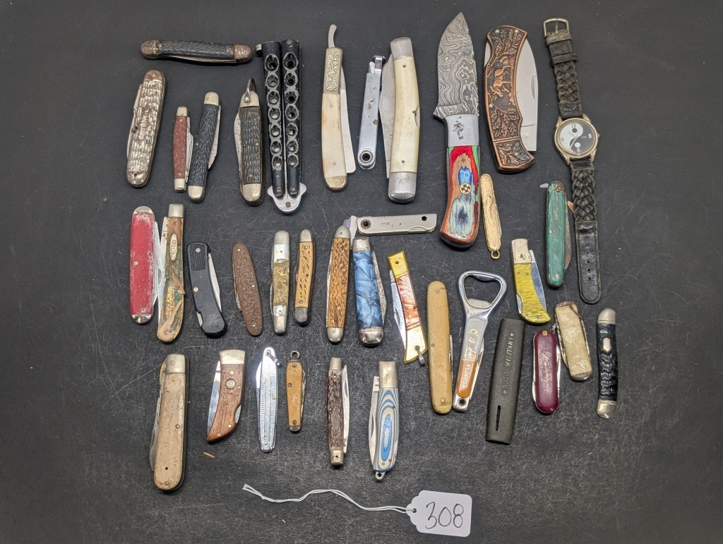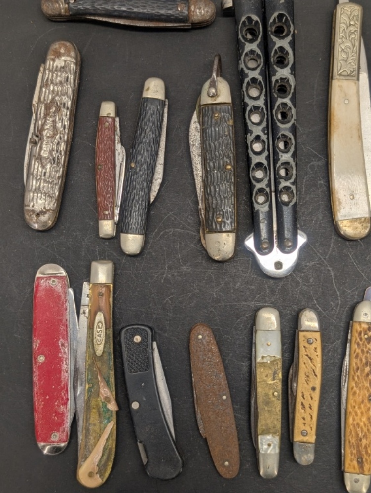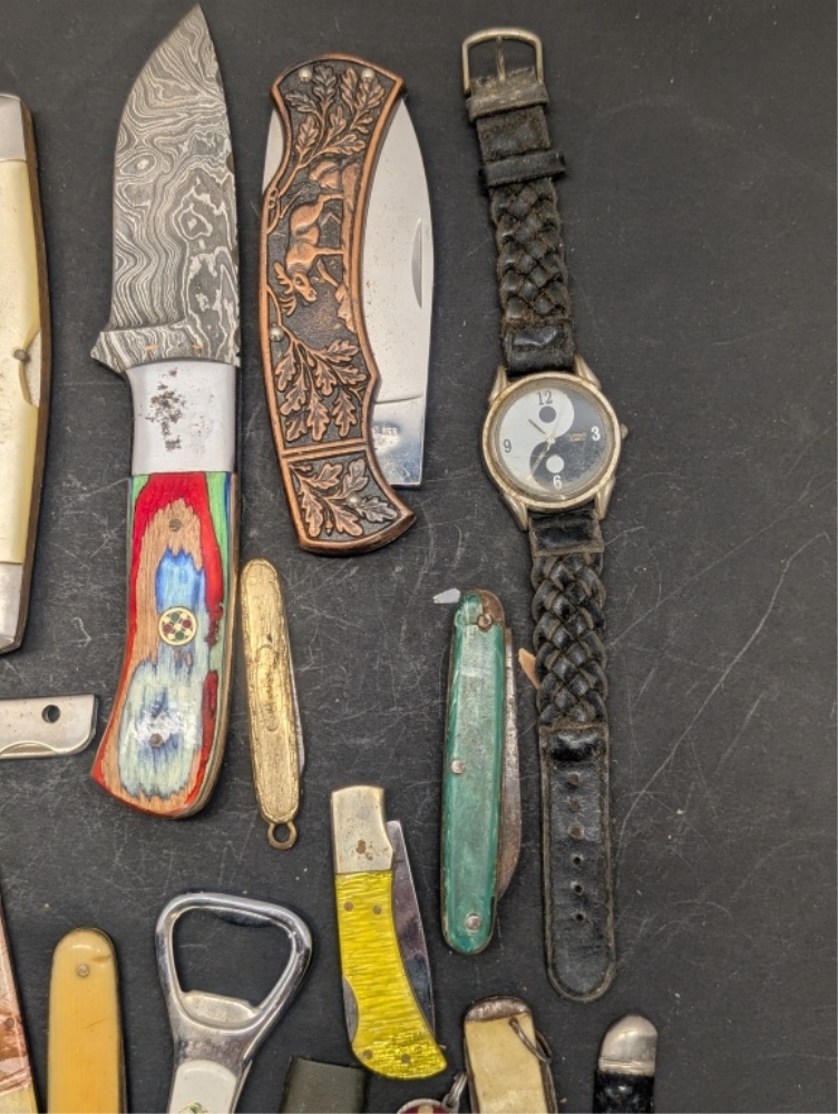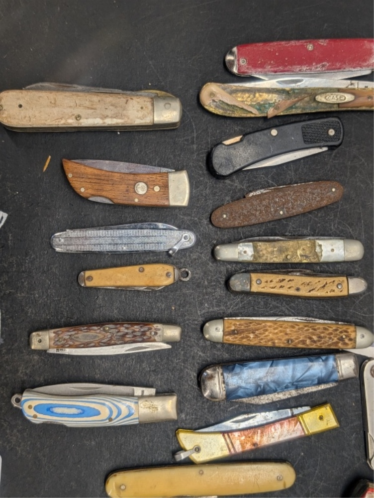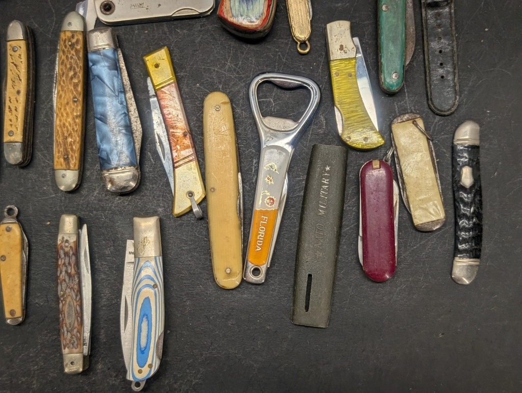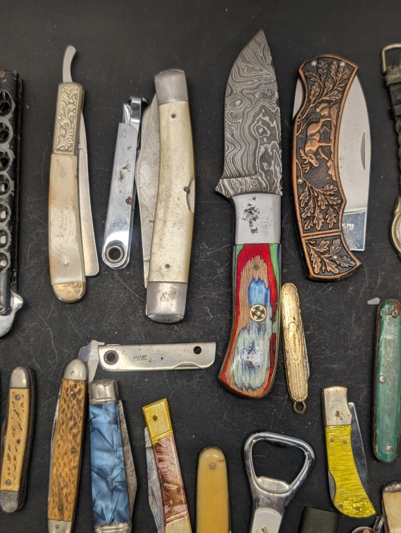 MULTIPLE DIFFERENT STYLE AND COLOR POCKET KNIVES & A COLORFUL HANDLED HUNTING KNIFE