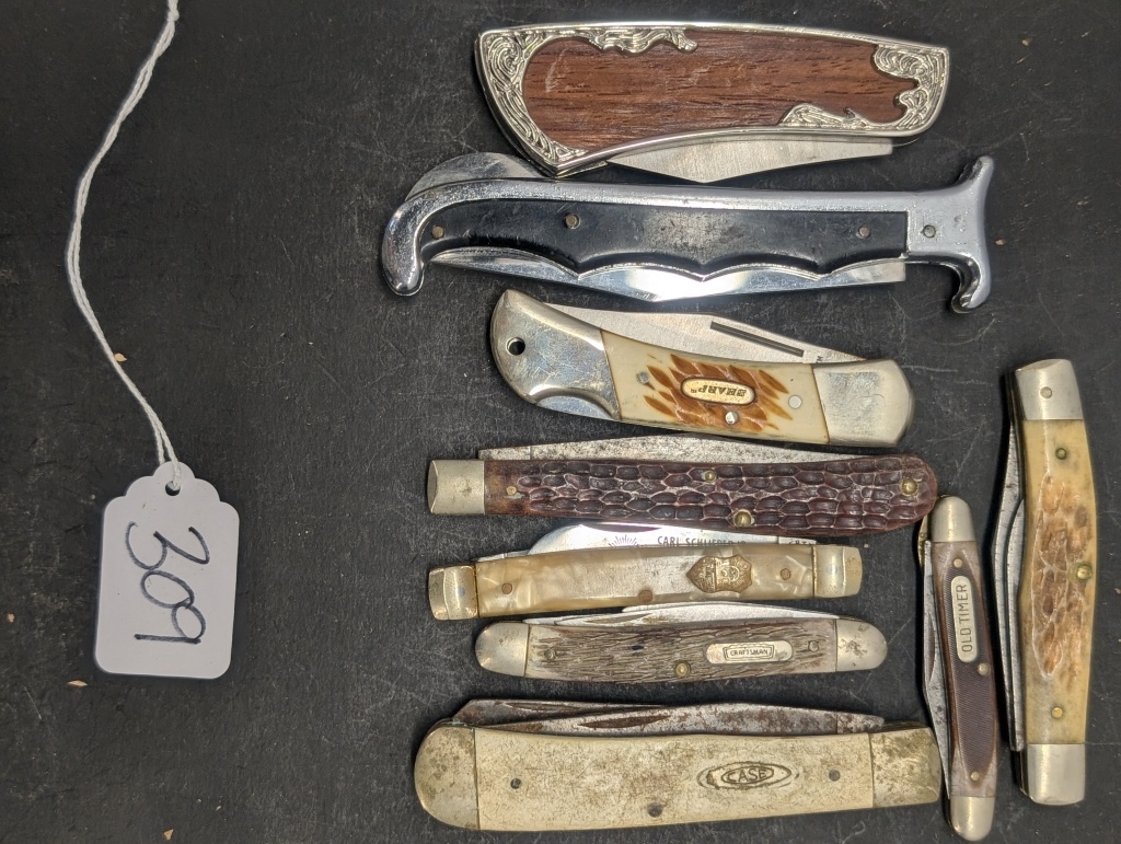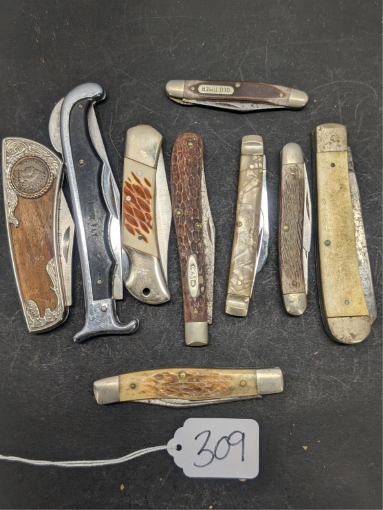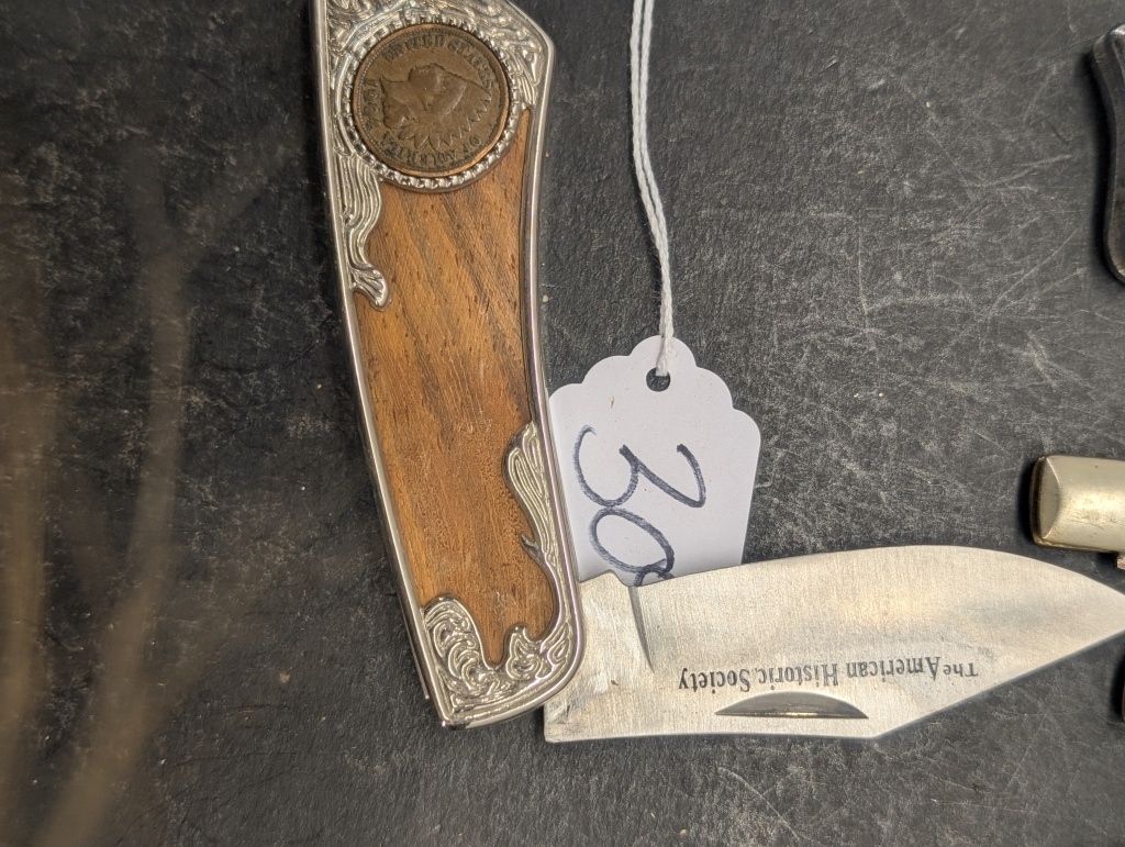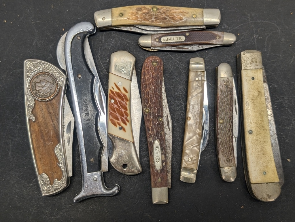 9 DIFFERENT STYLED POCKET KNIFES, INDIAN HEAD PENNY POCKET KNIFE