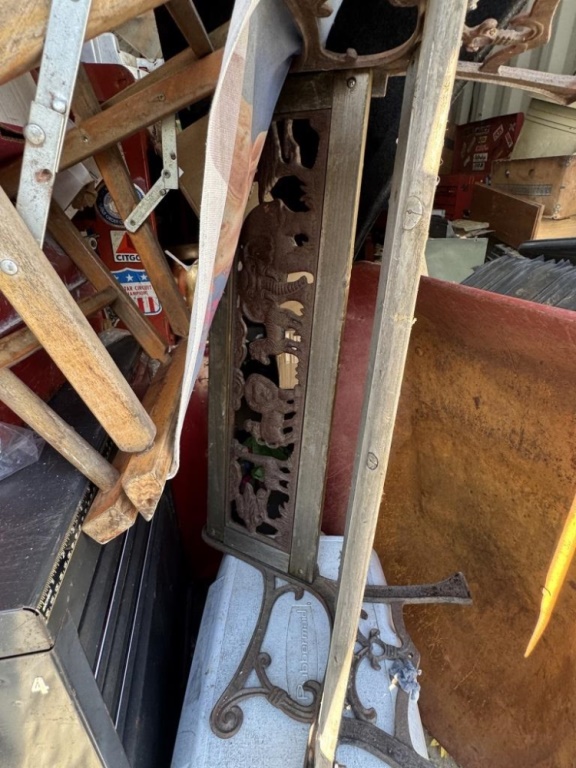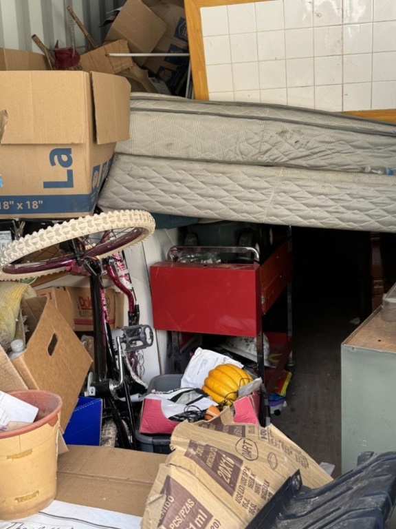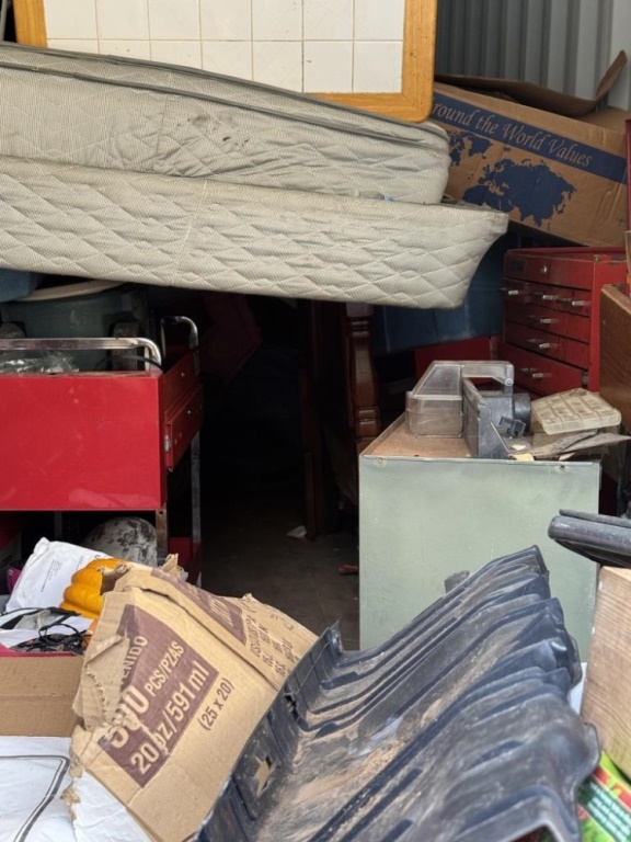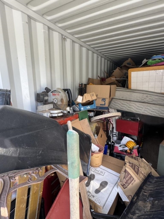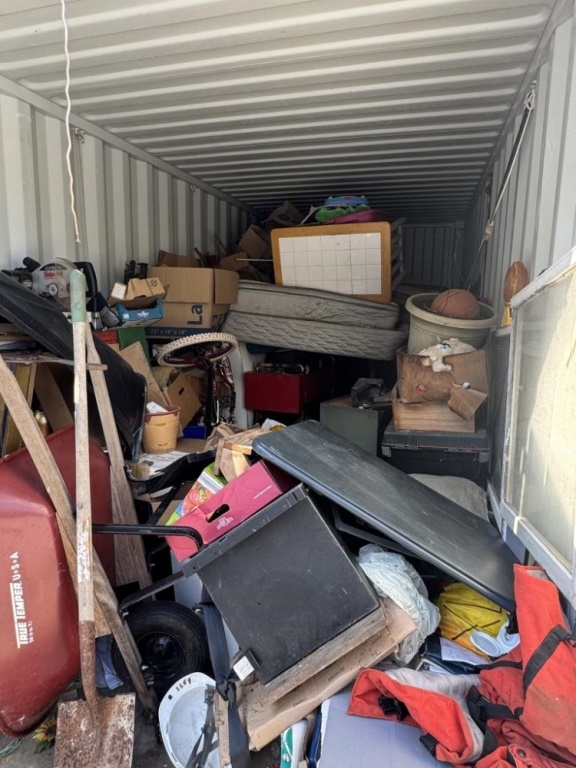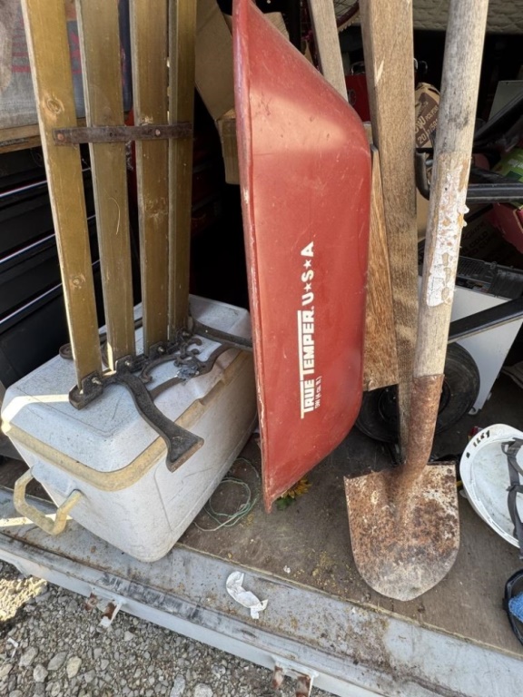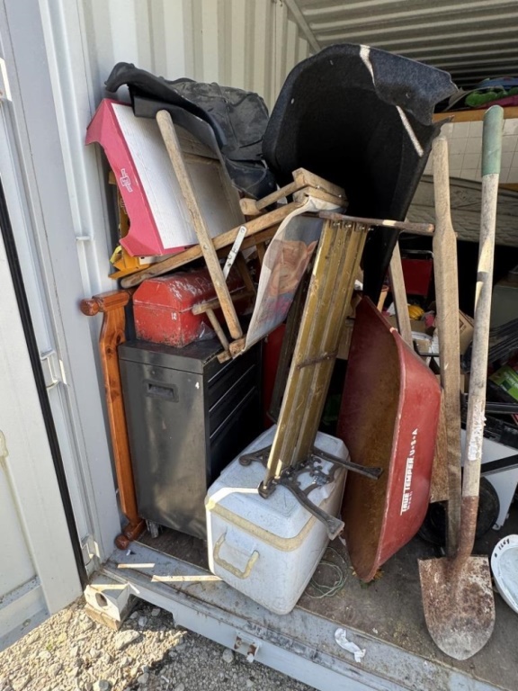 BENCH, WHEELBARROW, TOOLS, COOLER, SPORTS ITEMS, SHOP ITEMS, PLANTERS, MATTRESSES, MORE. ROUGHLY 10′ X 20′.