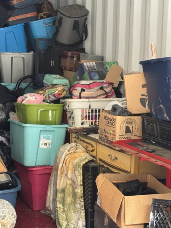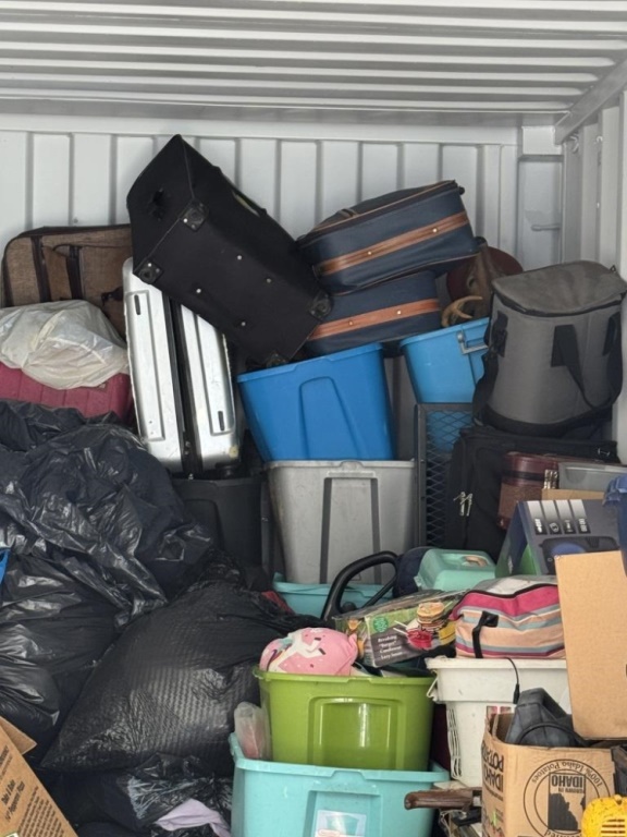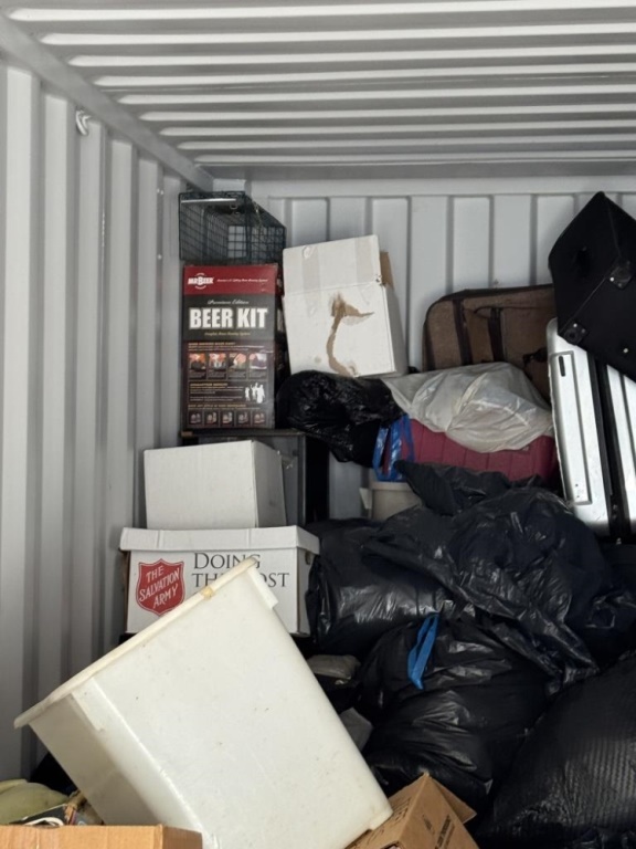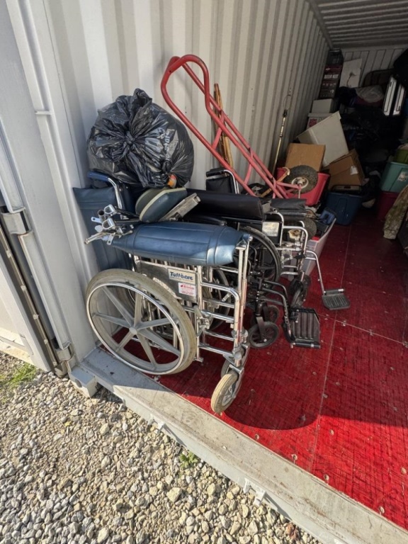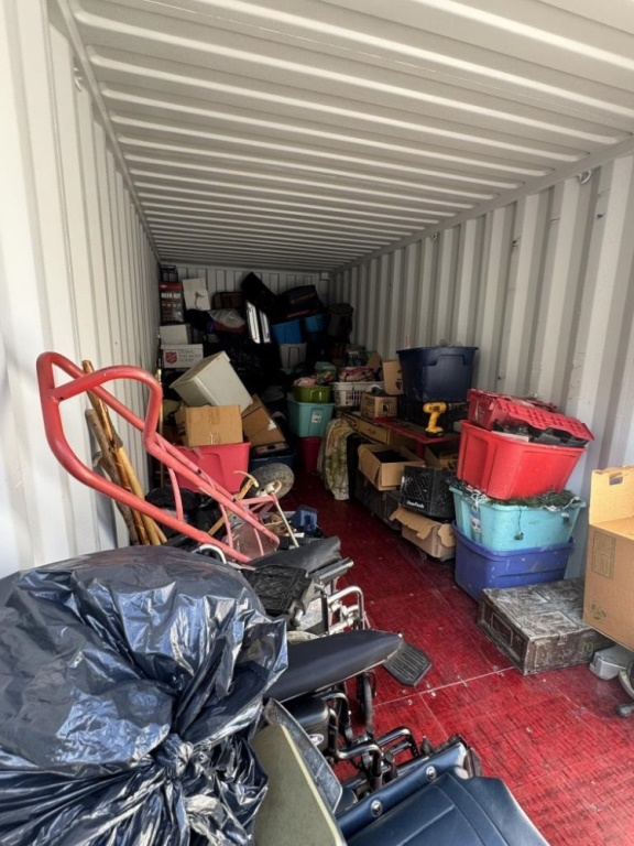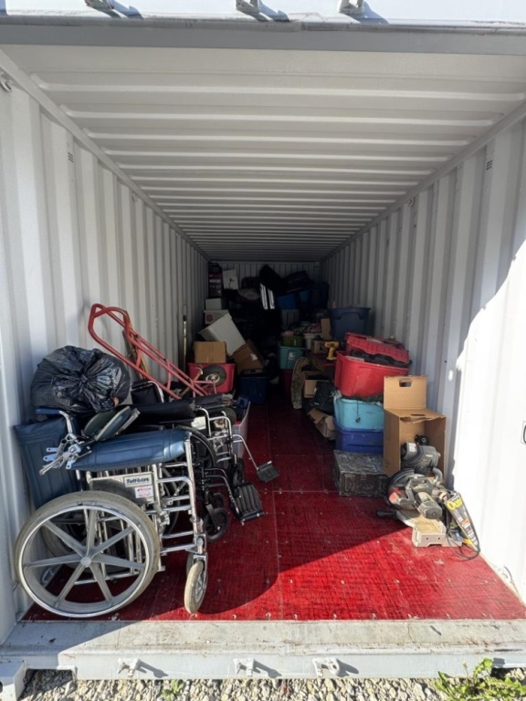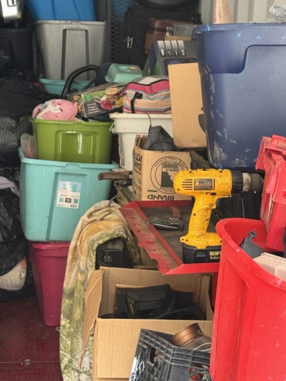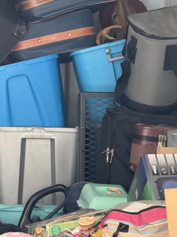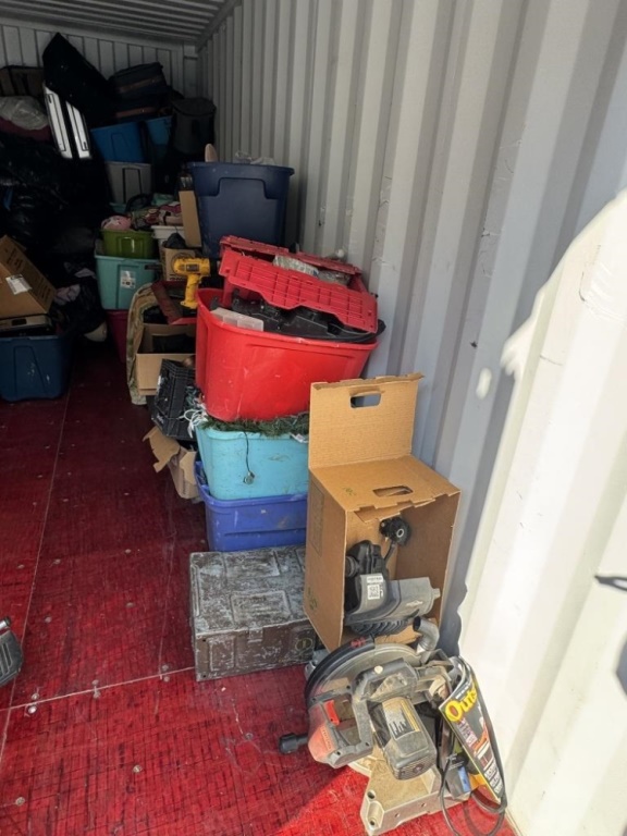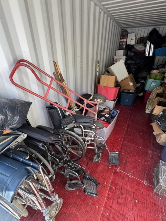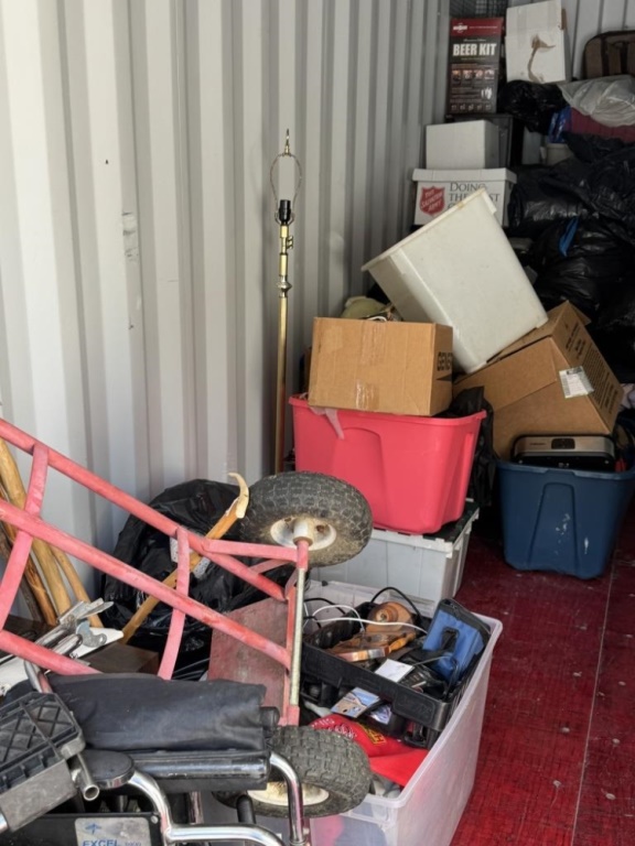 TOOLS, WHEELCHAIR, DOLLY, BINS, BEER KIT, LAWN TOOLS, SUITCASES, ELECTRONICS, MORE. ROUGHLY 10′ X 20′