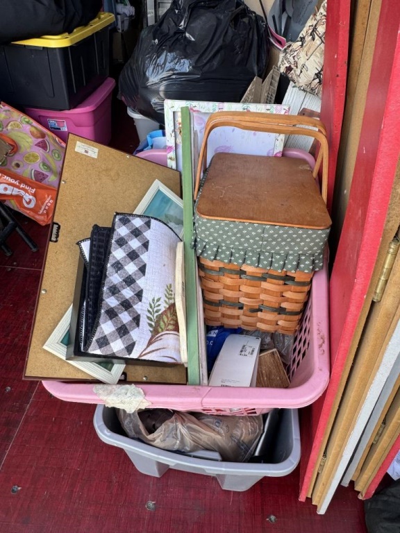 TABLES, SHELVES, BINS, CLOTHES, BASKET, MORE. ROUGHLY 10′ X 20′