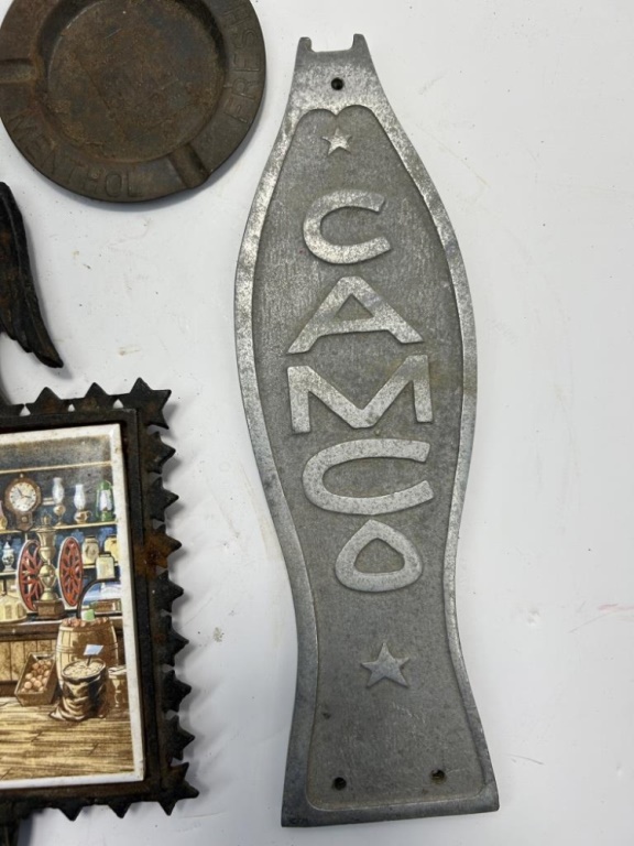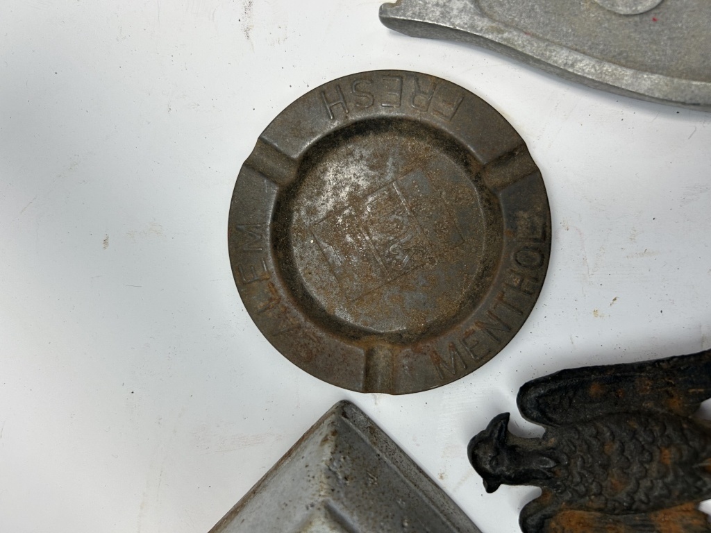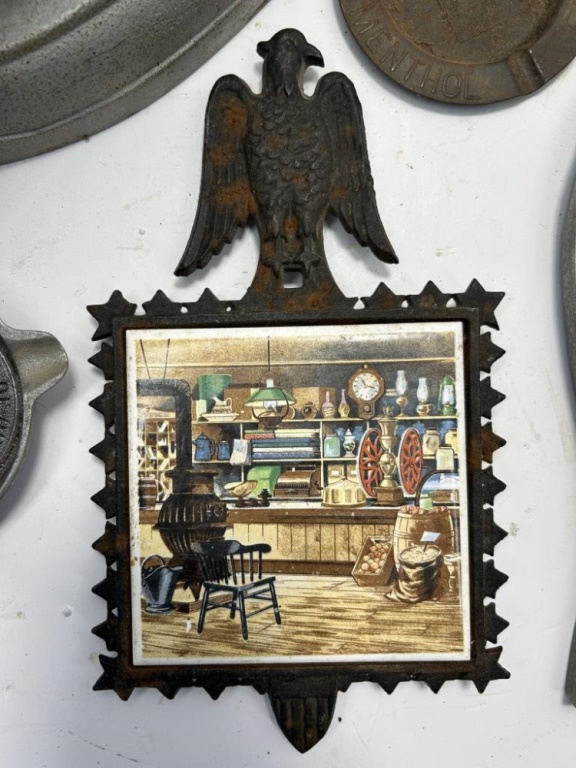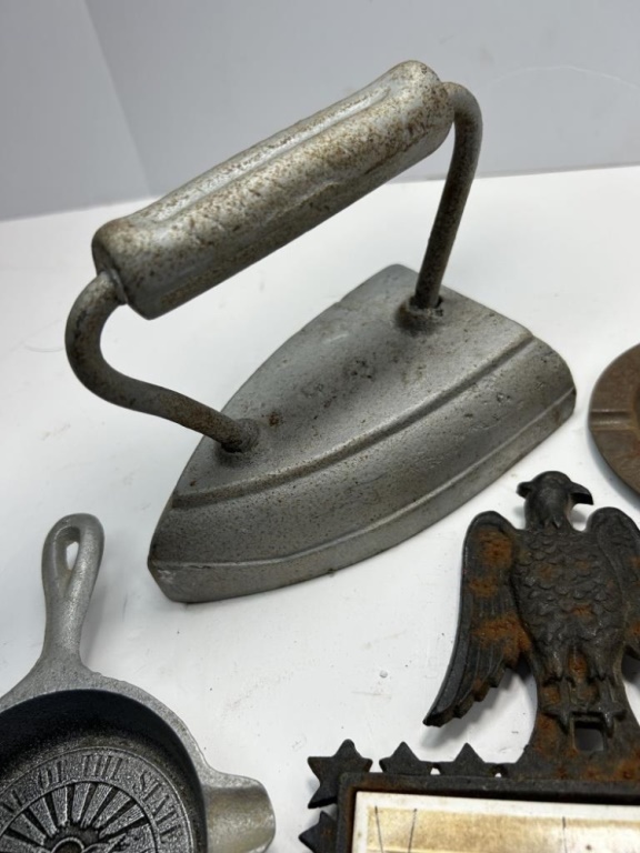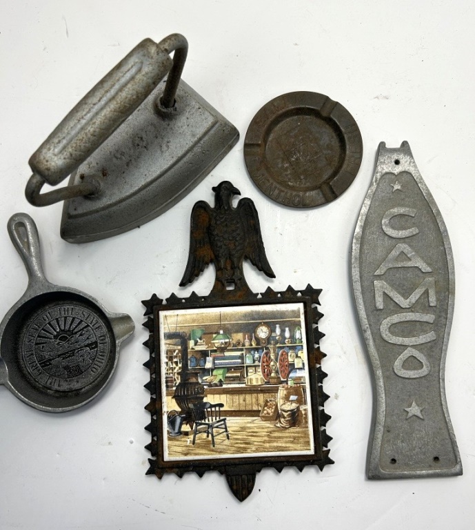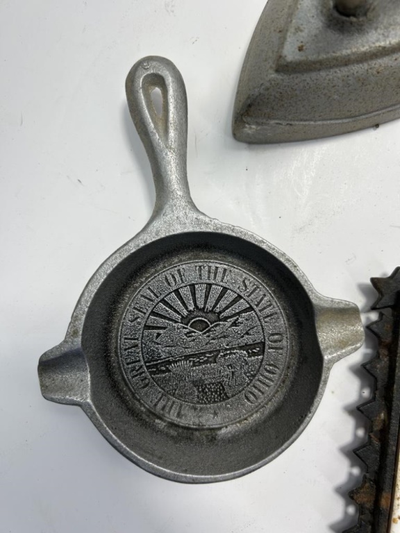 LOT FEATURES CAST IRON SKILLET WITH SEAL OF OHIO, CAST IRON ASH TRAY AND IRON