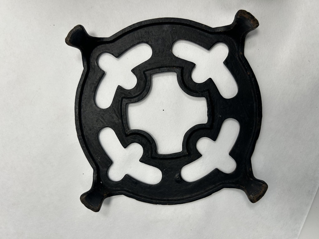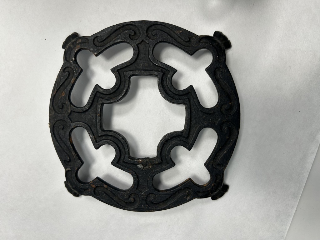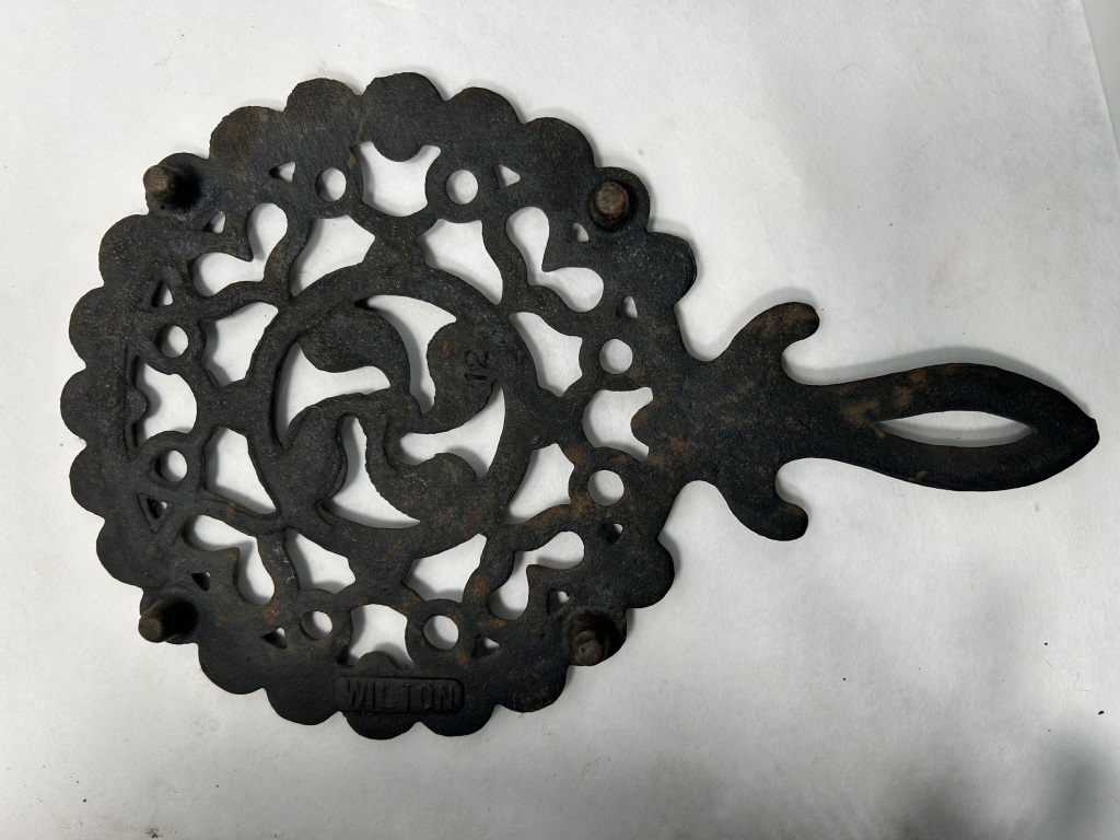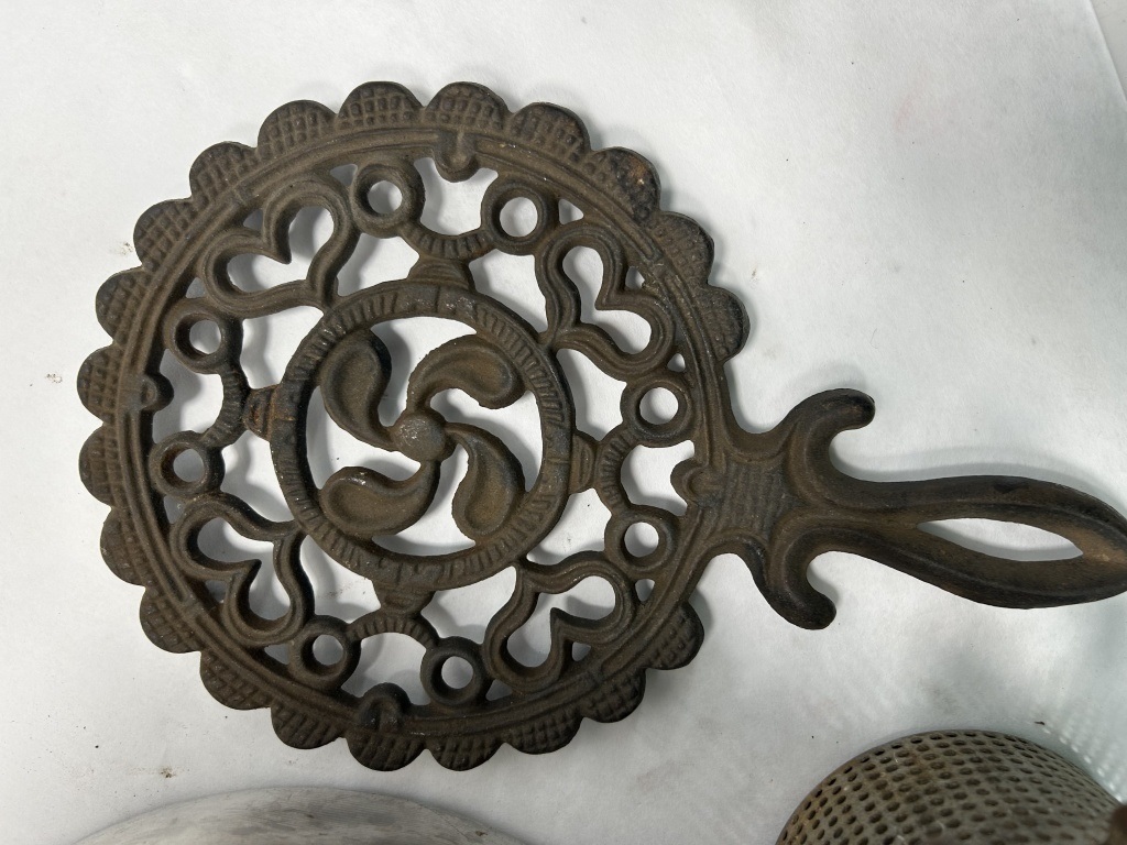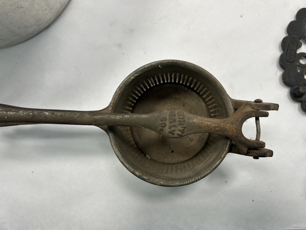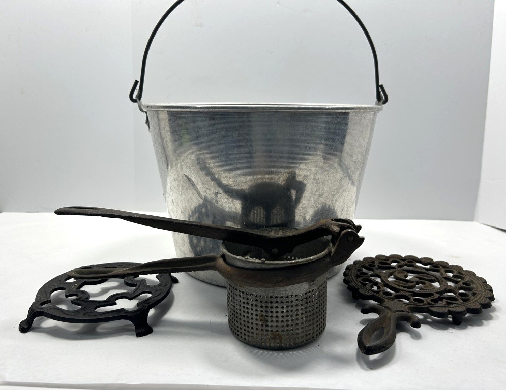 VINTAGE POTATO MASHER, ALUMINUM BUCKET, AND 2 CAST IRON TRIVETS
