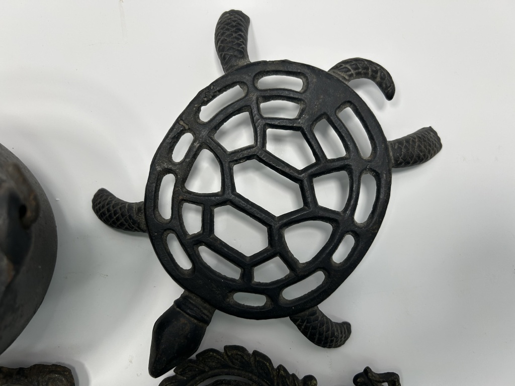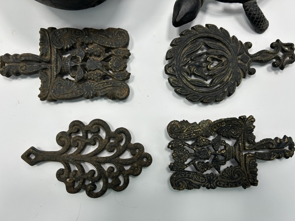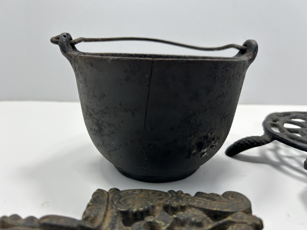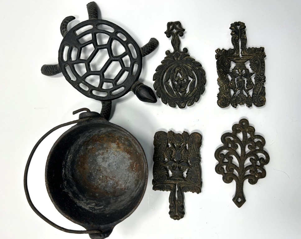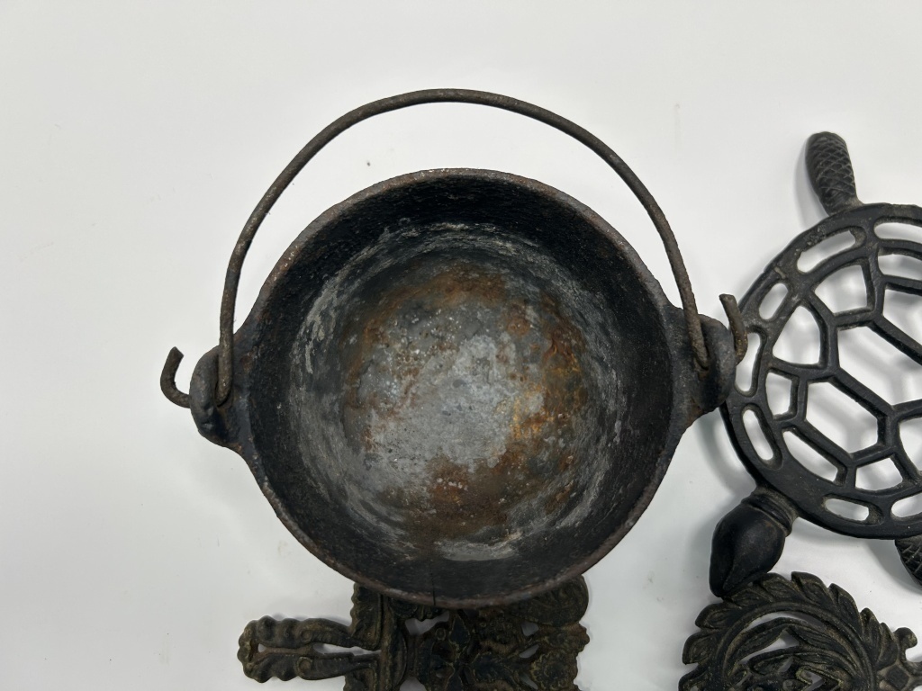 LOT OF 5 CAST IRON TRIVETS AND ONE 2 CUP CAULDRON