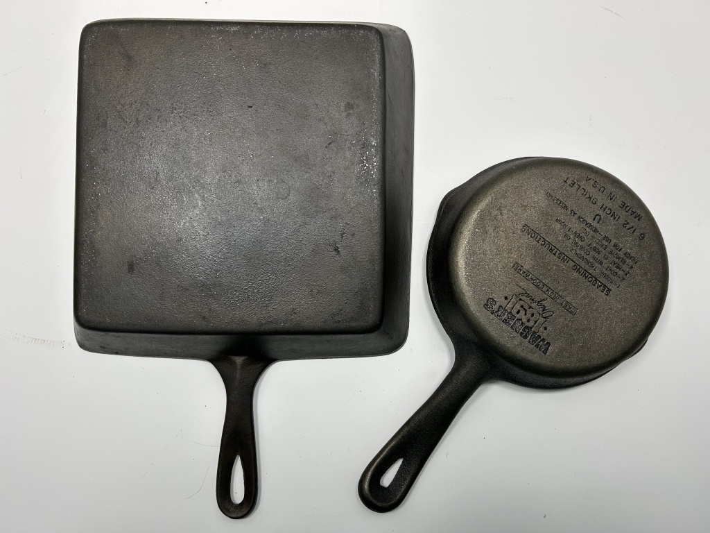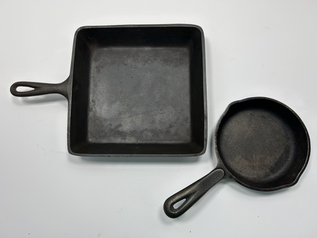 LOT INCLUDES SQUARE CAST IRON SKILLET AND 6 1/2 INCH ROUND SKILLET