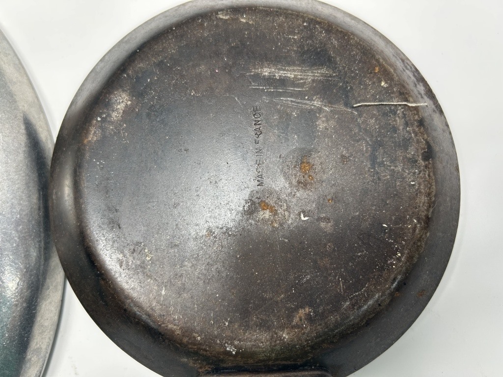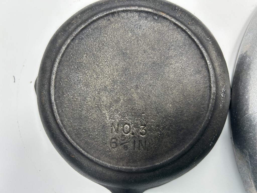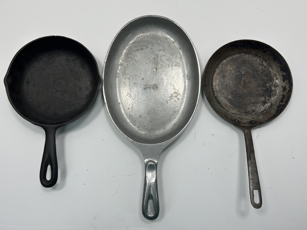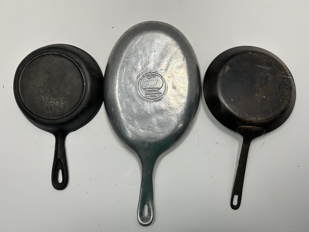 LOT FEATURES PEWTAREX ALUMINUM FRYING PAN AND 2 CAST IRON SKILLETS