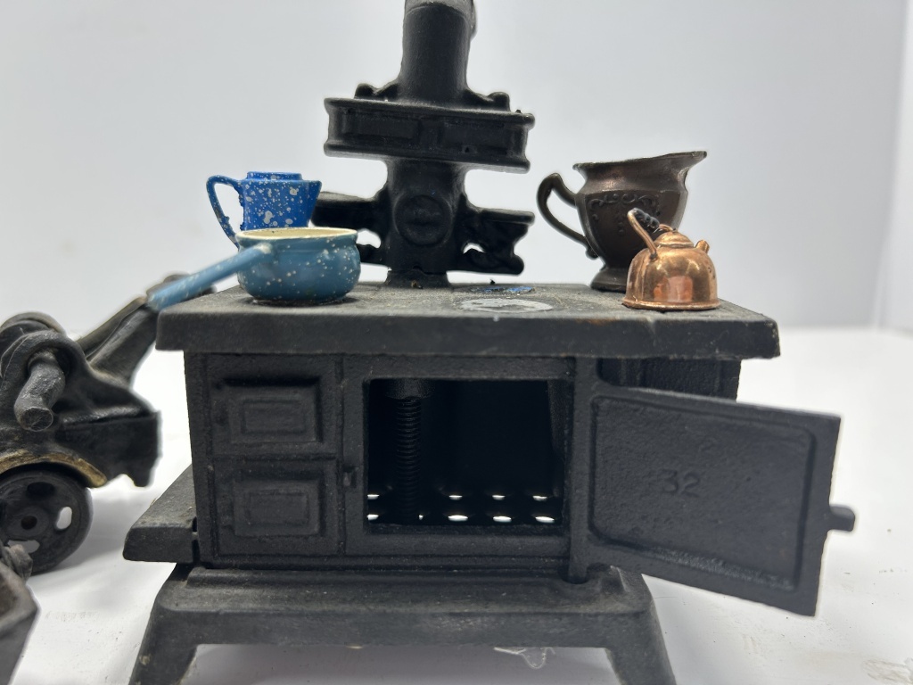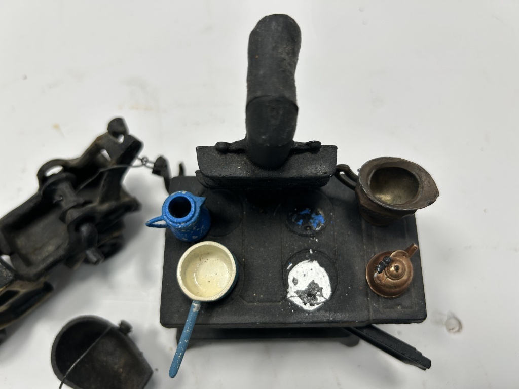 VINTAGE MINIATURE BONNIE GLO STOVE WITH ACCESSORIES