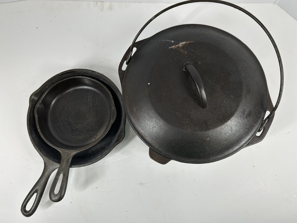 CAST IRON DUTCH OVEN AND 2 SKILLETS