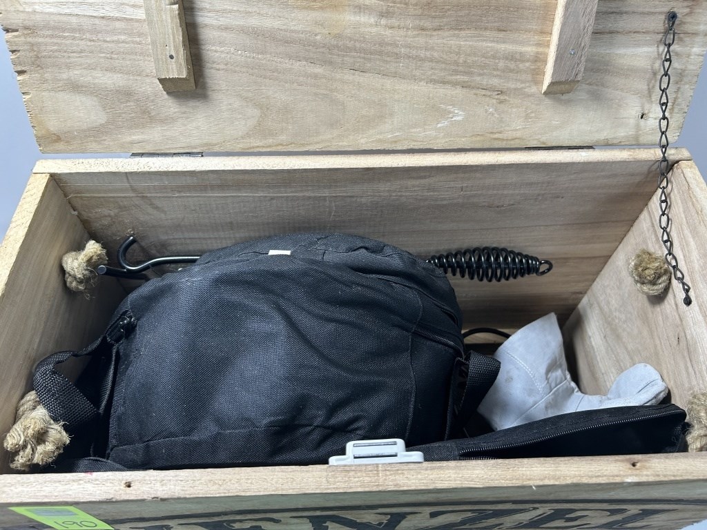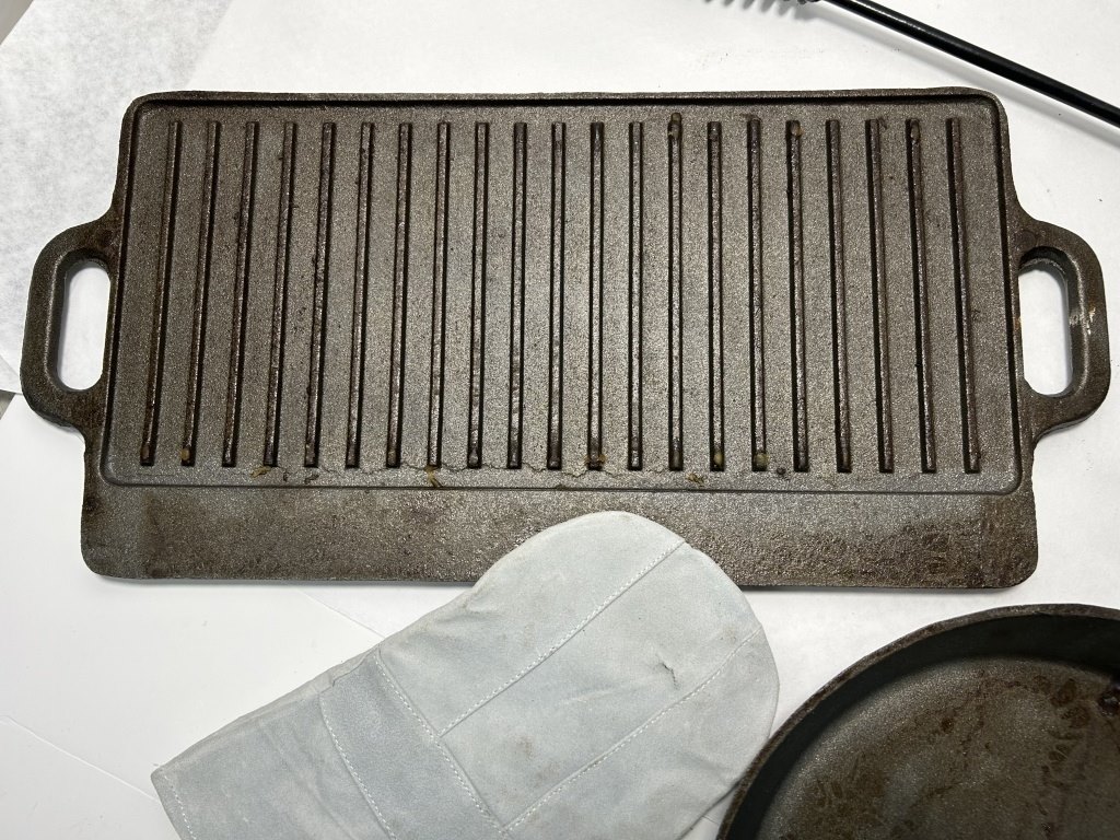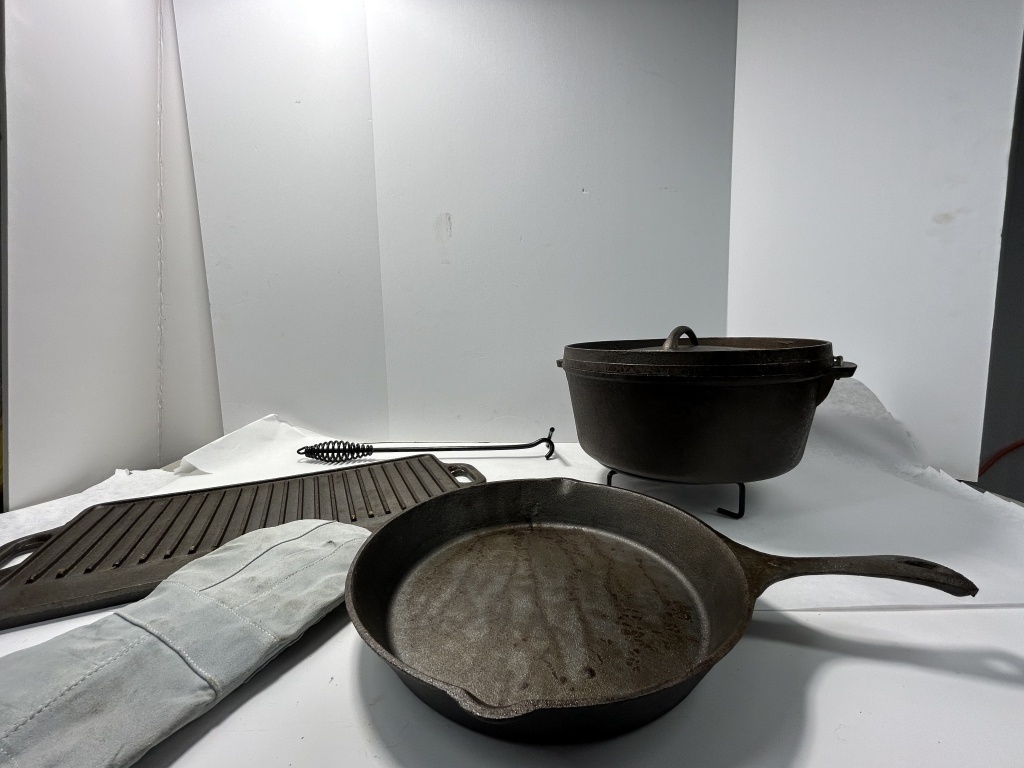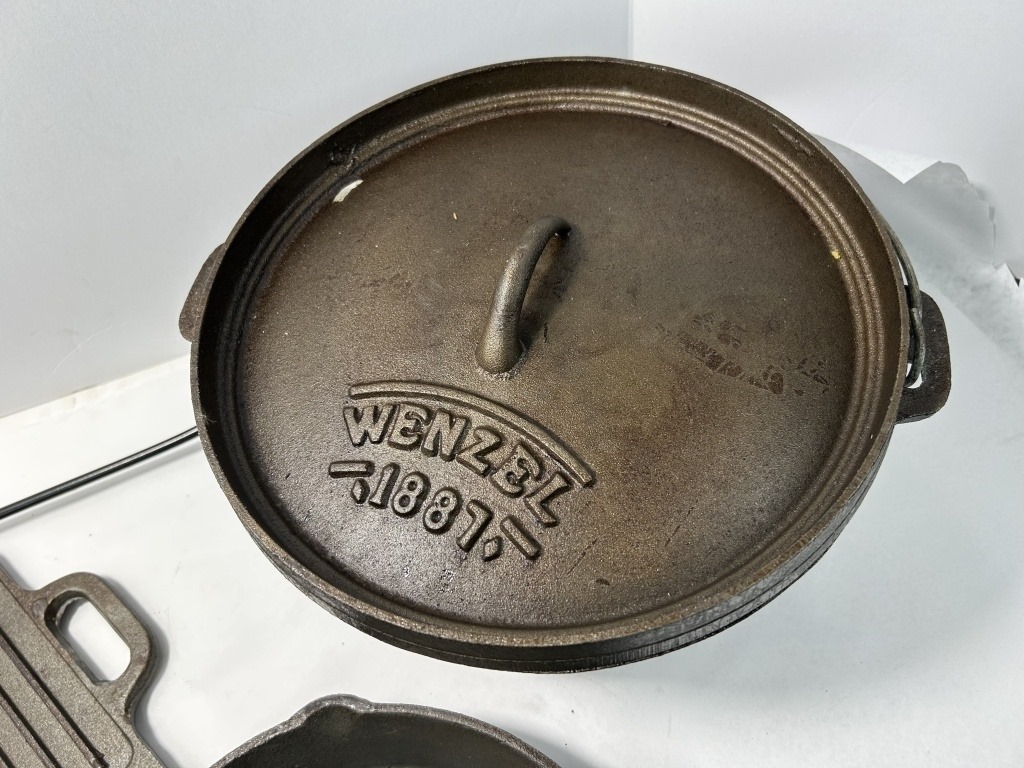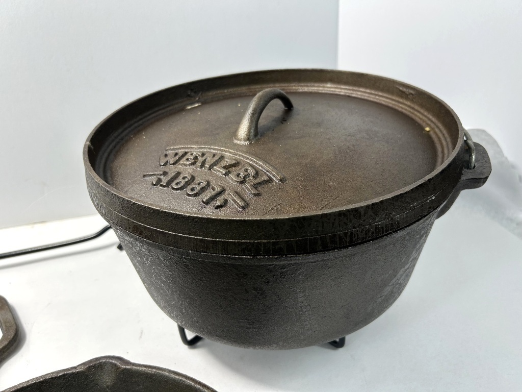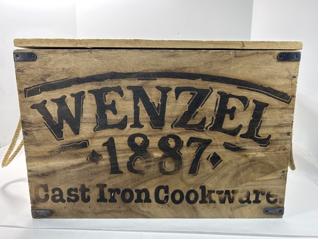 WENZEL CAST IRON COOKWARE CRATE WITH GRIDDLE TOP, BEAN POT, SKILLET, TRIVET