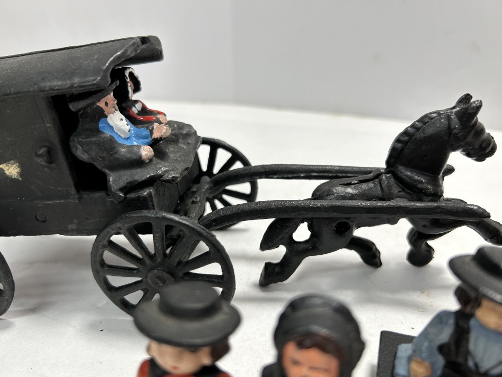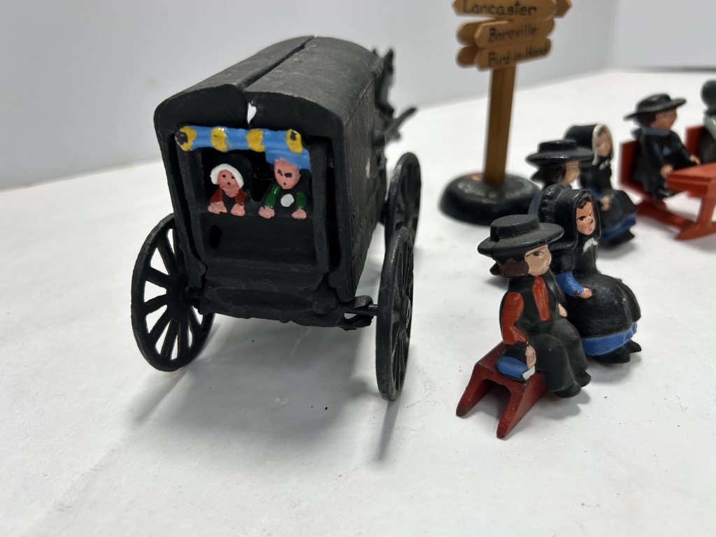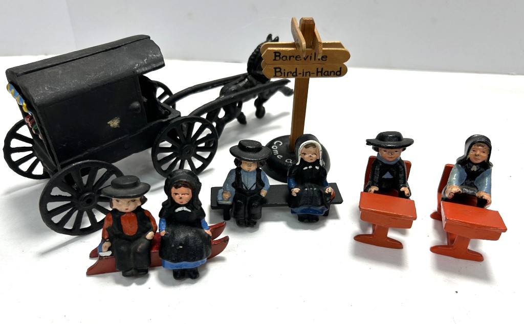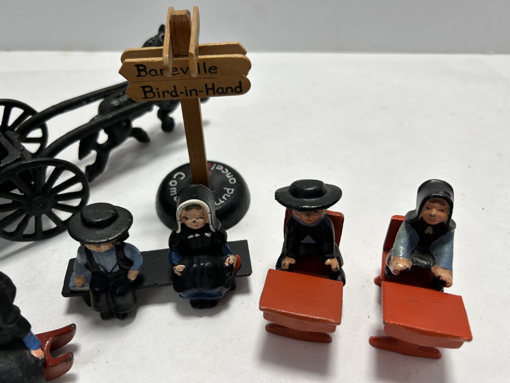 (5) PIECE SET OF AMISH FAMILY IN BUGGY, 2 SCHOOL CHILDREN, WOODEN SIGN, AND BENCH COUPLES