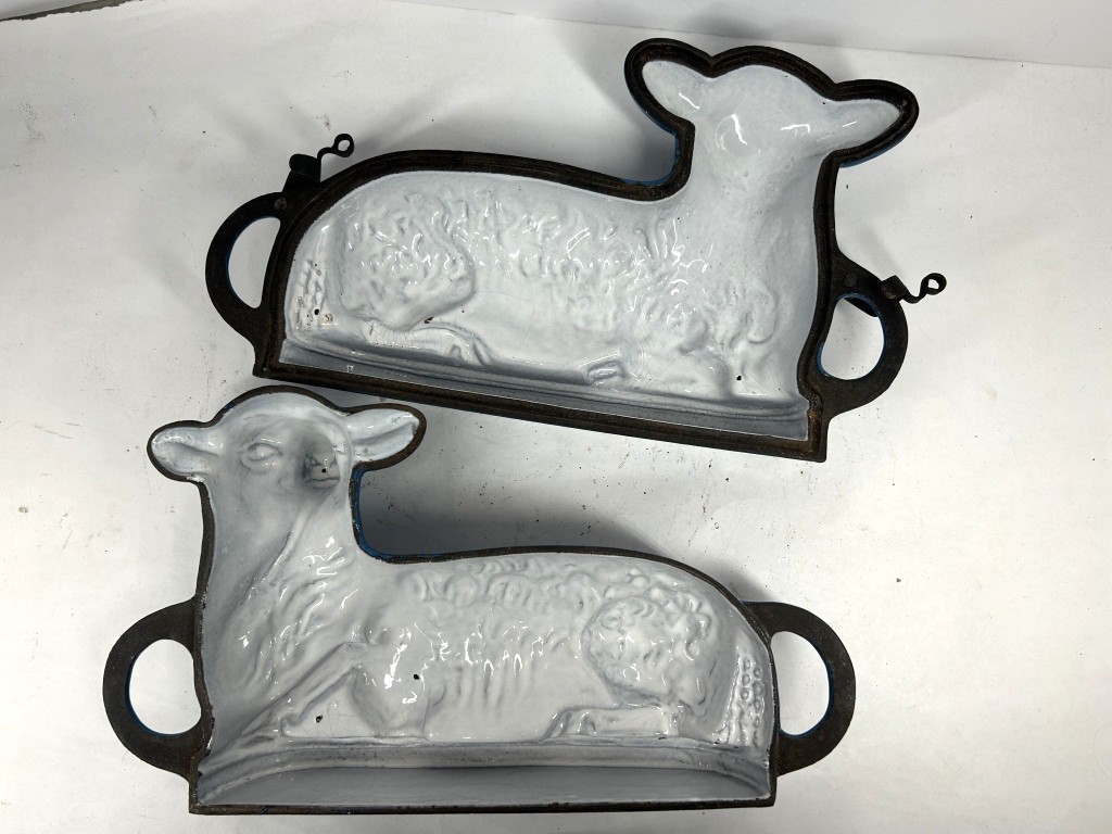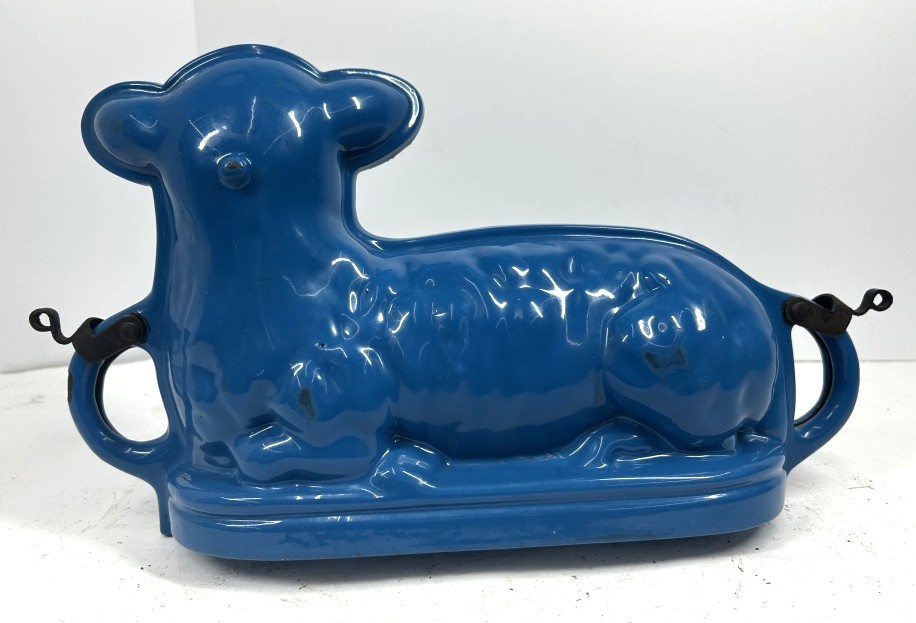 VINTAGE CAST IRON ENAMELED LAMB CAKE MOLD IN VIVID BLUE