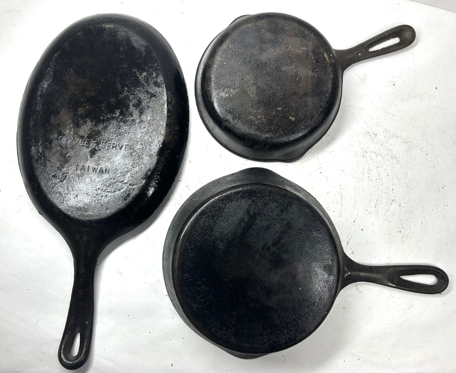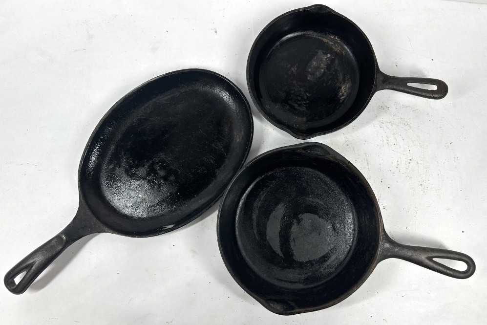 UNMARKED CAST IRON SKILLETS ONE 8 INCH, 6 1/2 INCH AND ONE OVAL