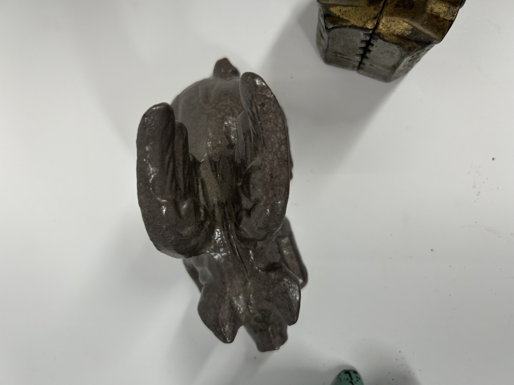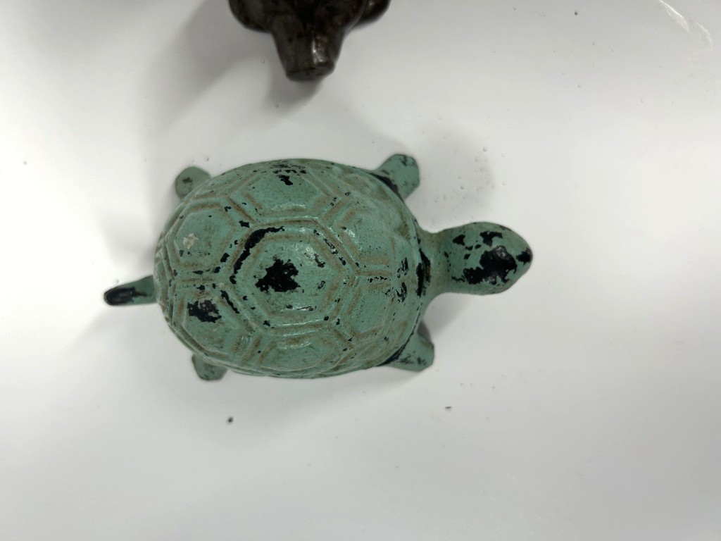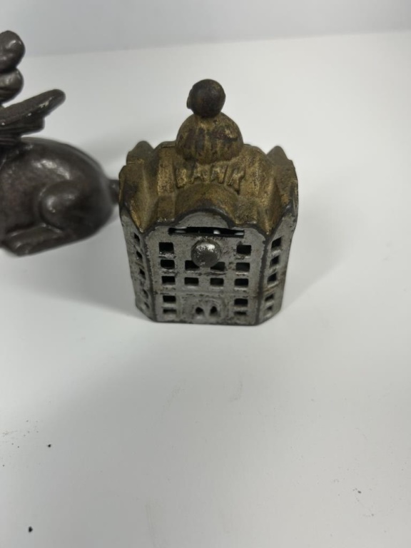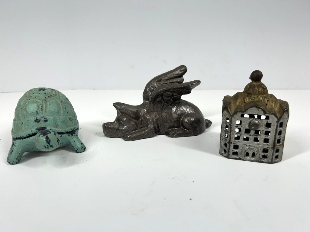 VINTAGE CAST IRON FLYING PIG, CAST IRON TURTLE AND CAST IRON BANK