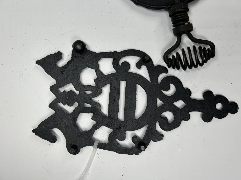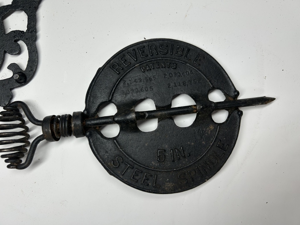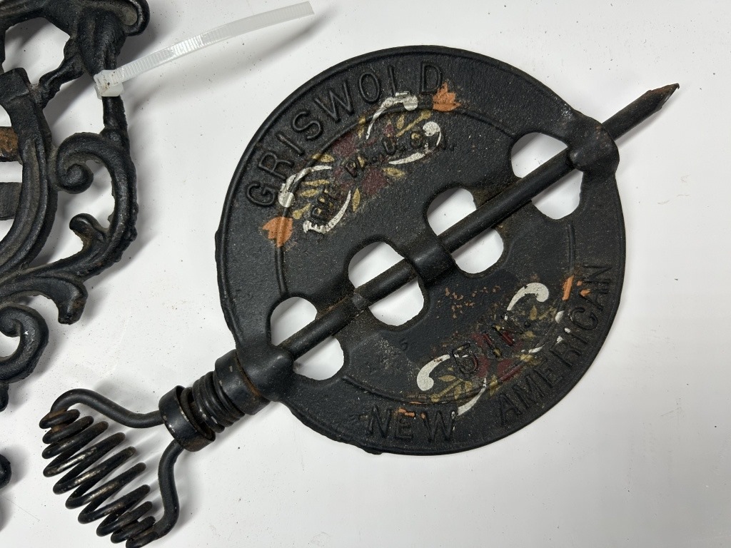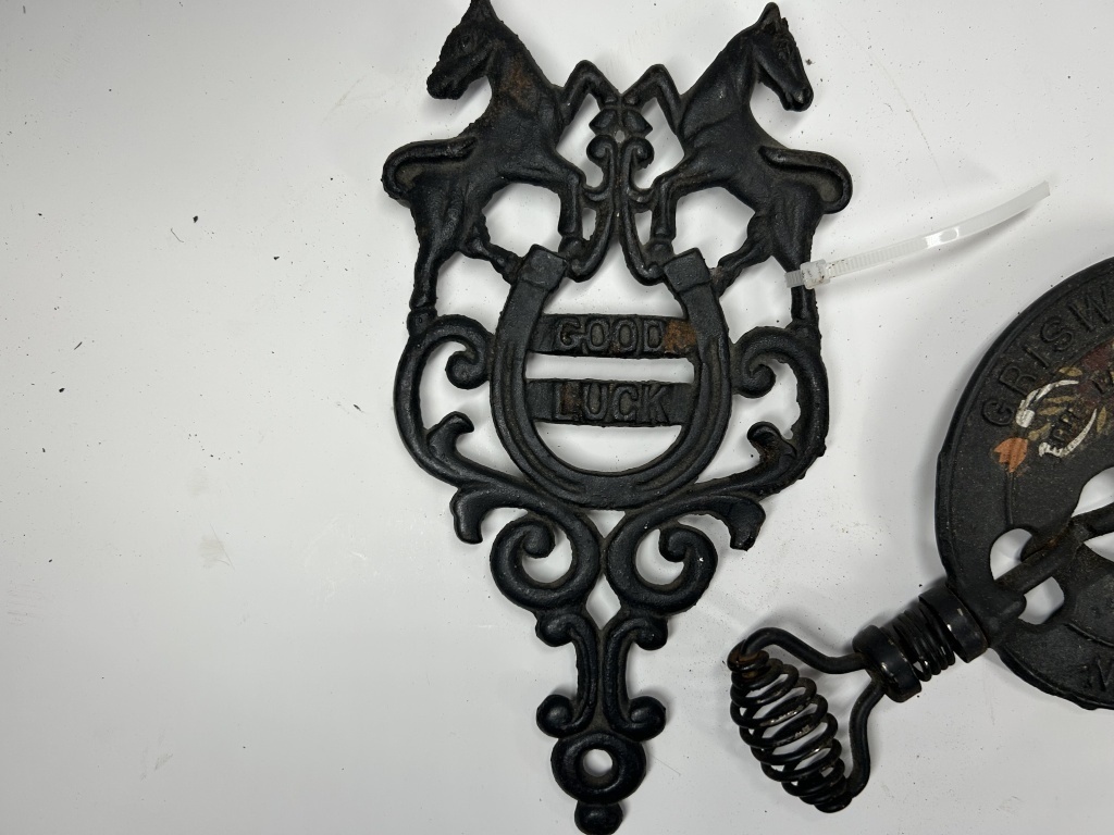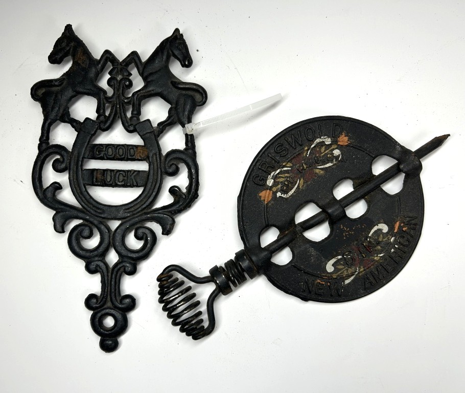 VINTAGE GRISWOLD CAST IRON STOVEPIPE DAMPER WITH REVERIBLE STEEL SPINDLE AND HORSESHOE TRIVET