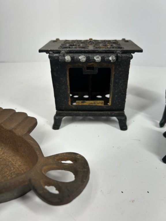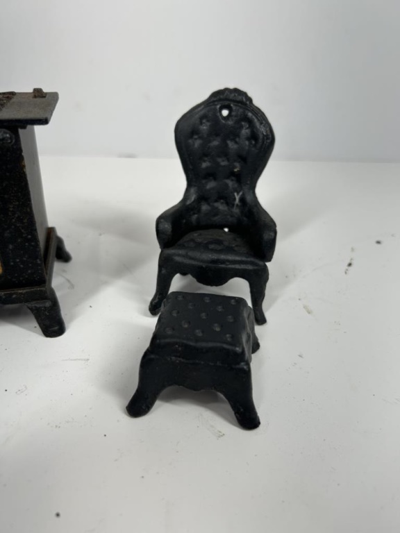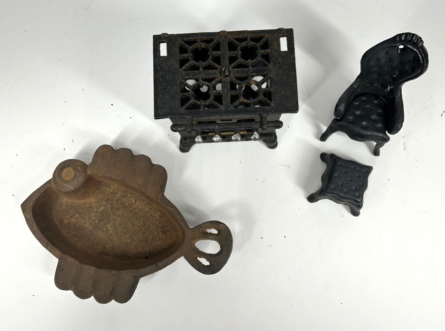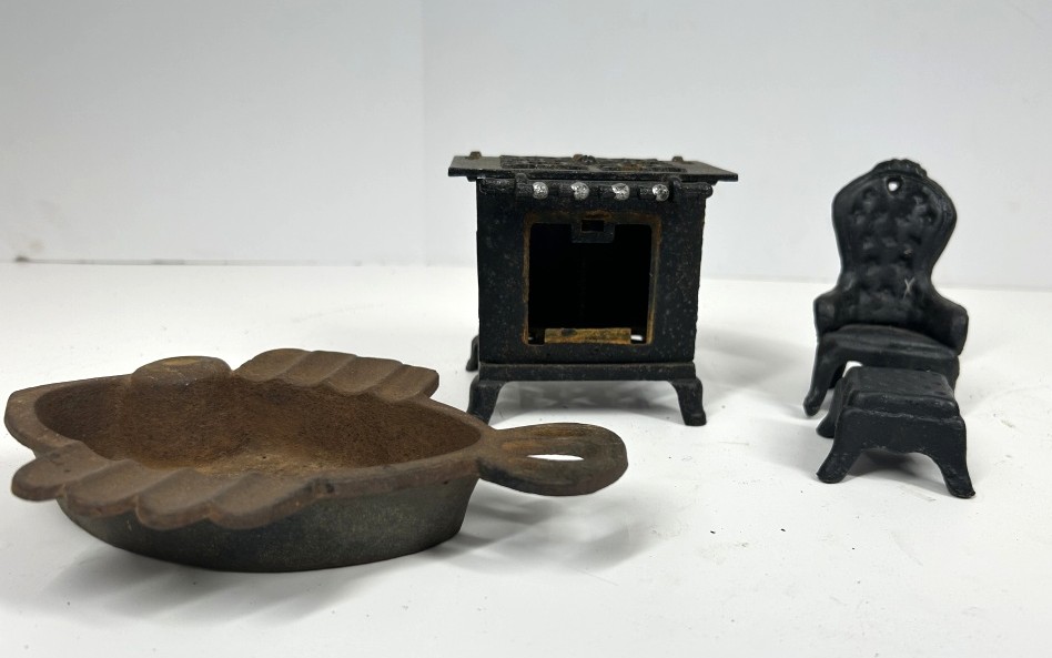 VINTAGE MINIATURE CAST IRON STOVE, CHAIR AND FOOT REST AND FISH PAN