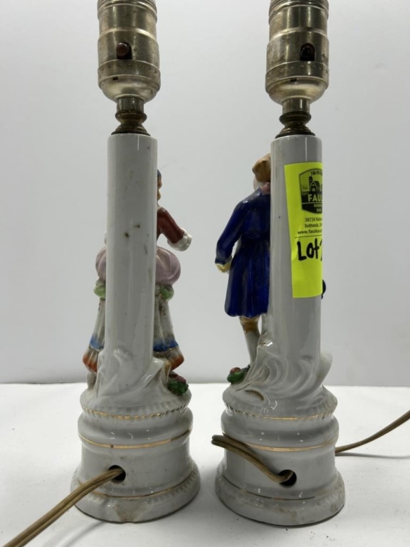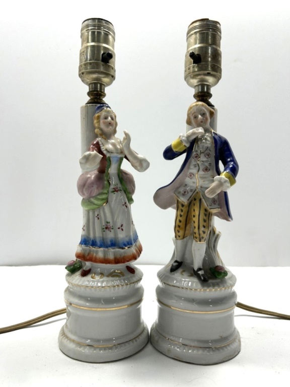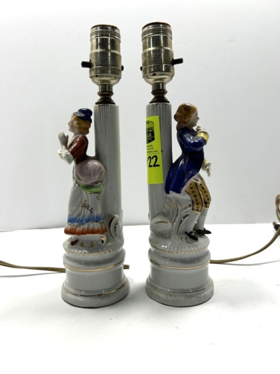 THIS SET OF TABLE LAMPS FEATURE FIGURES IN COLONIAL STYLE WITH GOLD TRIM. MANUFACTURED IN 1945