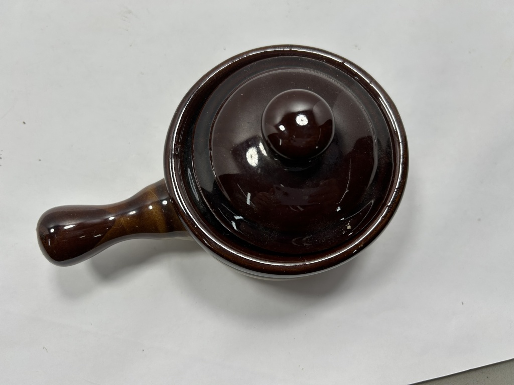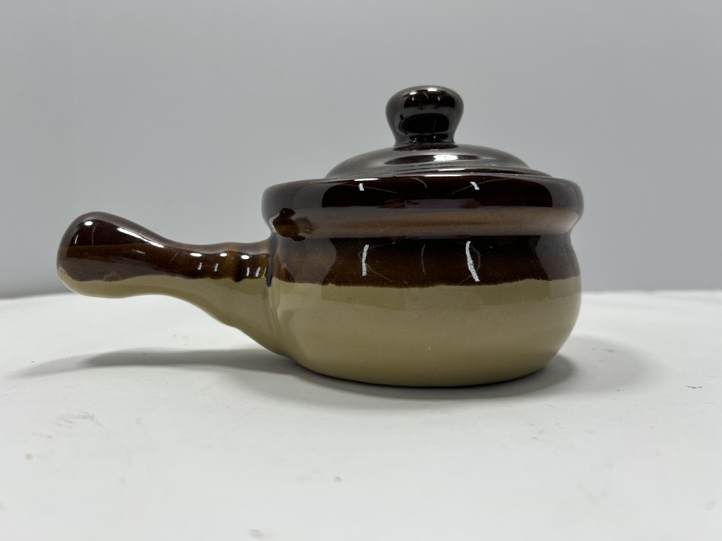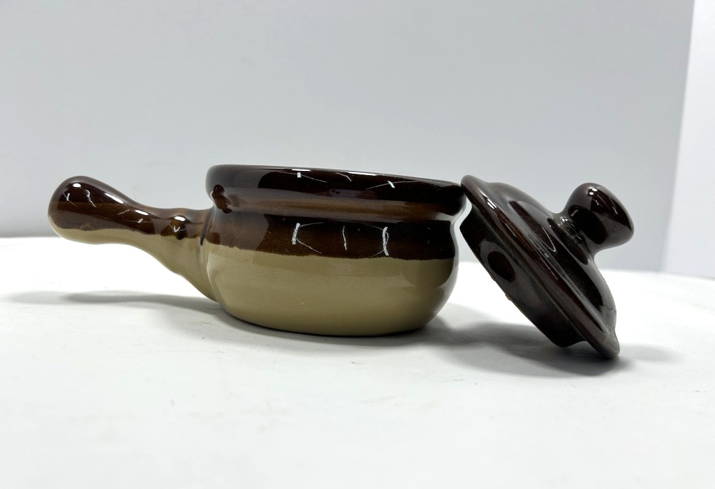 TWO TONE BROWN CROCK INCLUDING ROLLED RIM WITH MATCHING LID