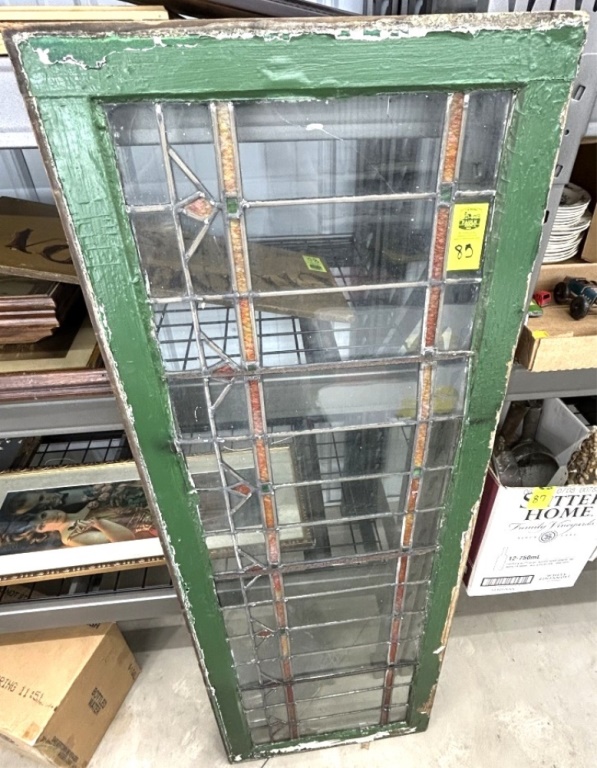 LEADED GLASS WINDOW WITH PANELS AND GREEN FRAME 60X22