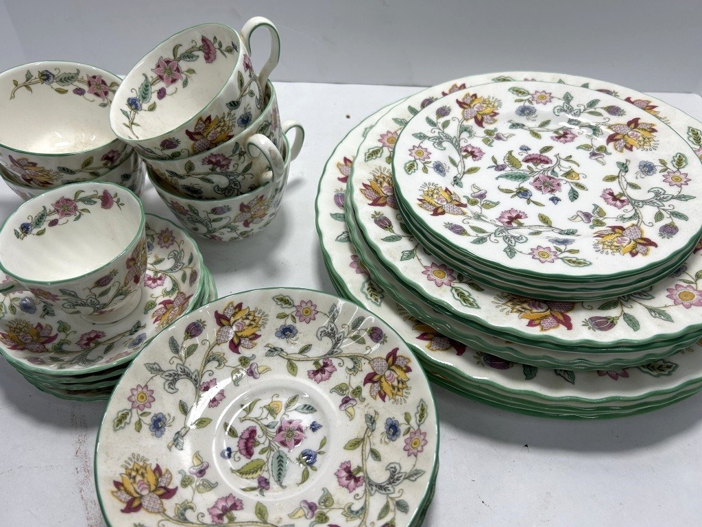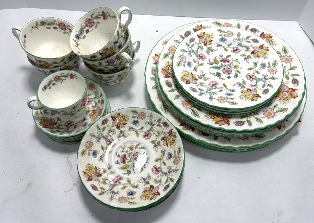 SET INCLUDES TEA CUPS, SAUCERS, AND PLATES IN MULTIPLE SIZES IN A FLORAL PATTERN