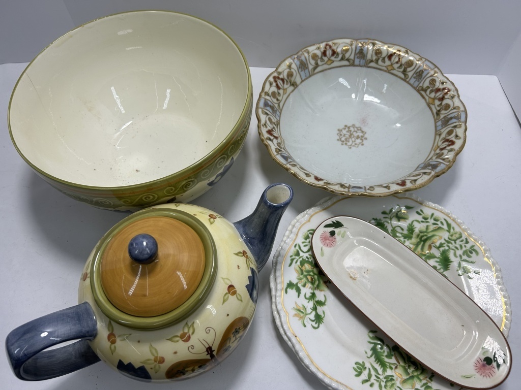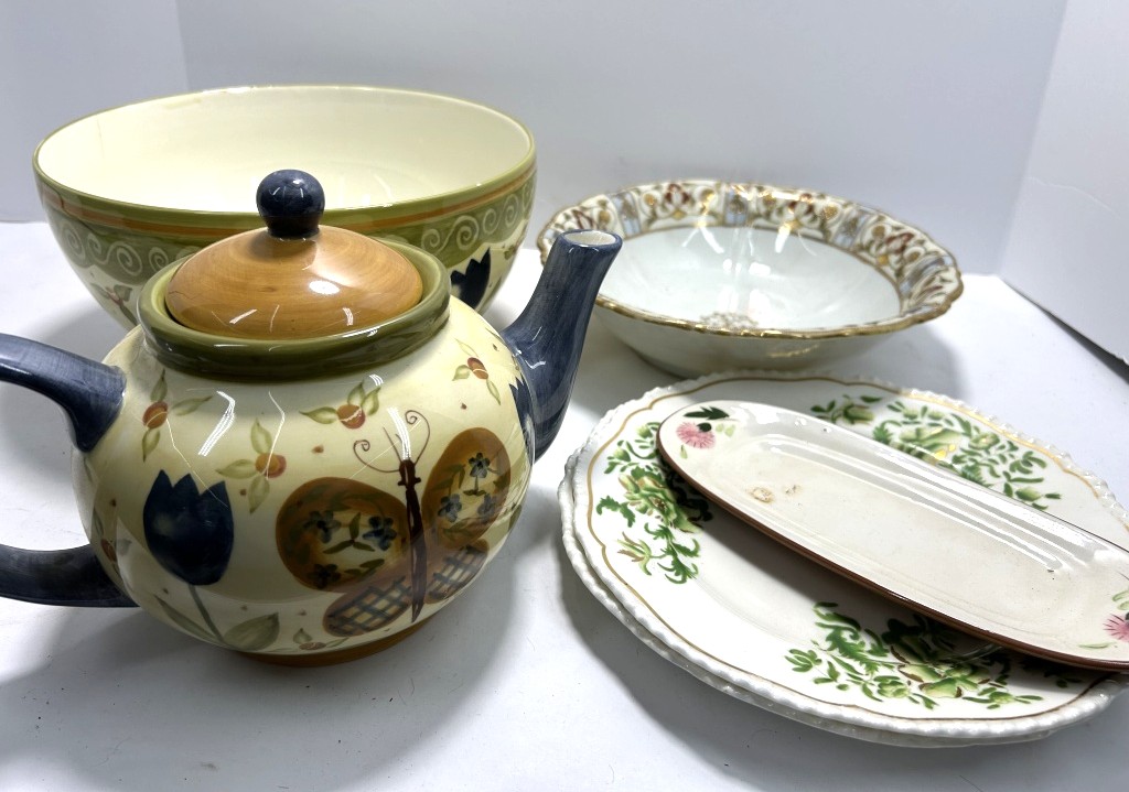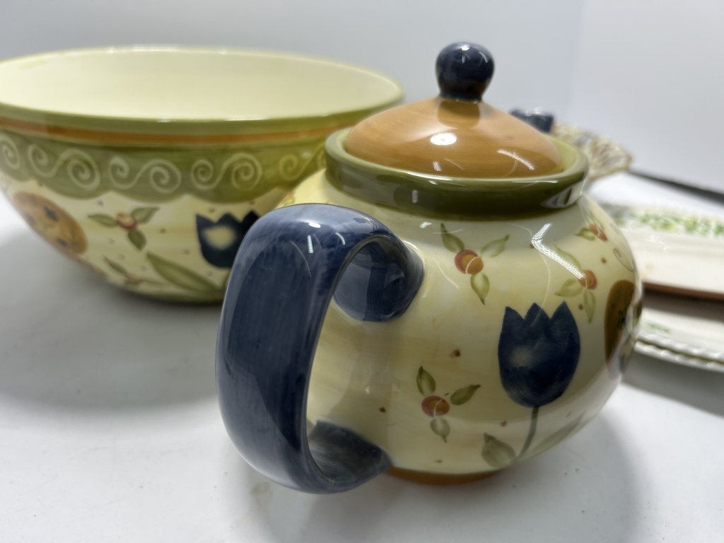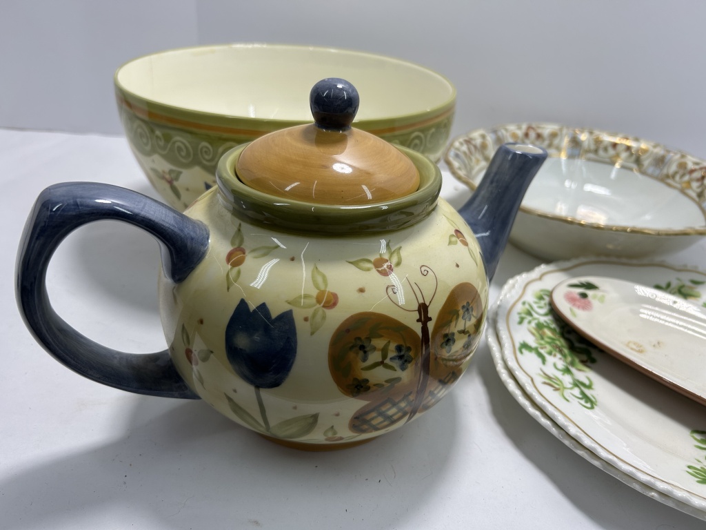 EARTHENWARE TEAPOT, FLORAL PLATES AND BOWLS