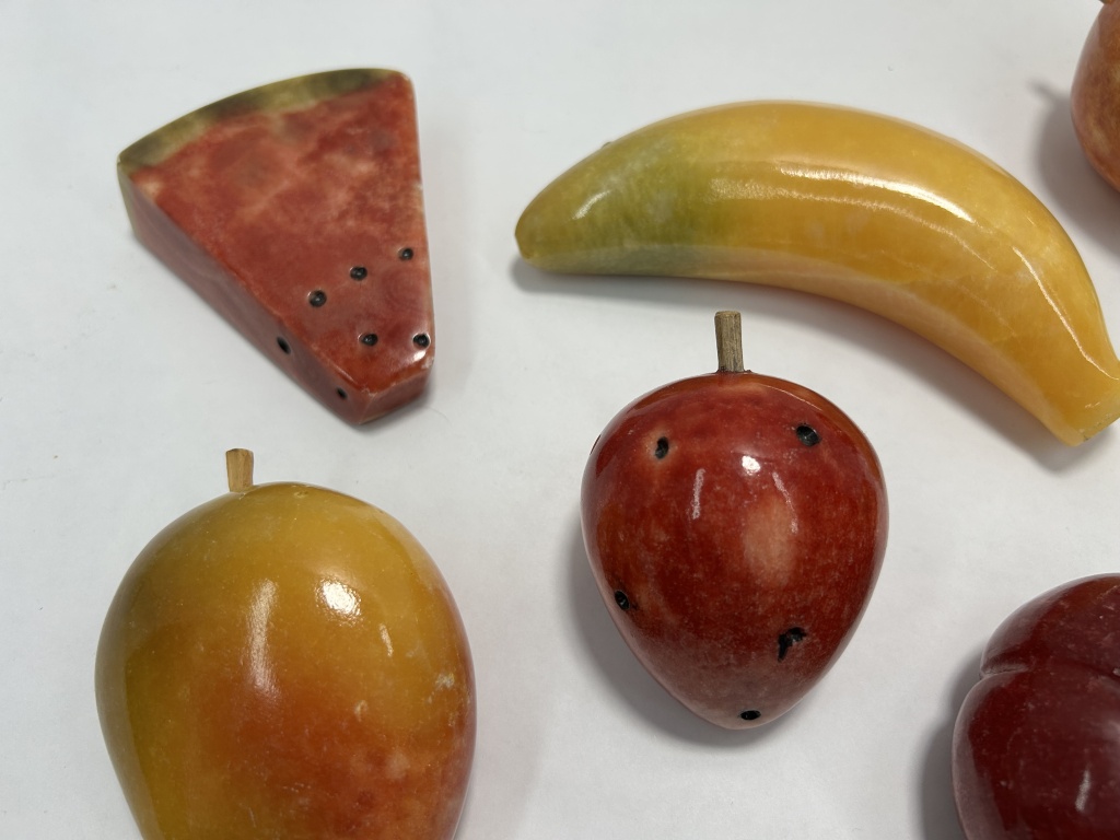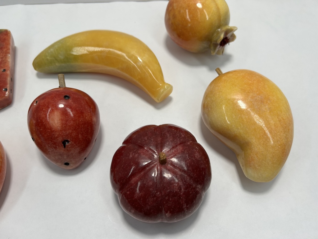 COLLECTION OF ALABASTER STONE FRUIT INCLUDING WATERMELON, BANANA, AND STRAWBERRY