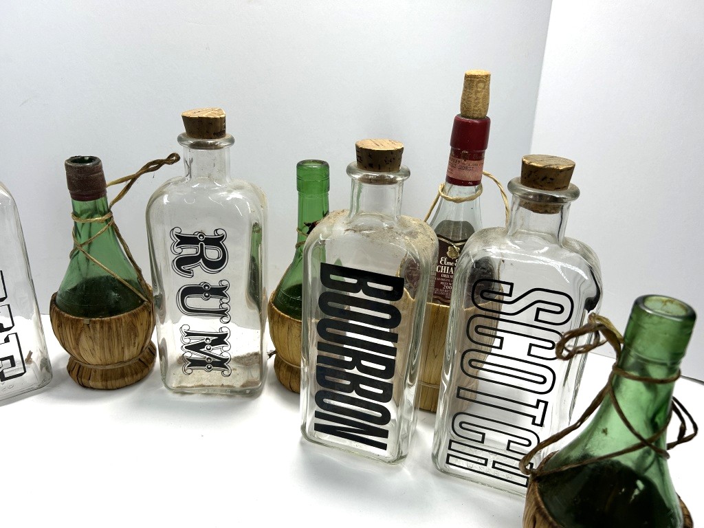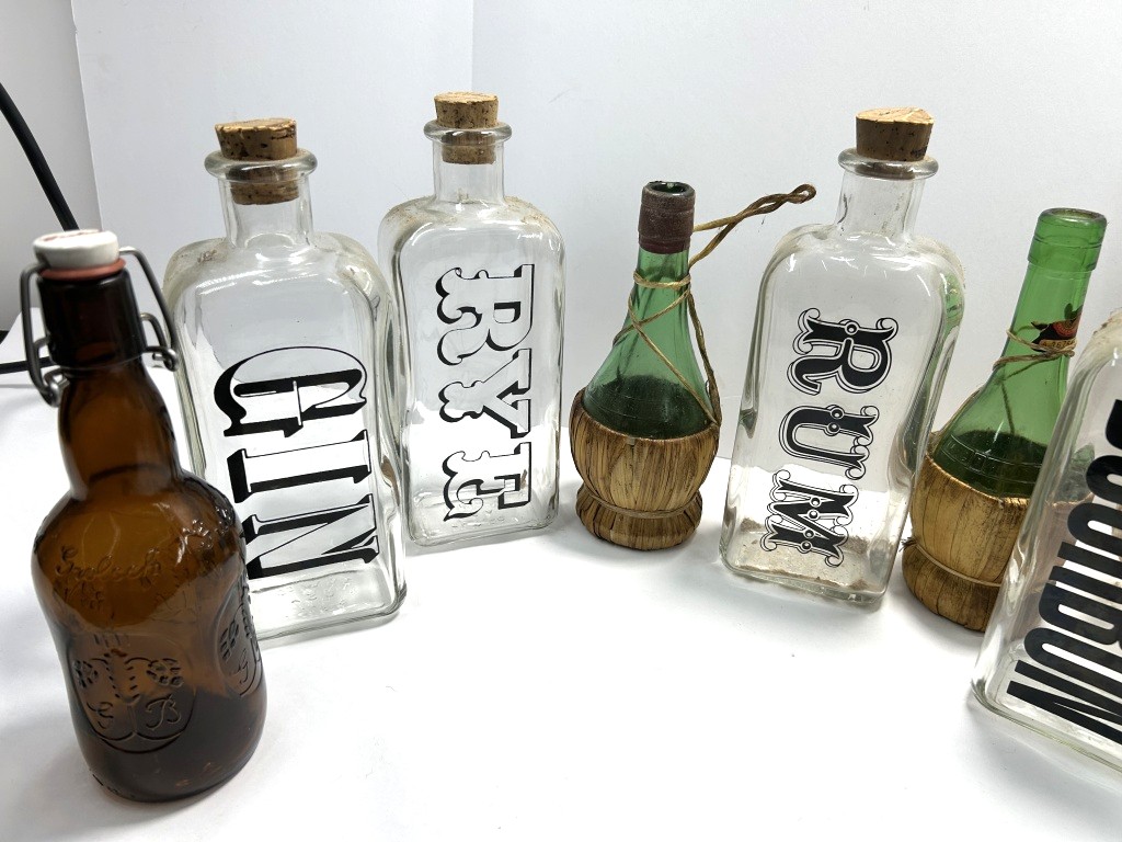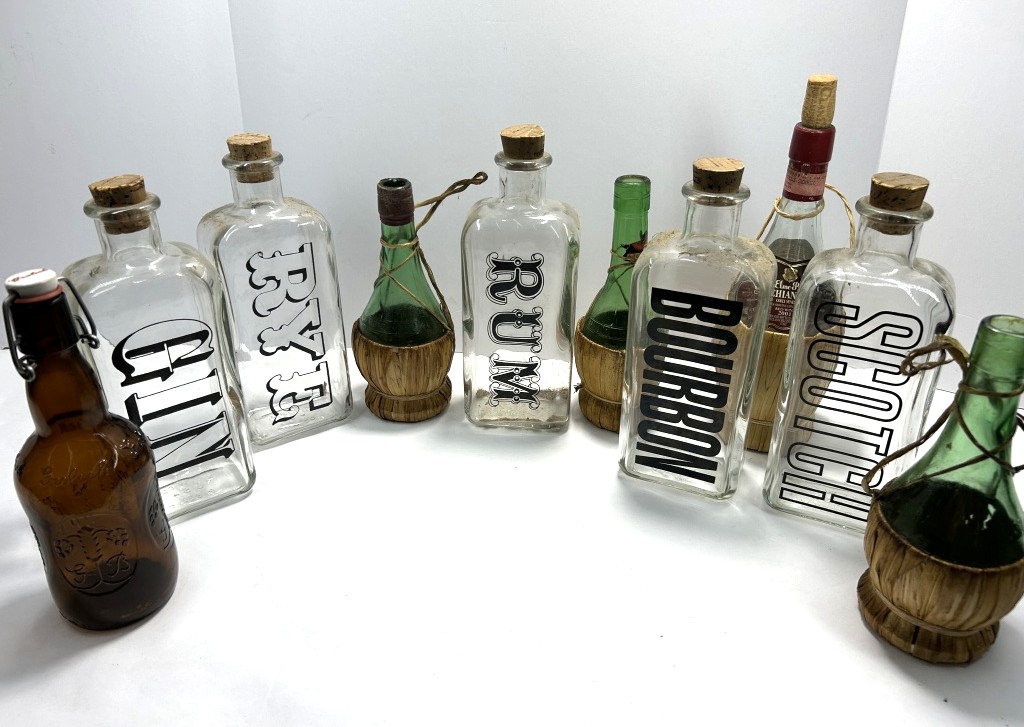 VINTAGE DECANTERS AND MISC GLASS BOTTLES