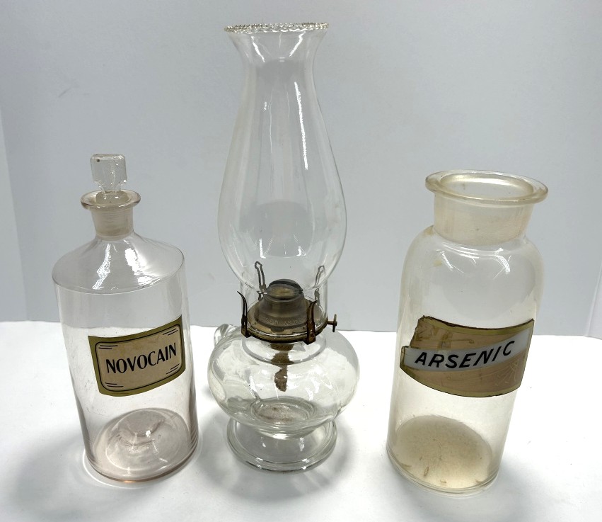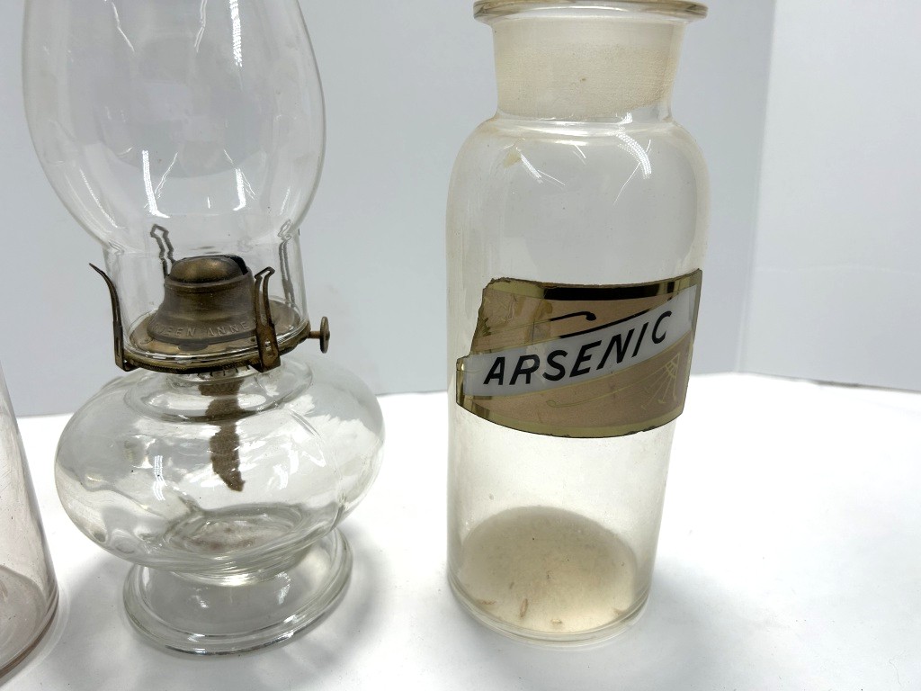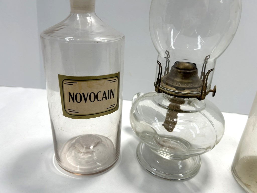 GLASS OIL LAMP AND VINTAGE APOTHECARY JARS
