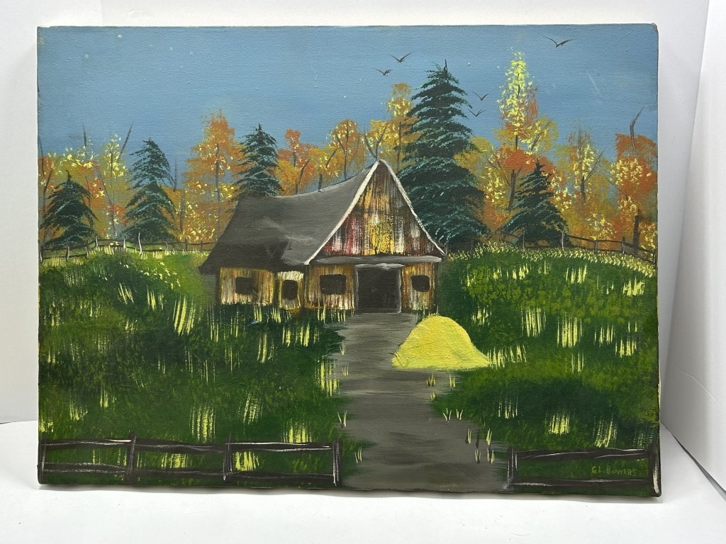 PAINTING OF A BARN WITH HAY OUTSIDE BY UNKNOWN ARTIST BOWERS