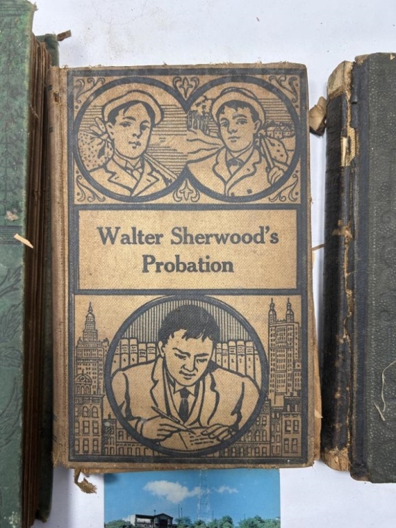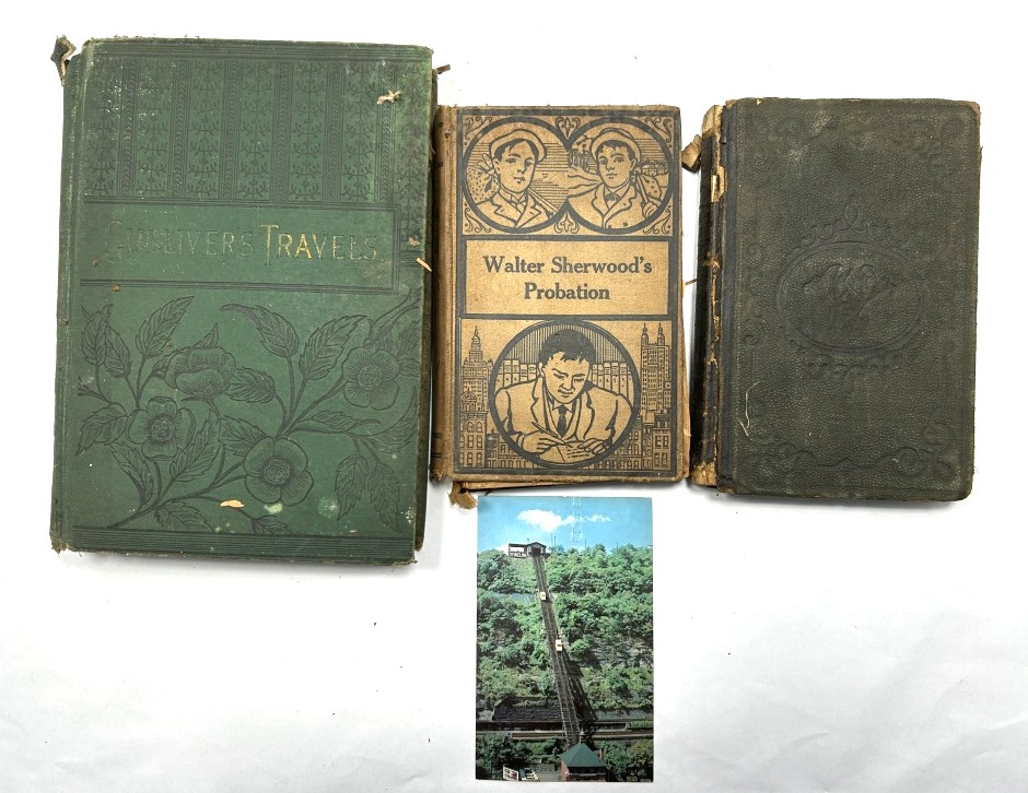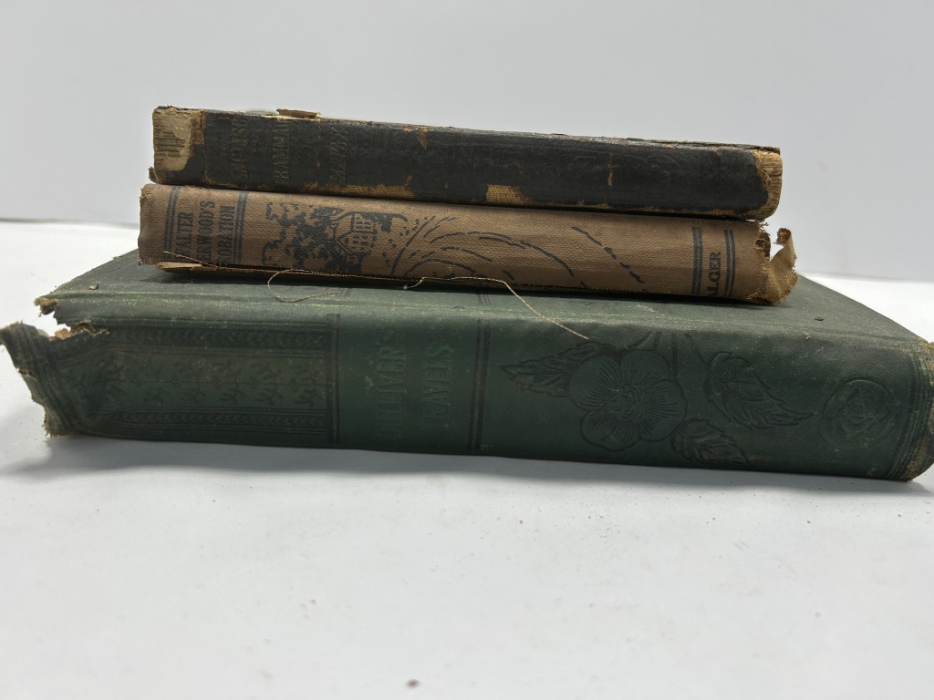 VINTAGE COPIES OF GULLIVER’S TRAVELS, WALTER SHERWOOD’S PROBATIONS AND PRACTICAL GRAMMAR FOR EVERY GRADE. ALL BOOKS HAVE DAMAGE TO SPINES